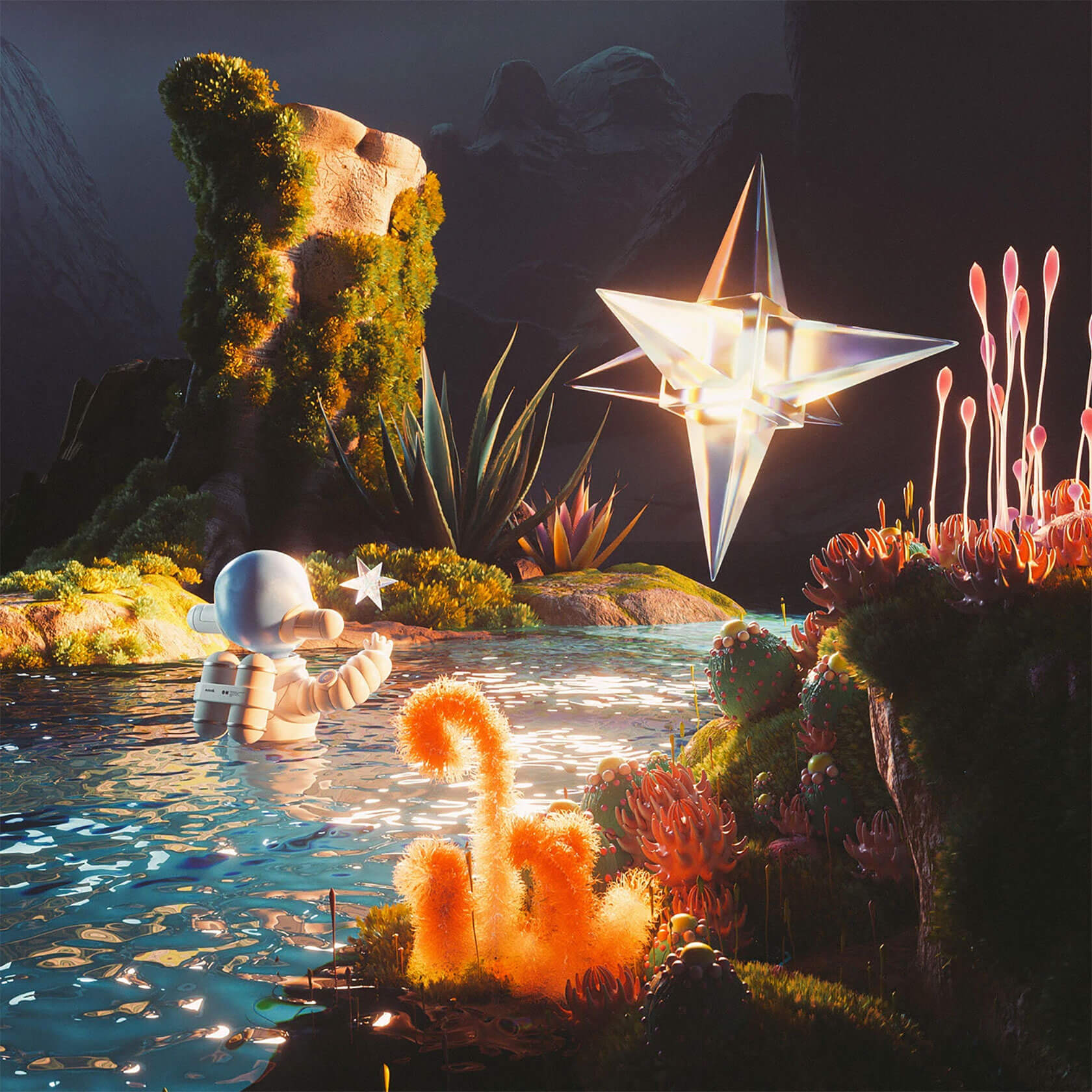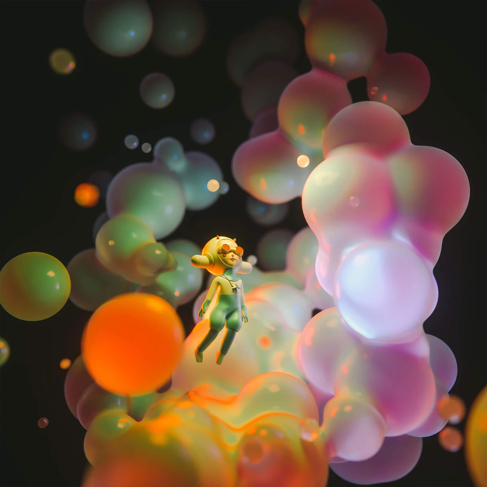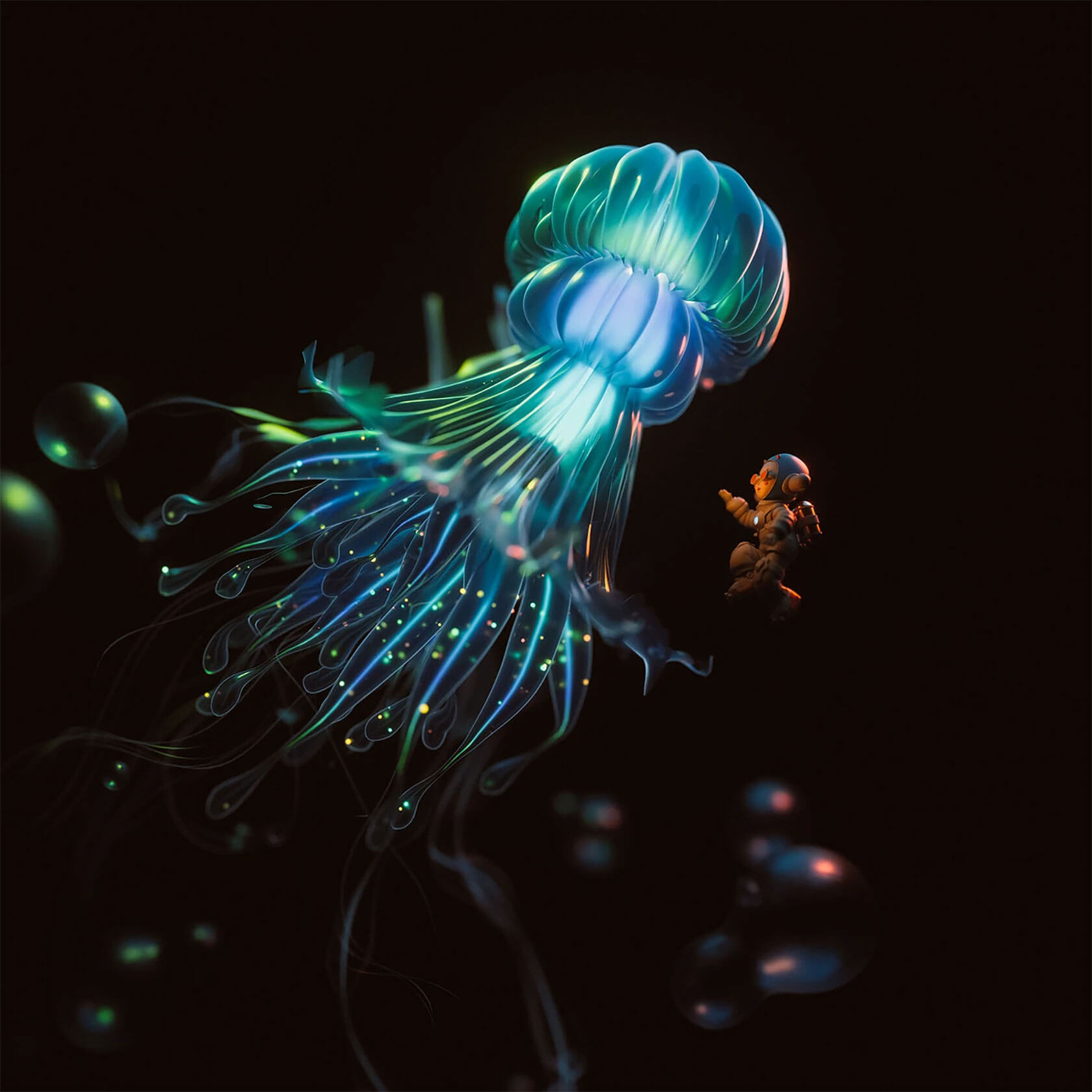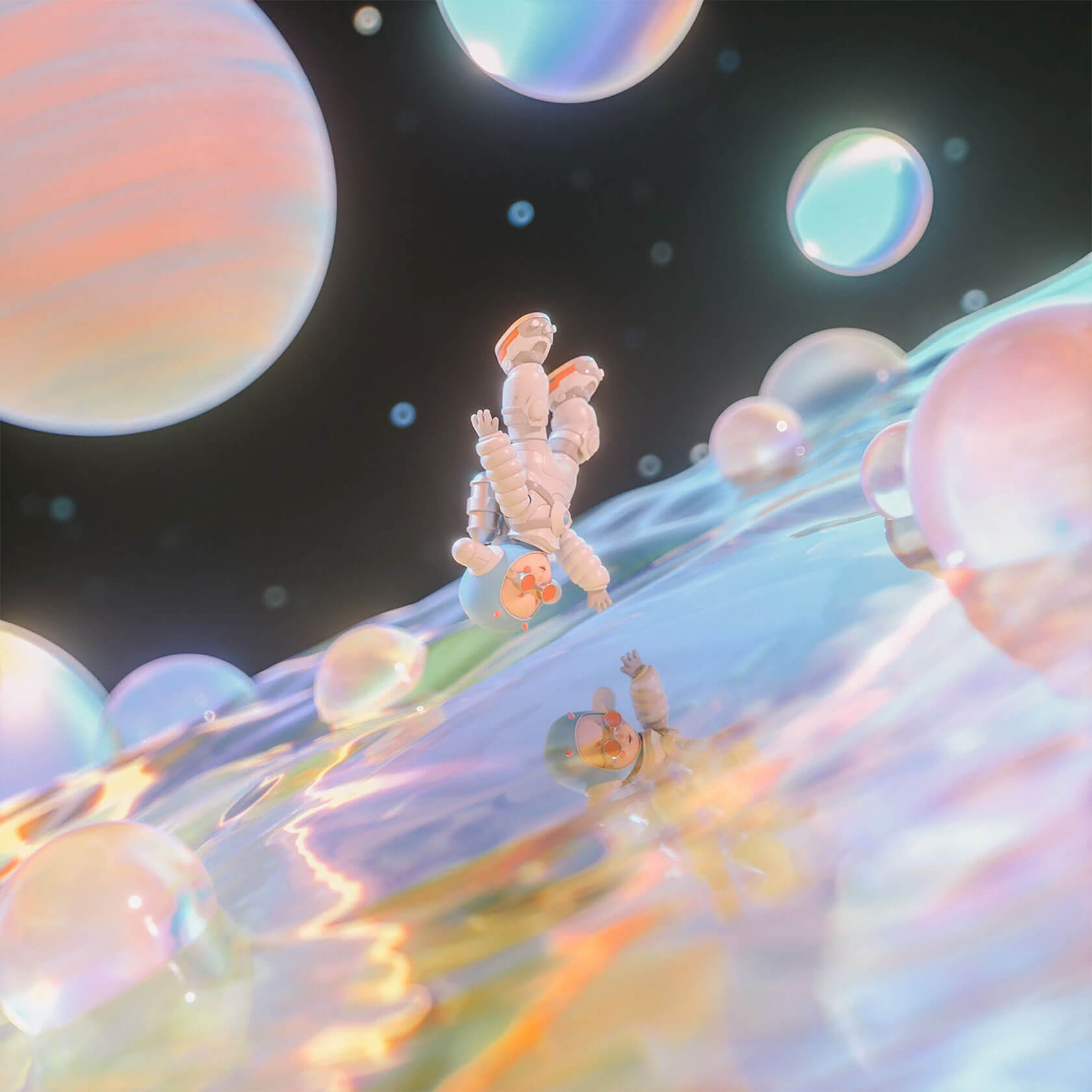 Rendered in 3D, the series blends cosmic wonder with childlike imagination, where glowing jellyfish drift through space, crystal stars hover over neon waters, and soft pastel planets reflect endless light.