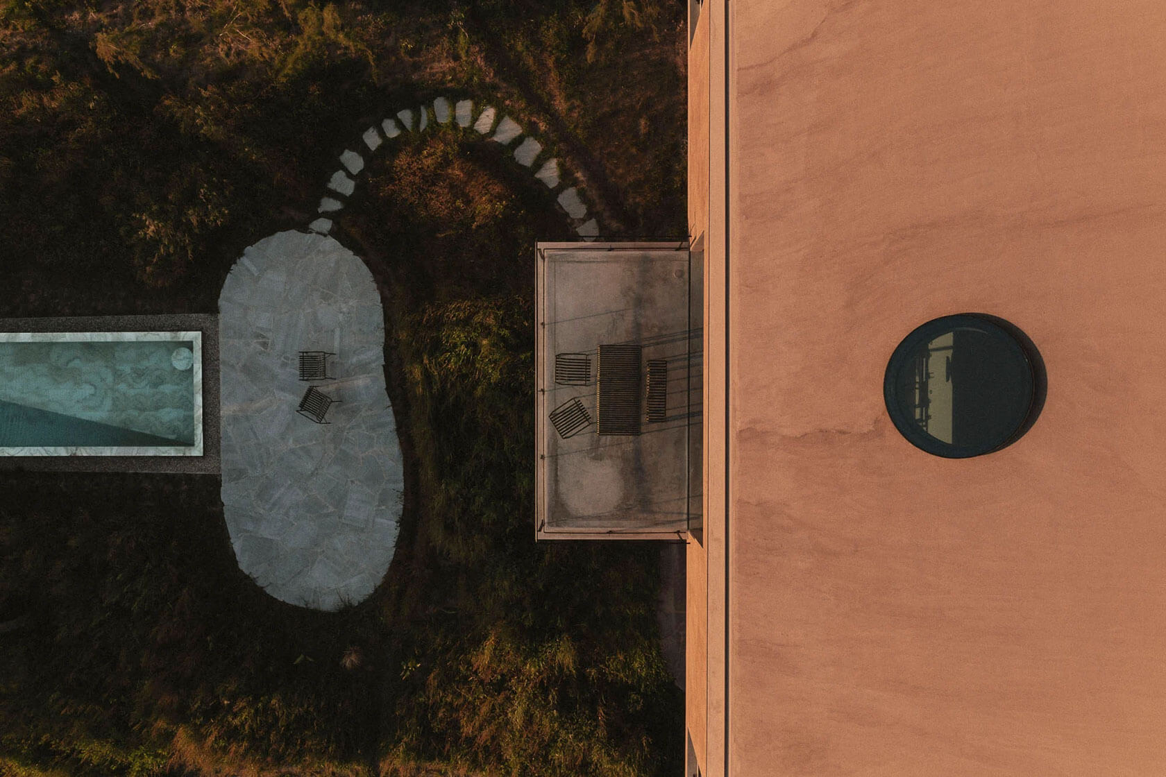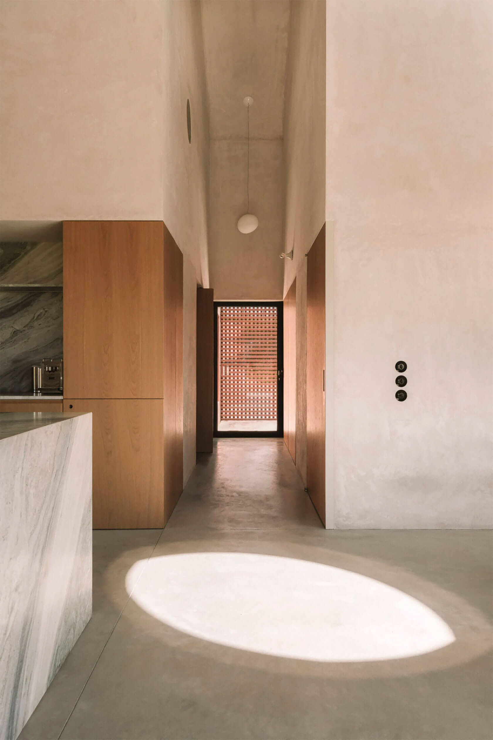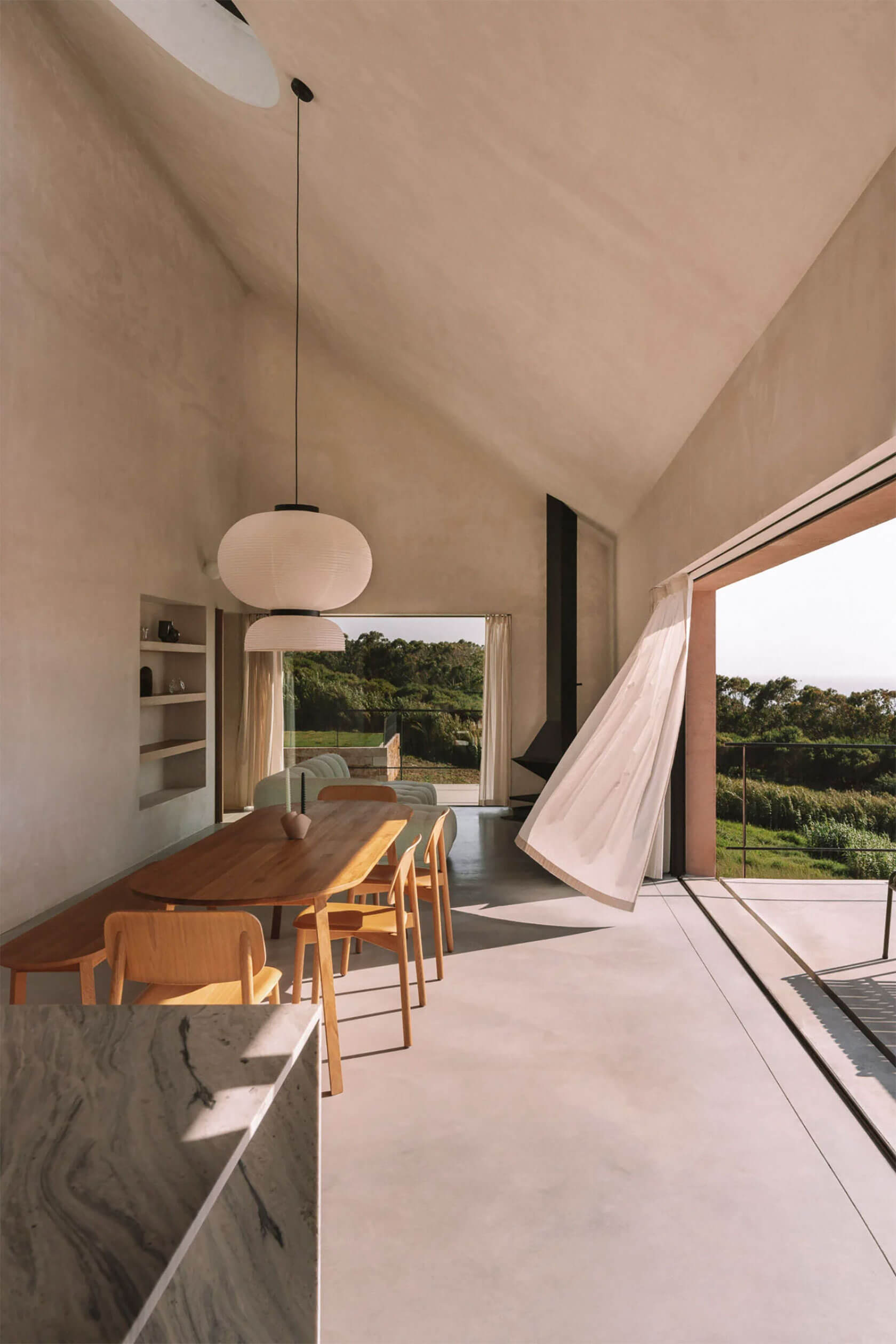 Inside, the palette remains gentle and tactile. Polished plaster walls, pale stone floors and light timber cabinetry create a calm backdrop for the play of shadow and sun. A circular skylight introduces a drifting pool of daylight that moves across the rooms throughout the day, reinforcing the project’s slow, contemplative rhythm. Beyond the main structure, a long pool stretches toward the tree line, mirroring the horizon and extending the home’s connection with nature. It all adds up to a serene coastal hideaway where time seems to loosen, and where architecture amplifies the beauty of its surroundings.