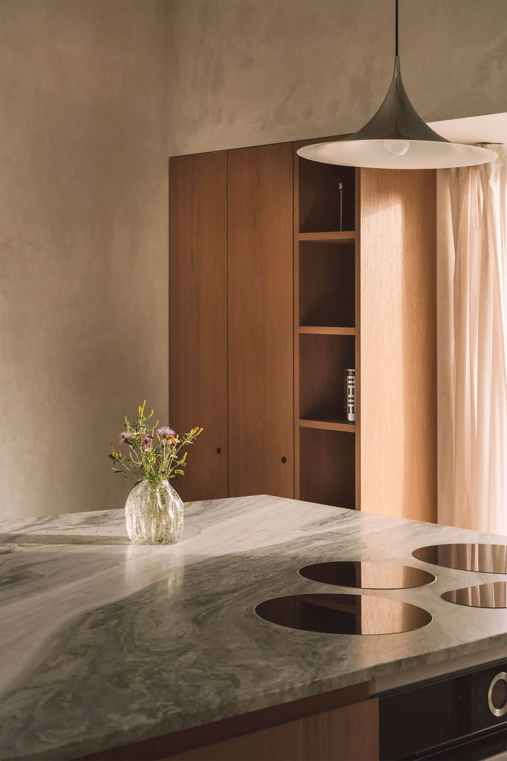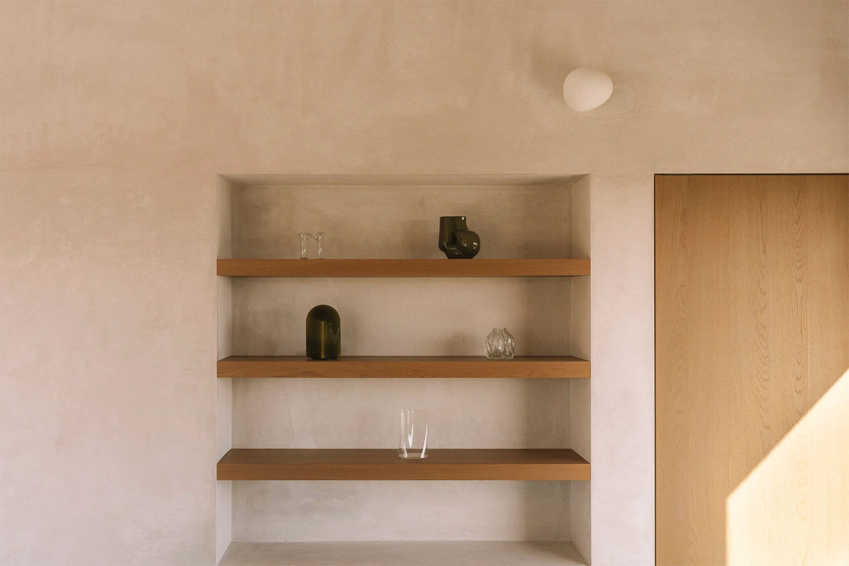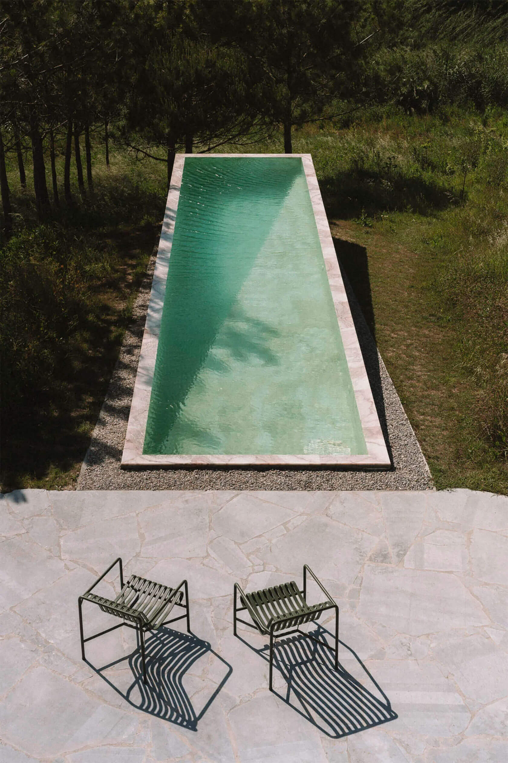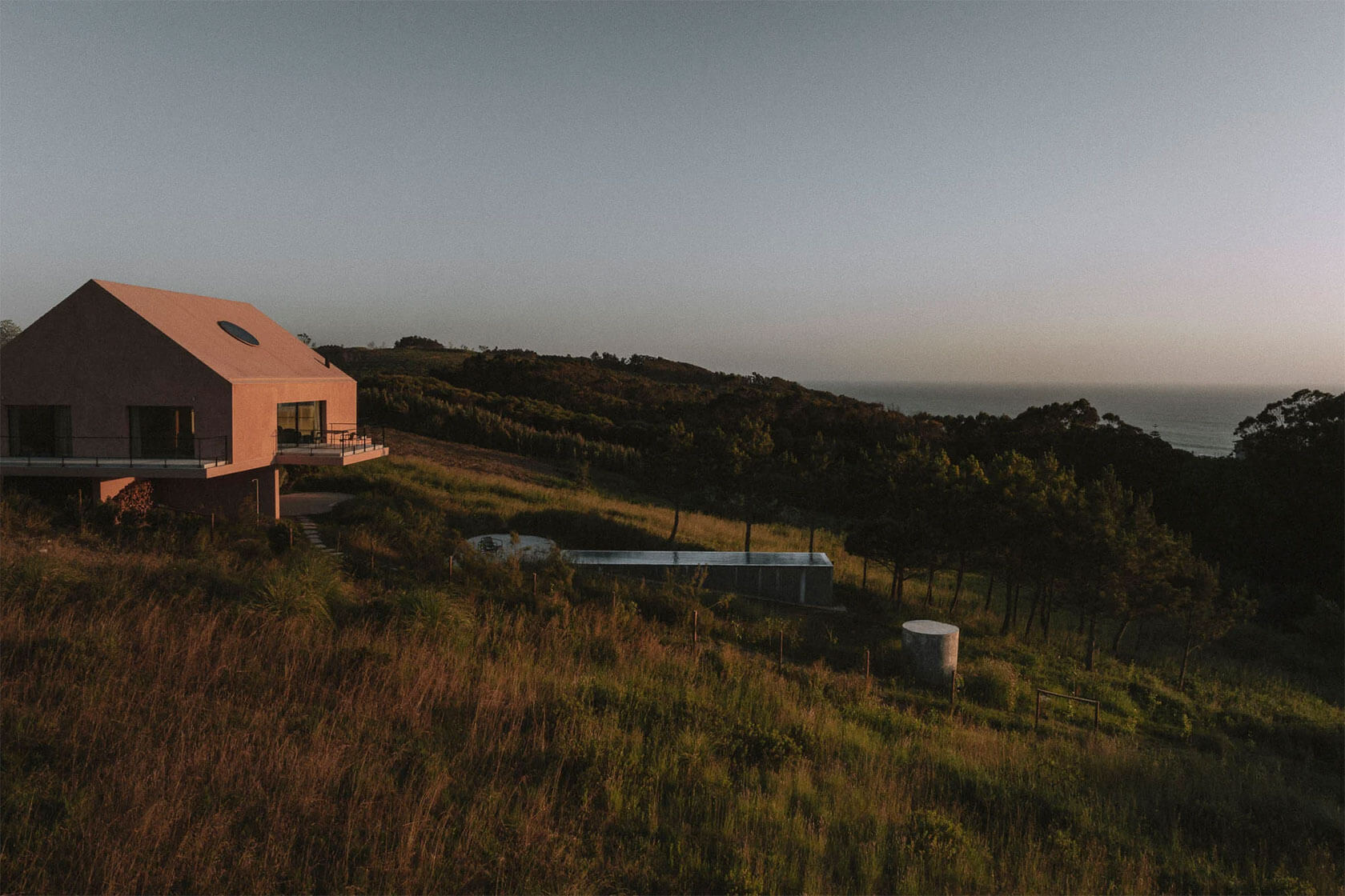 Inside, the palette remains gentle and tactile. Polished plaster walls, pale stone floors and light timber cabinetry create a calm backdrop for the play of shadow and sun. A circular skylight introduces a drifting pool of daylight that moves across the rooms throughout the day, reinforcing the project’s slow, contemplative rhythm. Beyond the main structure, a long pool stretches toward the tree line, mirroring the horizon and extending the home’s connection with nature. It all adds up to a serene coastal hideaway where time seems to loosen, and where architecture amplifies the beauty of its surroundings.