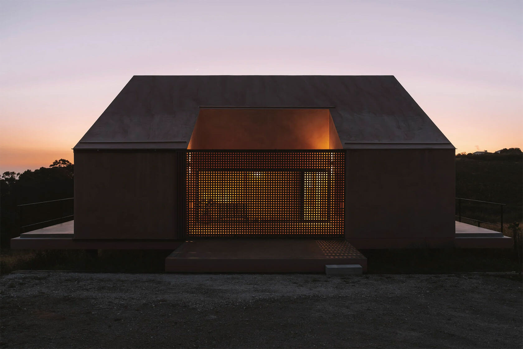 The house presents a simple gabled profile, but extrastudio uses subtle shifts in volume and texture to give it a quiet complexity. A perforated timber screen forms a sheltered entry, casting patterned light across the courtyard and interiors. From the living spaces, large sliding openings frame sweeping views of the Atlantic and pull the soft coastal breeze straight into the heart of the home.