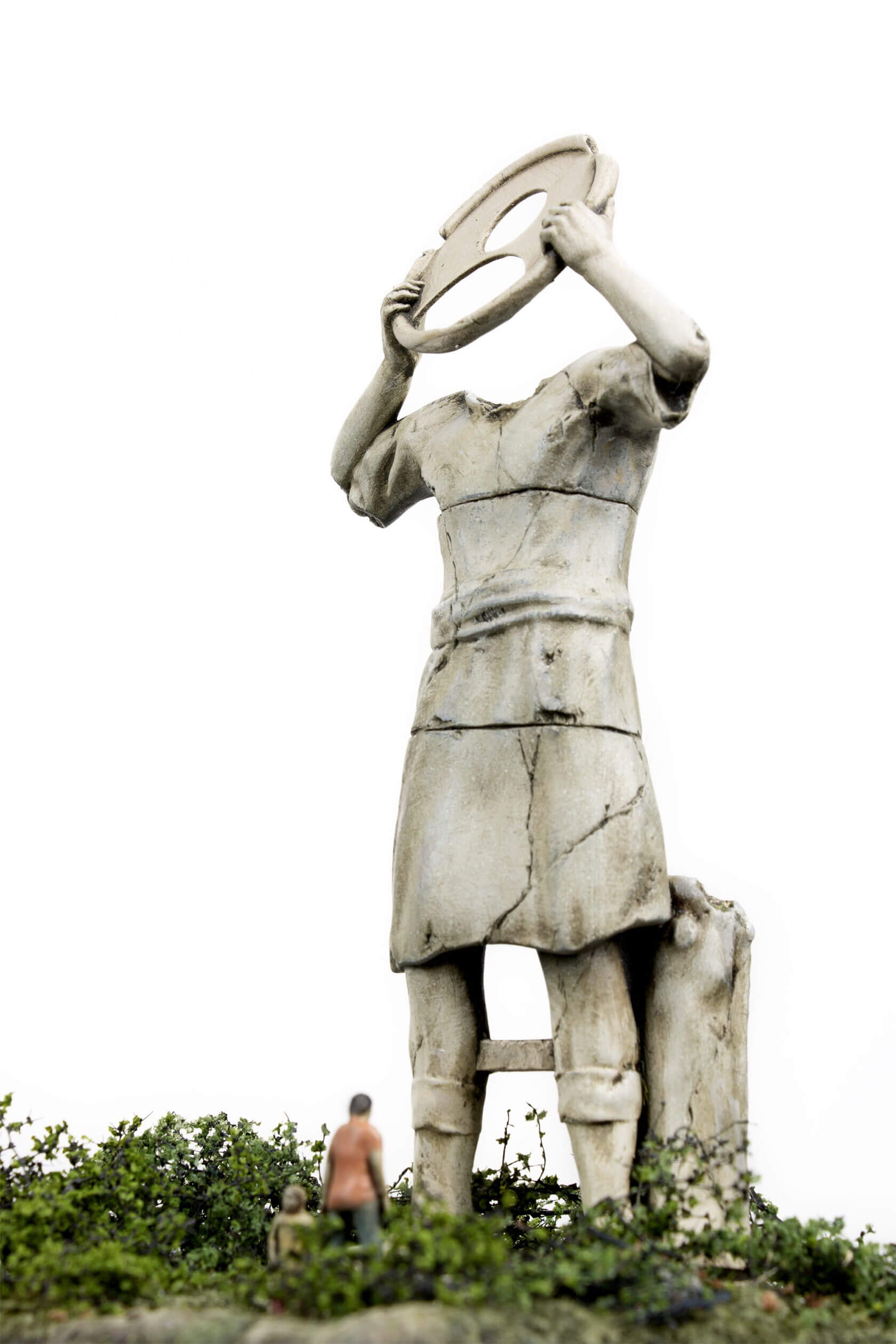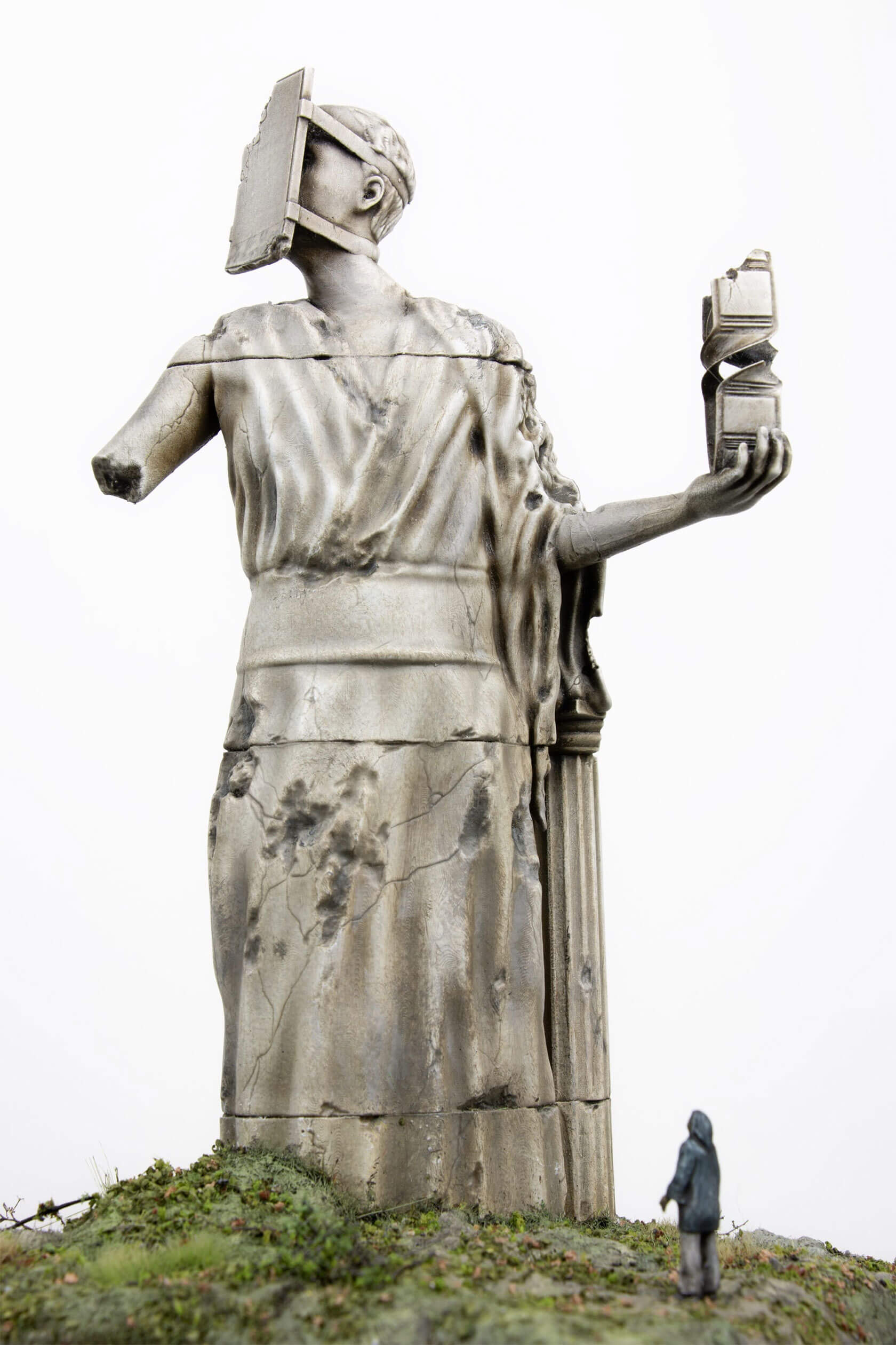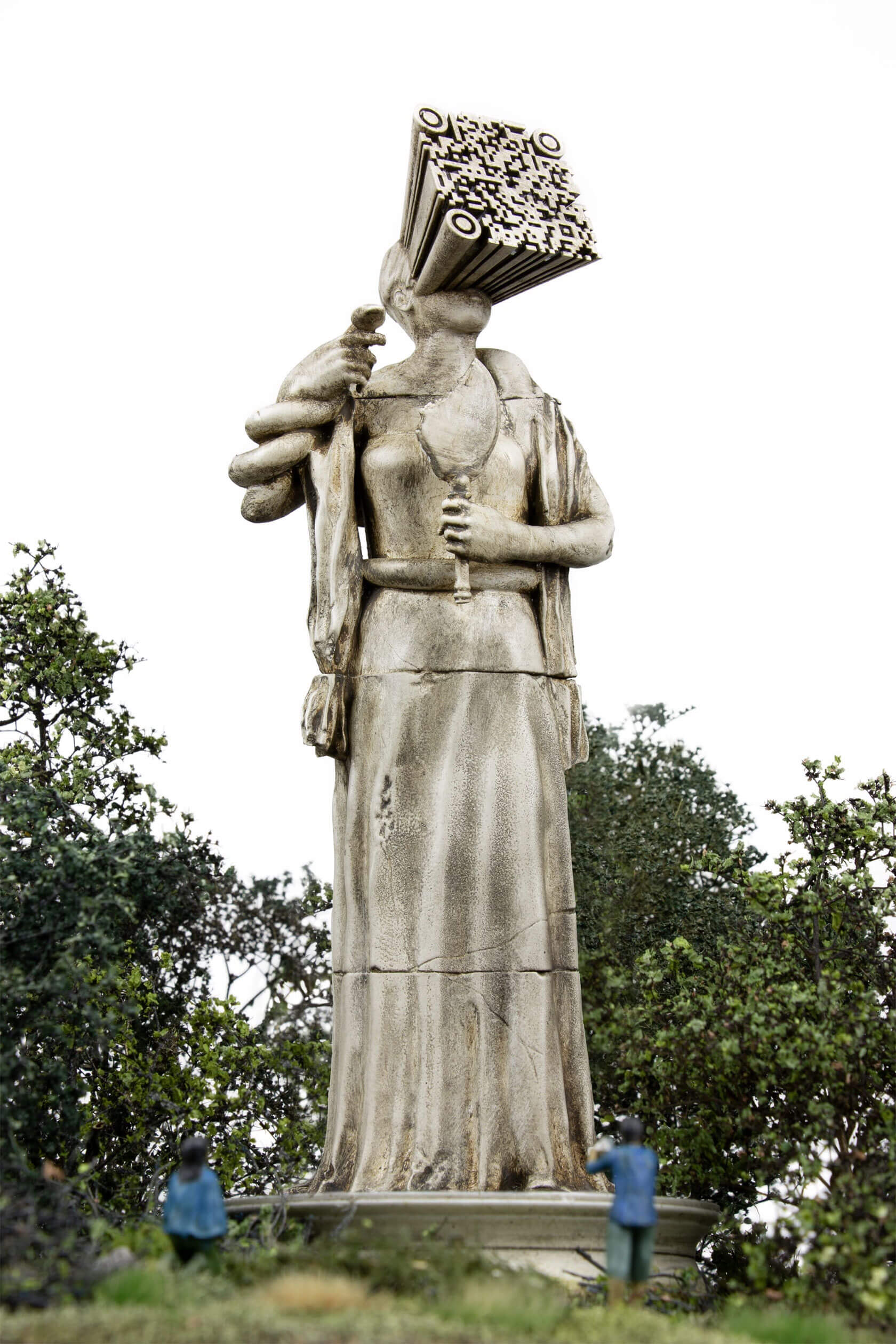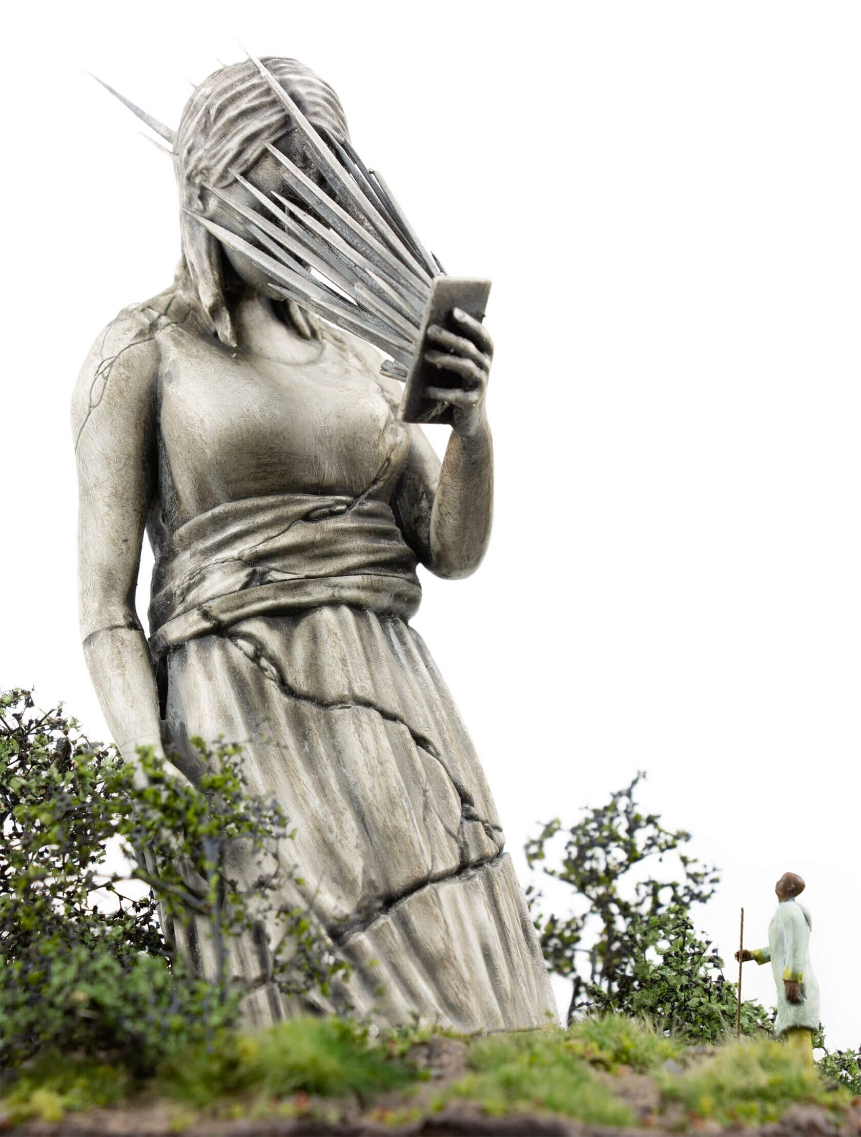 The works take the form of weathered, classical-style sculptures scattered across tiny landscapes, each one embodying a digital concept that has shaped our era. Figures stare into handheld devices that pierce their faces with beams of light, raise Wi-Fi symbols like sacred offerings, or bear heads transformed into scannable codes. Titles like Infinite Scroll, Clickthrough Rate and Bad Gateway hint at the everyday systems we take for granted, and how they might become future myths, cautionary tales or objects of worship.
