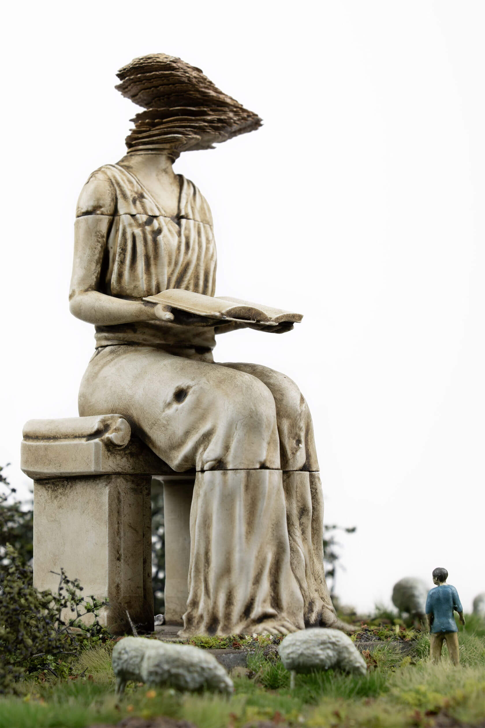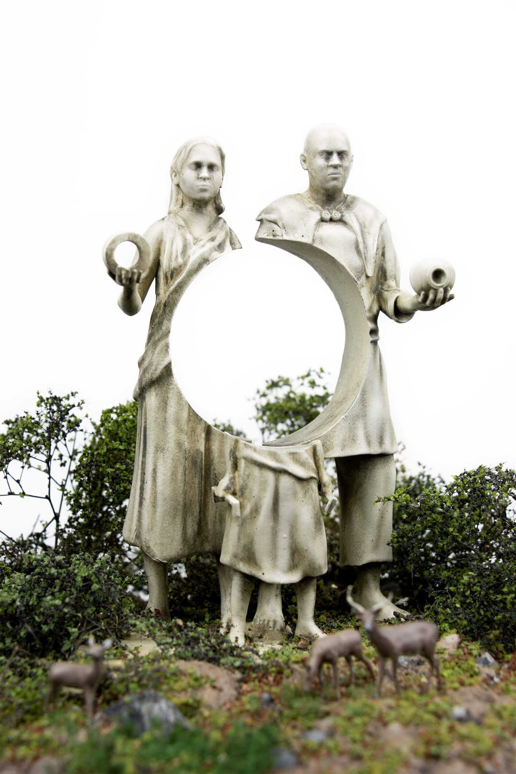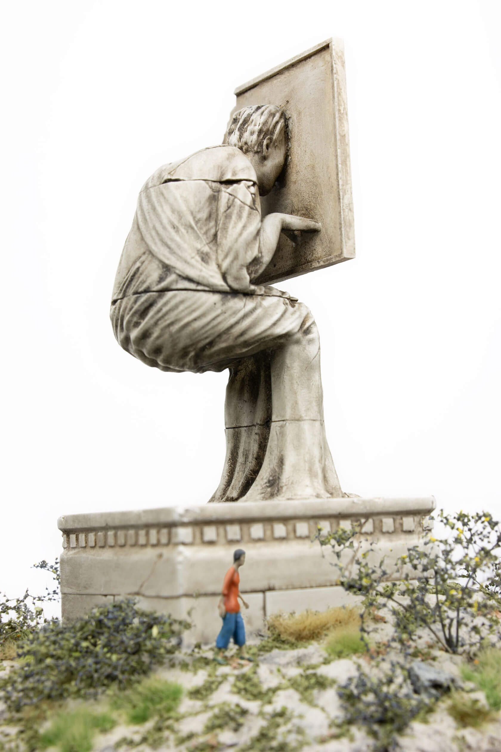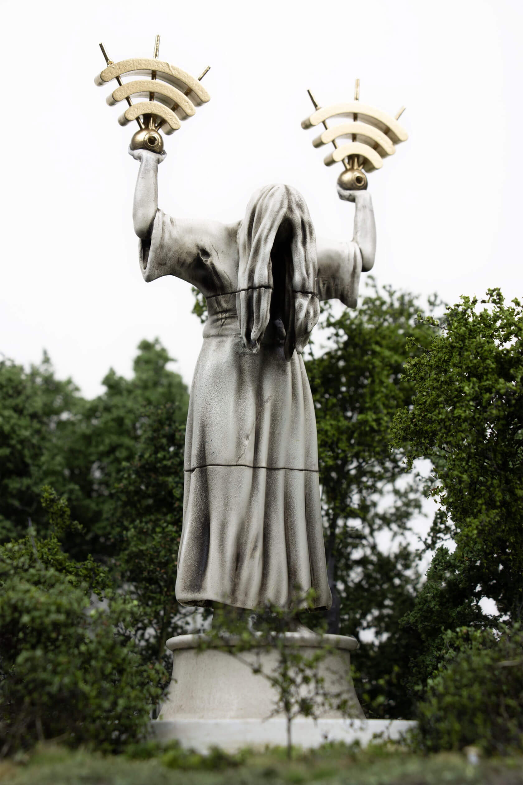 The works take the form of weathered, classical-style sculptures scattered across tiny landscapes, each one embodying a digital concept that has shaped our era. Figures stare into handheld devices that pierce their faces with beams of light, raise Wi-Fi symbols like sacred offerings, or bear heads transformed into scannable codes. Titles like Infinite Scroll, Clickthrough Rate and Bad Gateway hint at the everyday systems we take for granted, and how they might become future myths, cautionary tales or objects of worship.