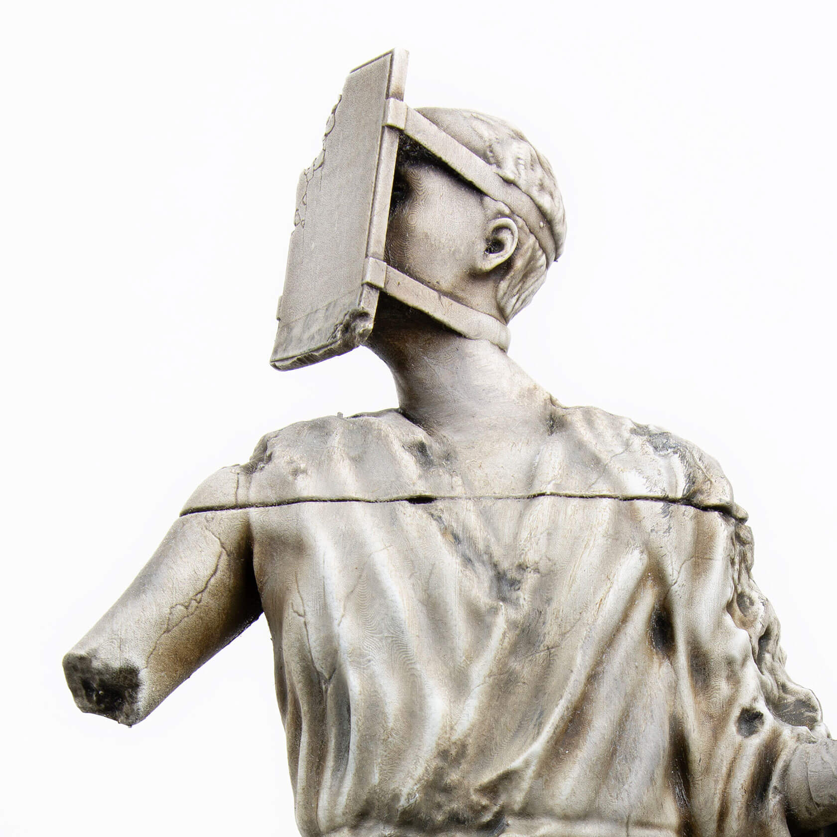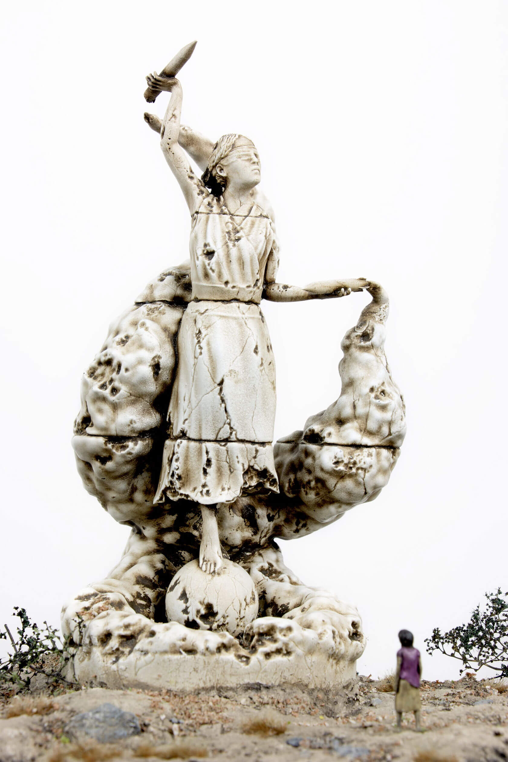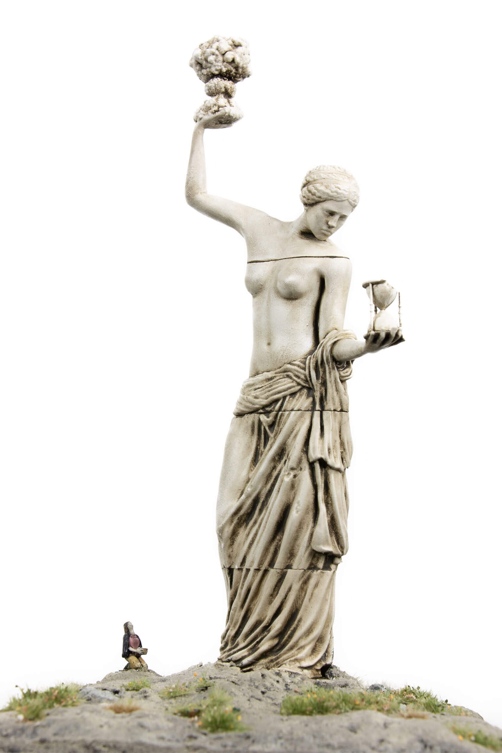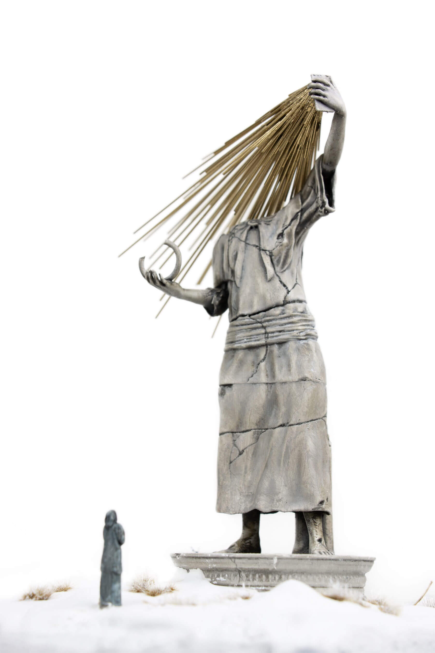 The works take the form of weathered, classical-style sculptures scattered across tiny landscapes, each one embodying a digital concept that has shaped our era. Figures stare into handheld devices that pierce their faces with beams of light, raise Wi-Fi symbols like sacred offerings, or bear heads transformed into scannable codes. Titles like Infinite Scroll, Clickthrough Rate and Bad Gateway hint at the everyday systems we take for granted, and how they might become future myths, cautionary tales or objects of worship.