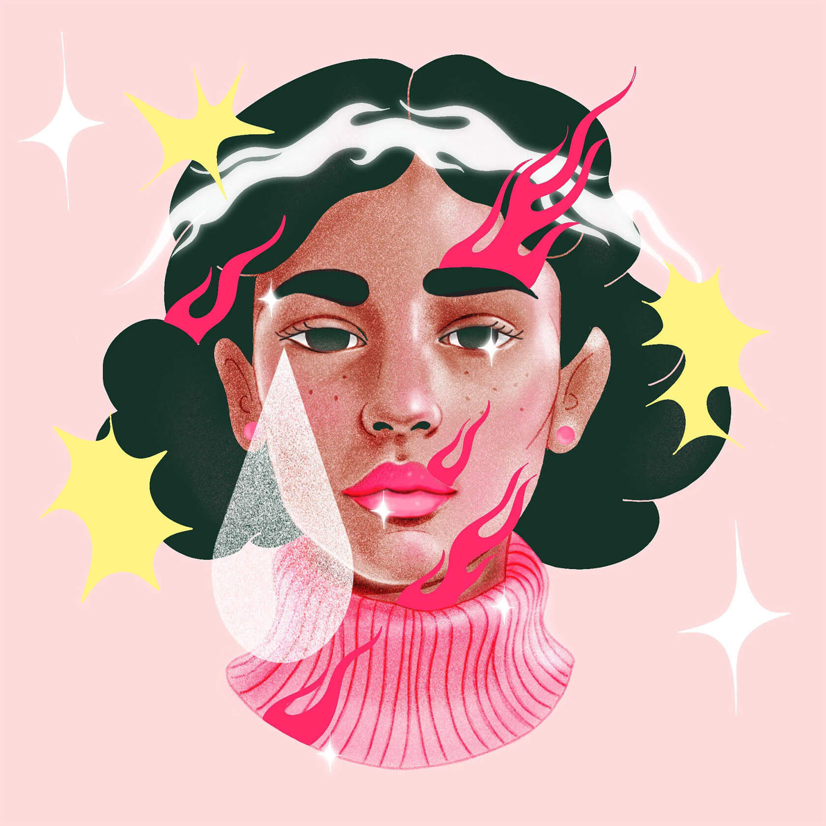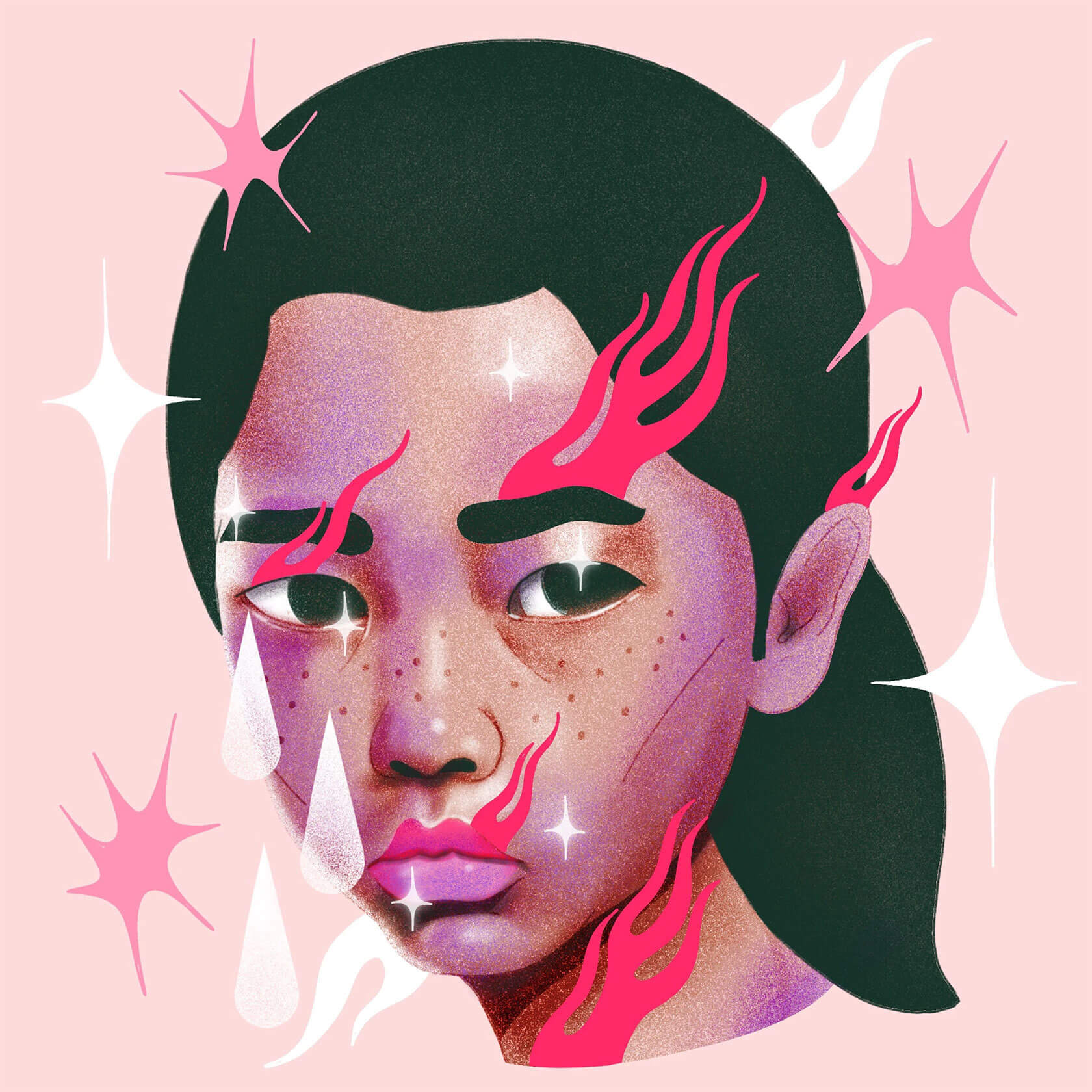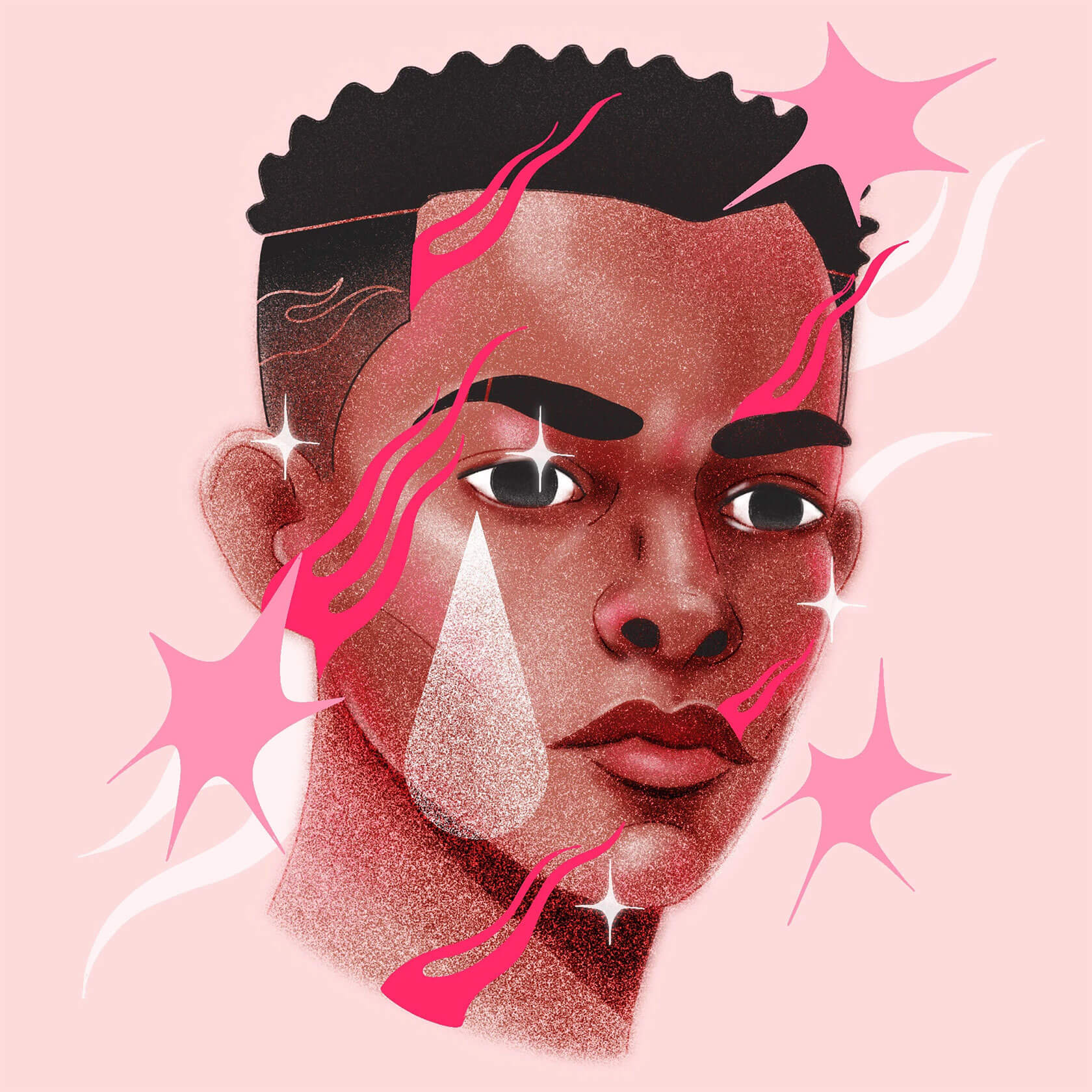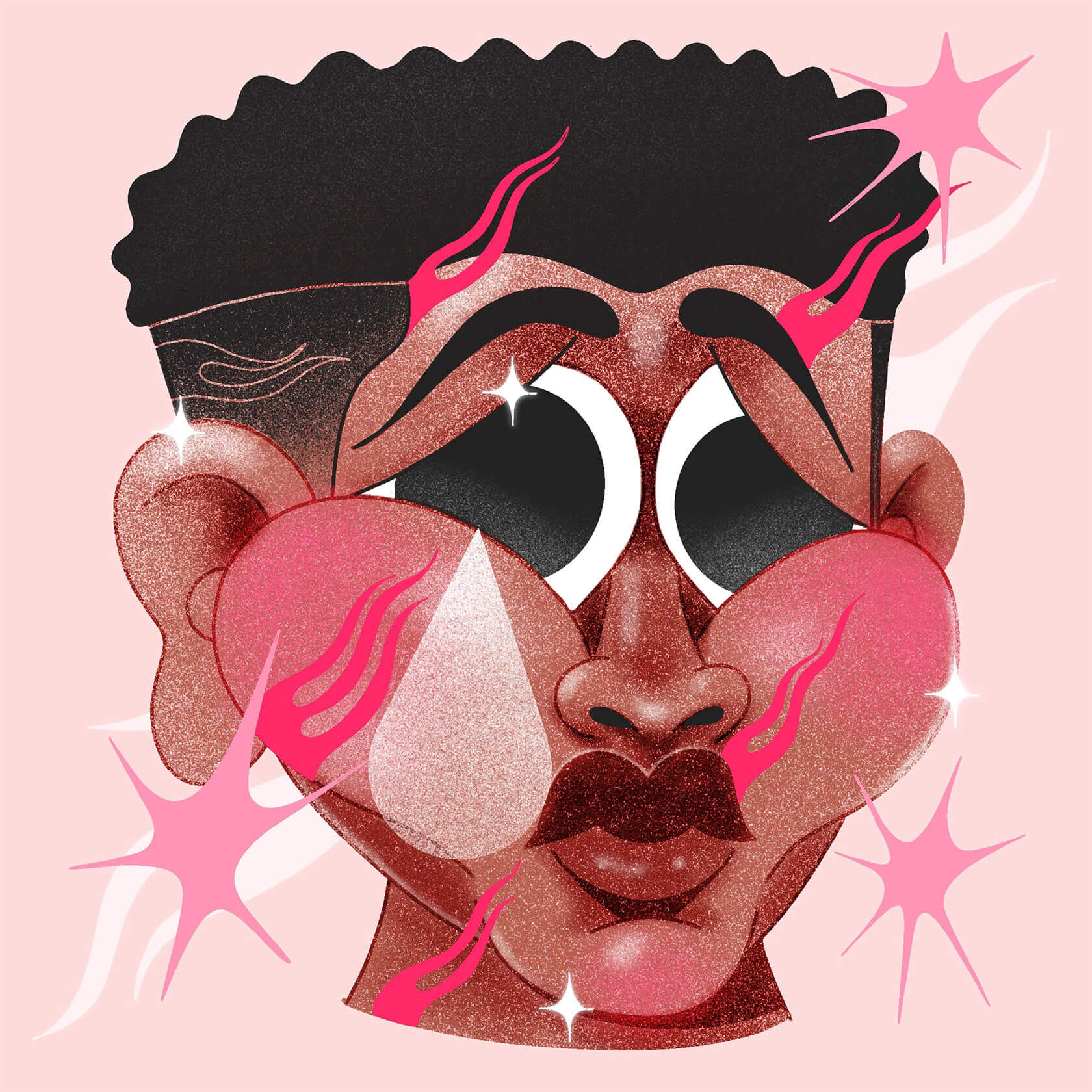 The faces in Ulises’ portraits are adorned with juxtaposed elements like oversized tears, glowing flames and radiant sparkles, blending tenderness and intensity in a striking visual language. Each portrait feels alive with contrast, featuring soft textures against sharp shapes, melancholy fused with humor, and vulnerability framed by vibrant pinks and reds.