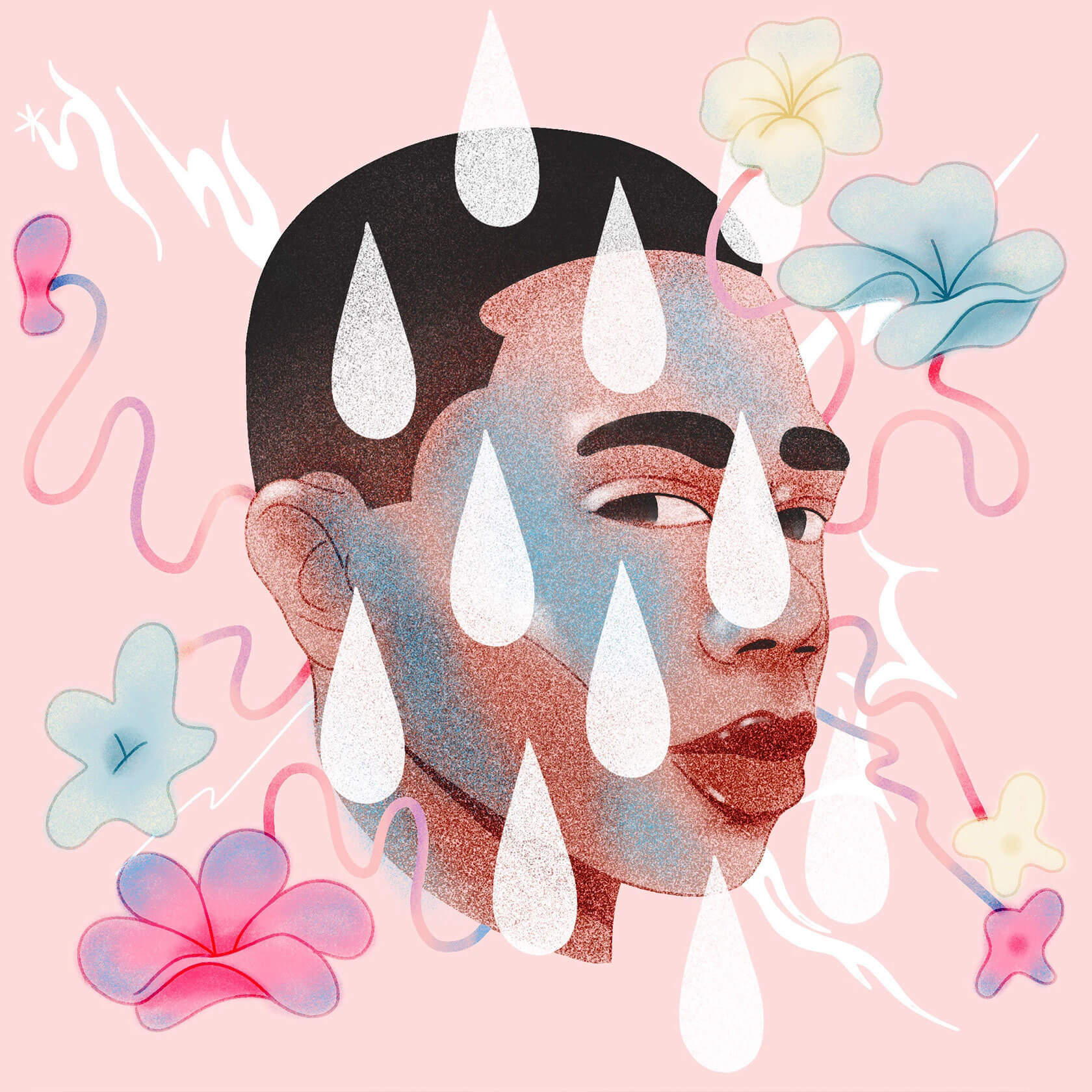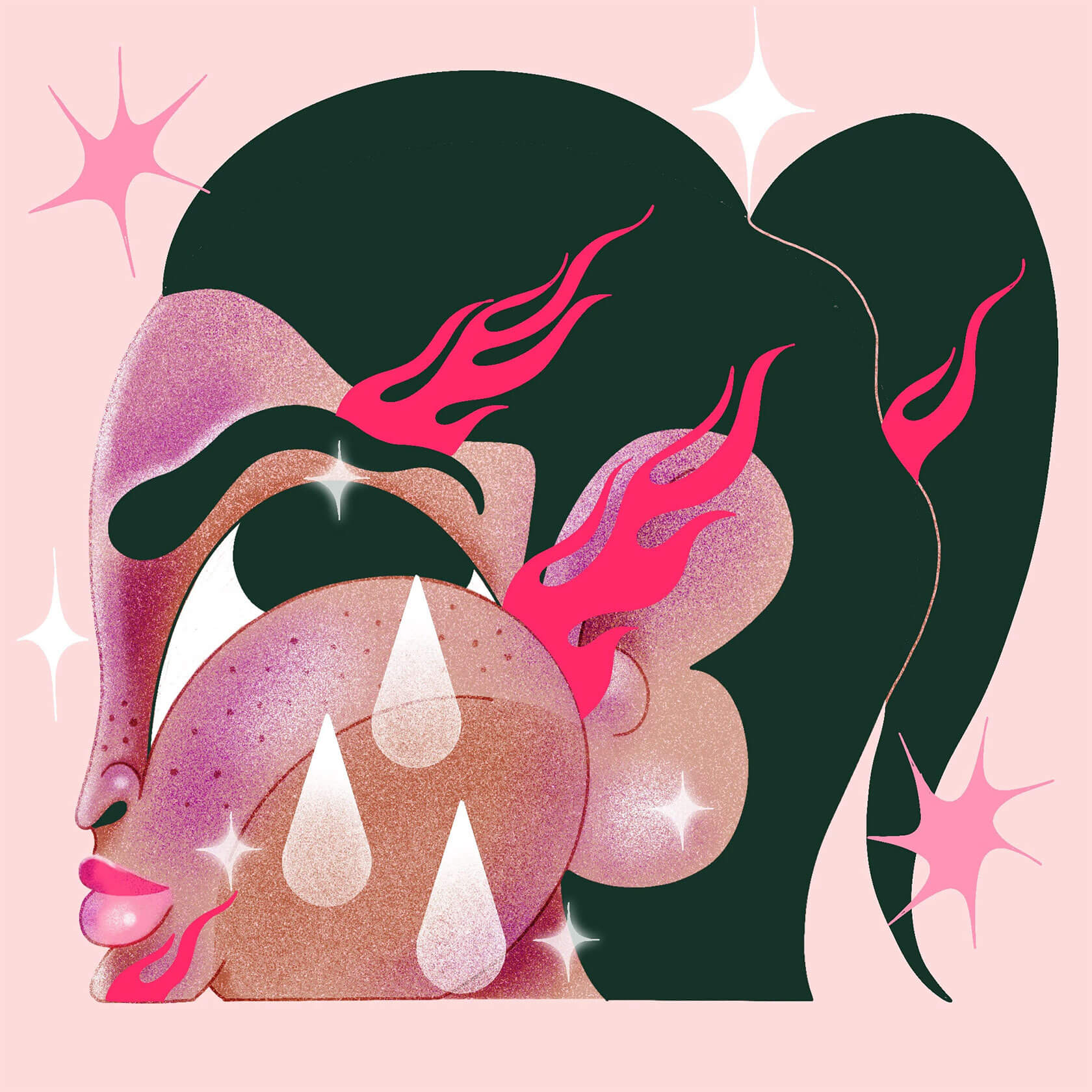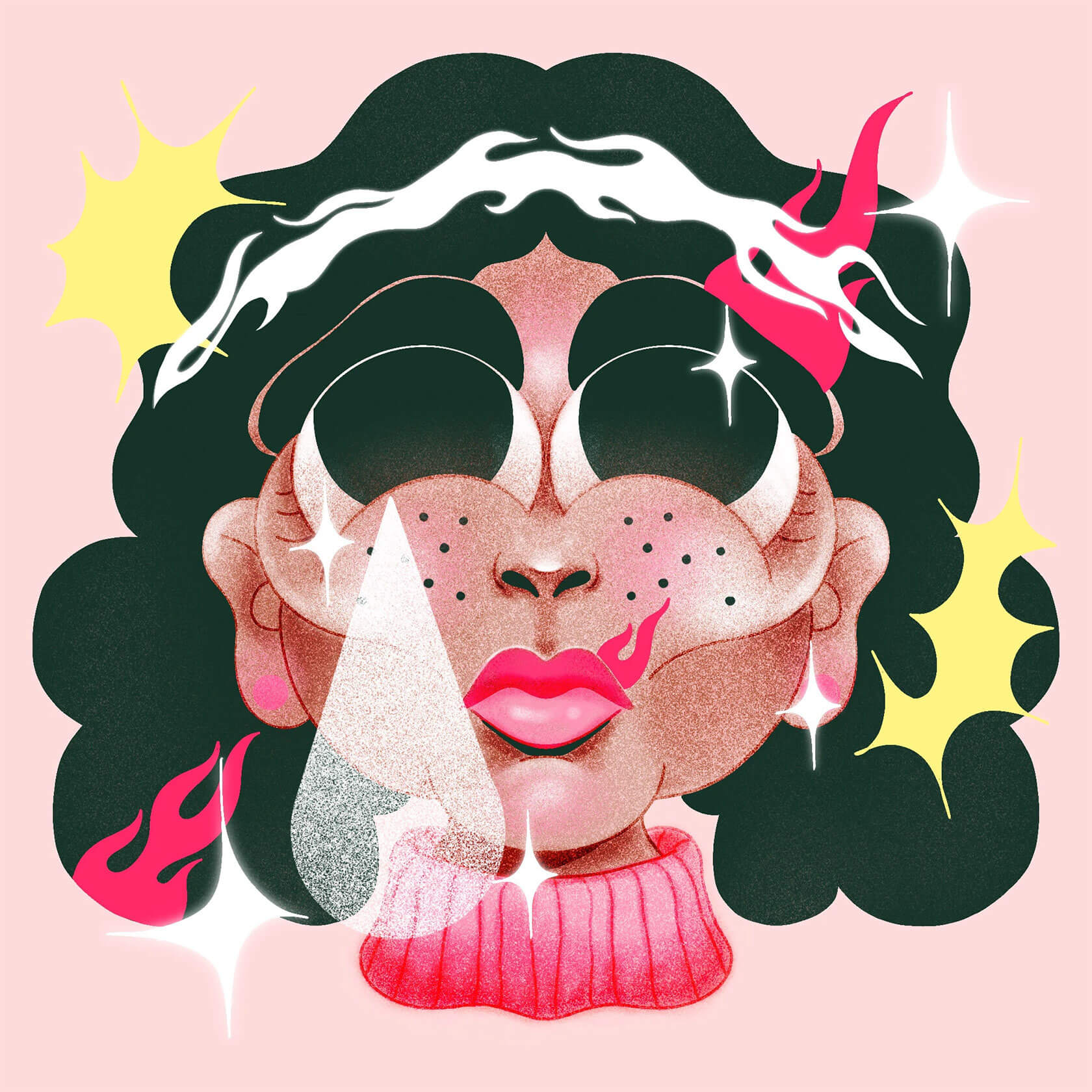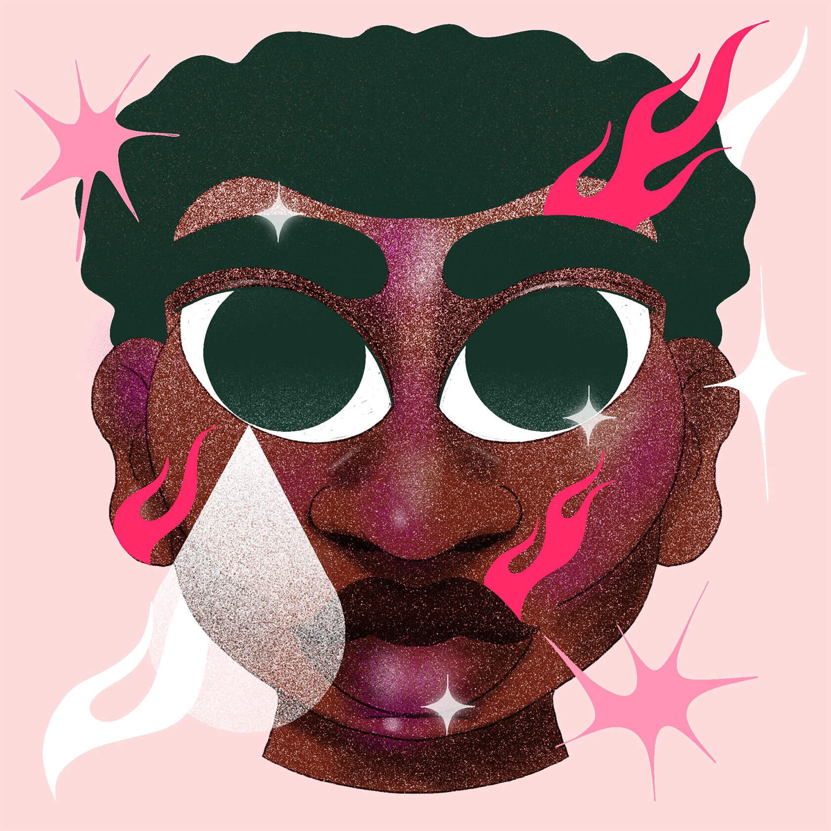 The faces in Ulises’ portraits are adorned with juxtaposed elements like oversized tears, glowing flames and radiant sparkles, blending tenderness and intensity in a striking visual language. Each portrait feels alive with contrast, featuring soft textures against sharp shapes, melancholy fused with humor, and vulnerability framed by vibrant pinks and reds.