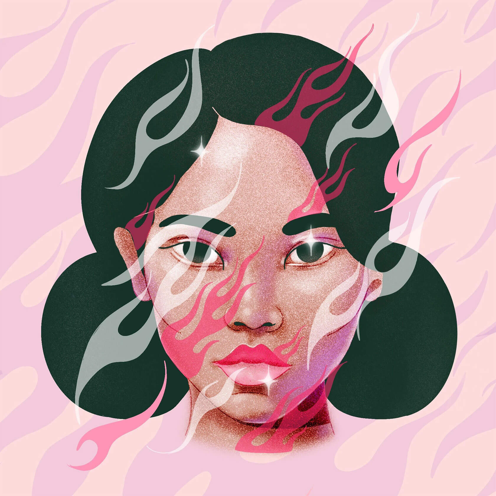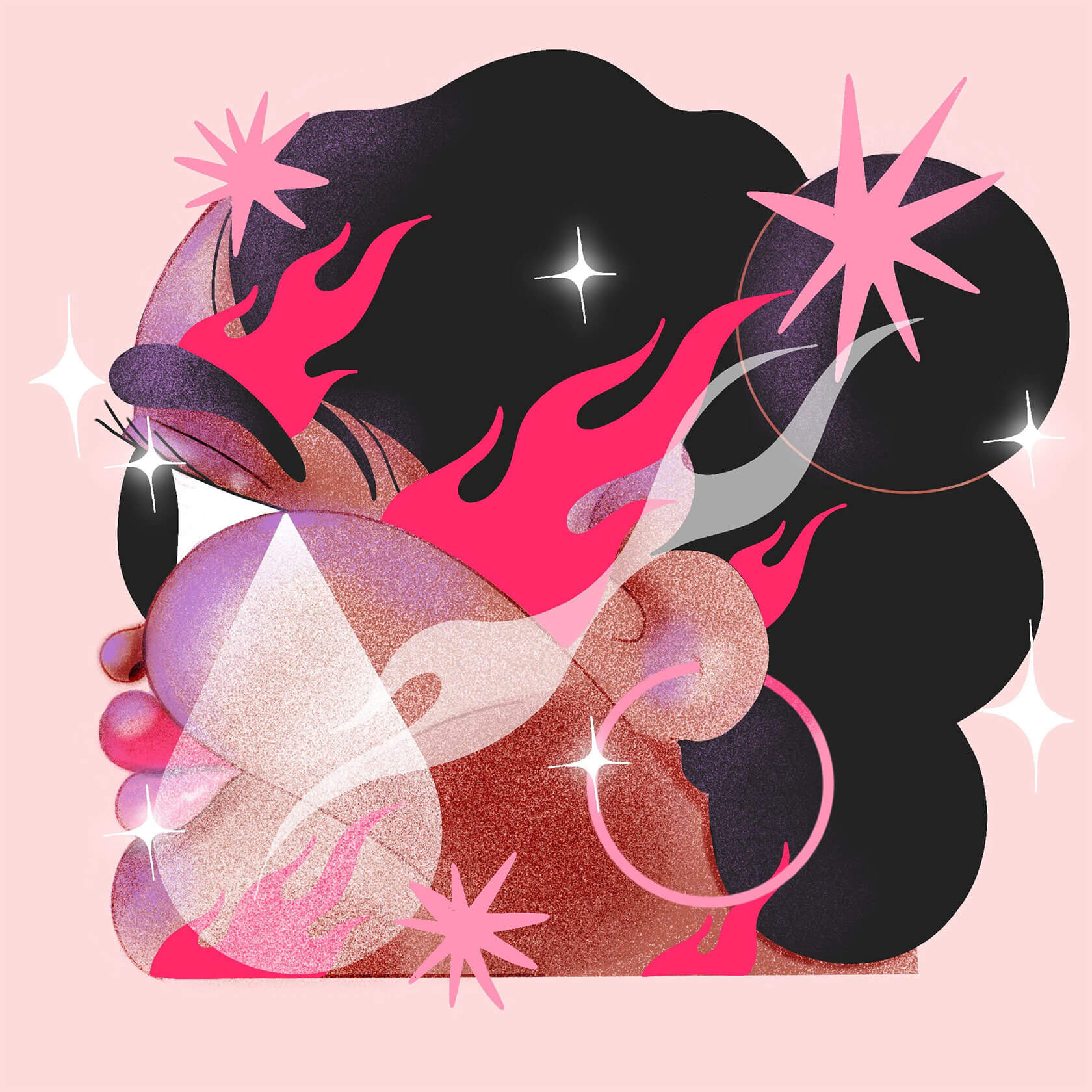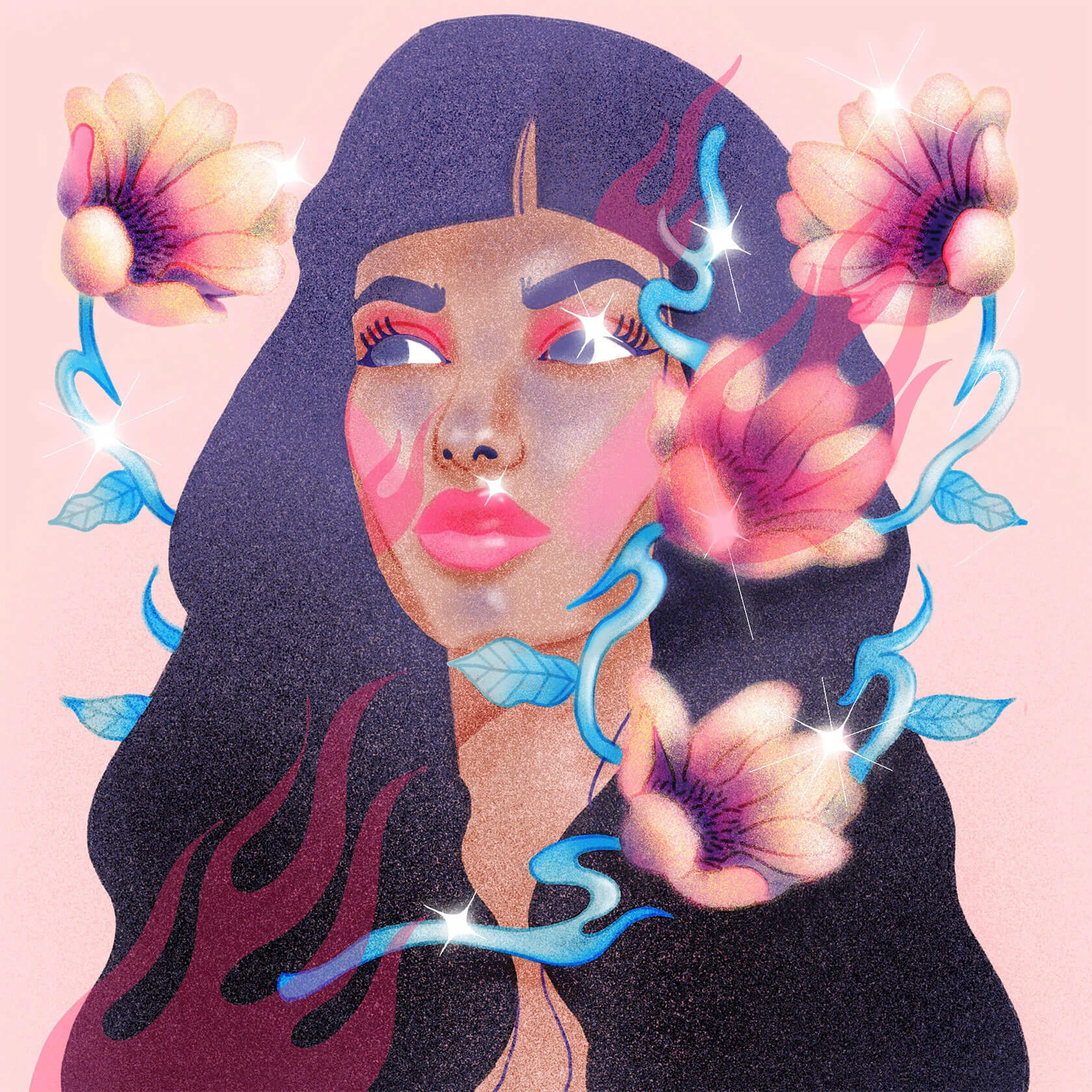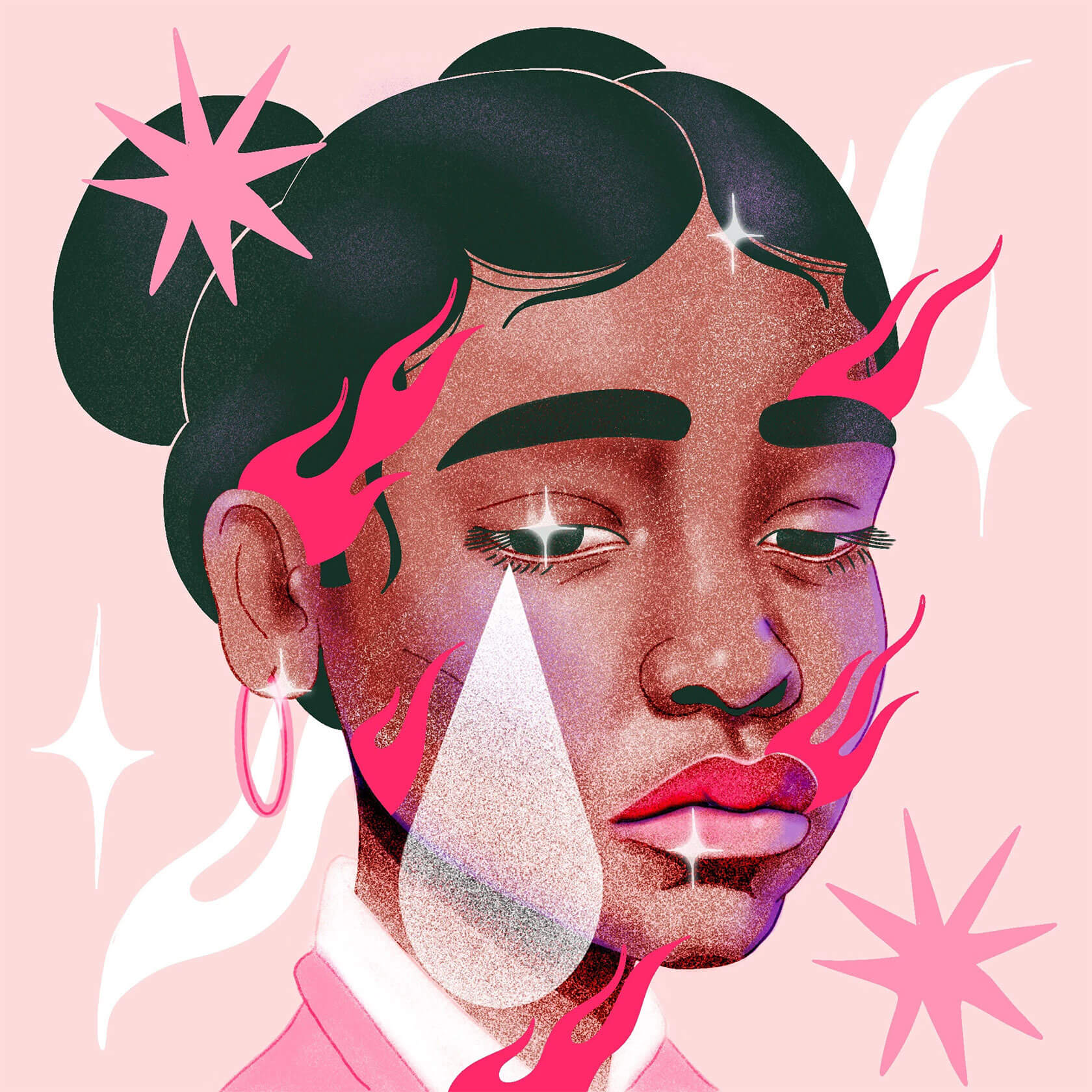 The faces in Ulises’ portraits are adorned with juxtaposed elements like oversized tears, glowing flames and radiant sparkles, blending tenderness and intensity in a striking visual language. Each portrait feels alive with contrast, featuring soft textures against sharp shapes, melancholy fused with humor, and vulnerability framed by vibrant pinks and reds.