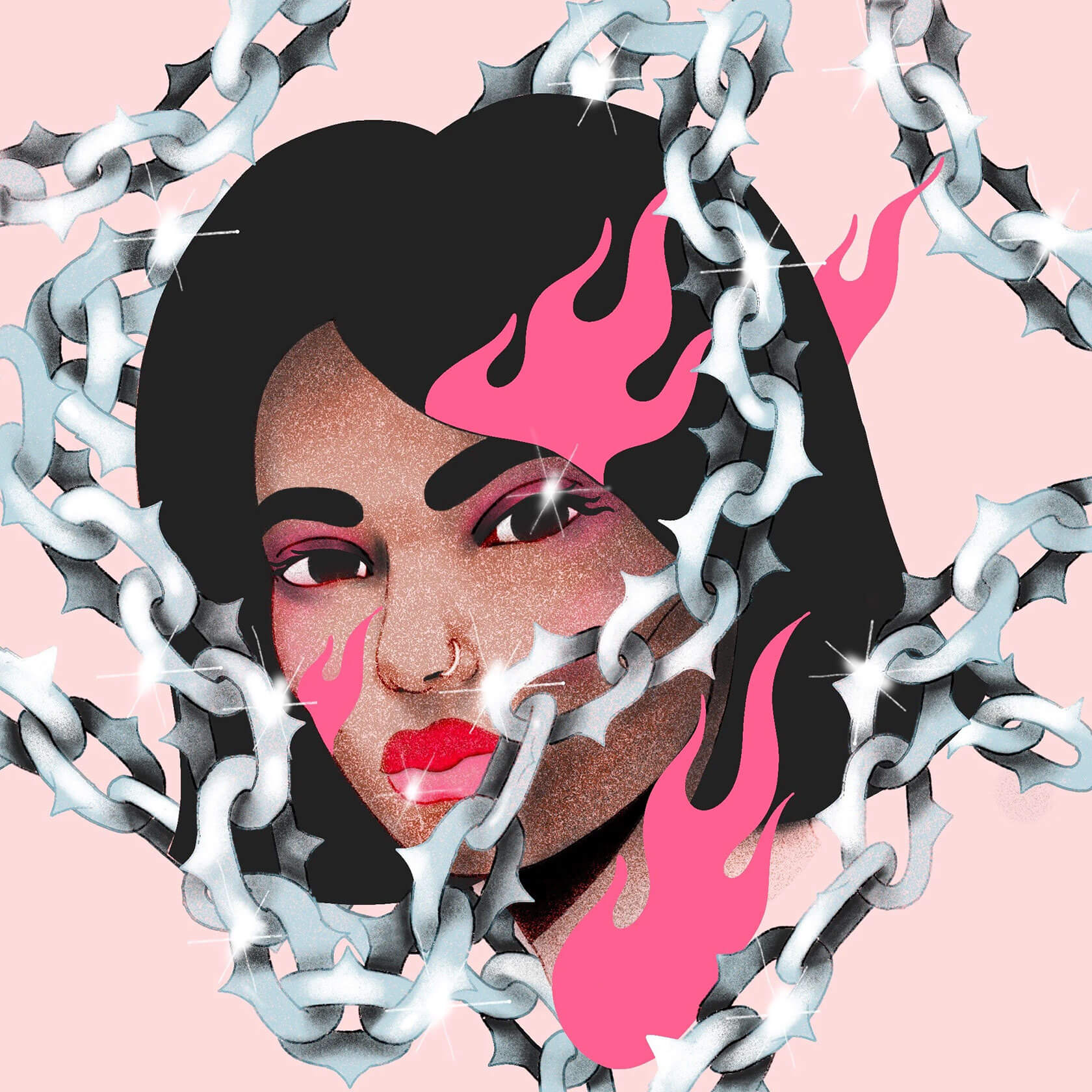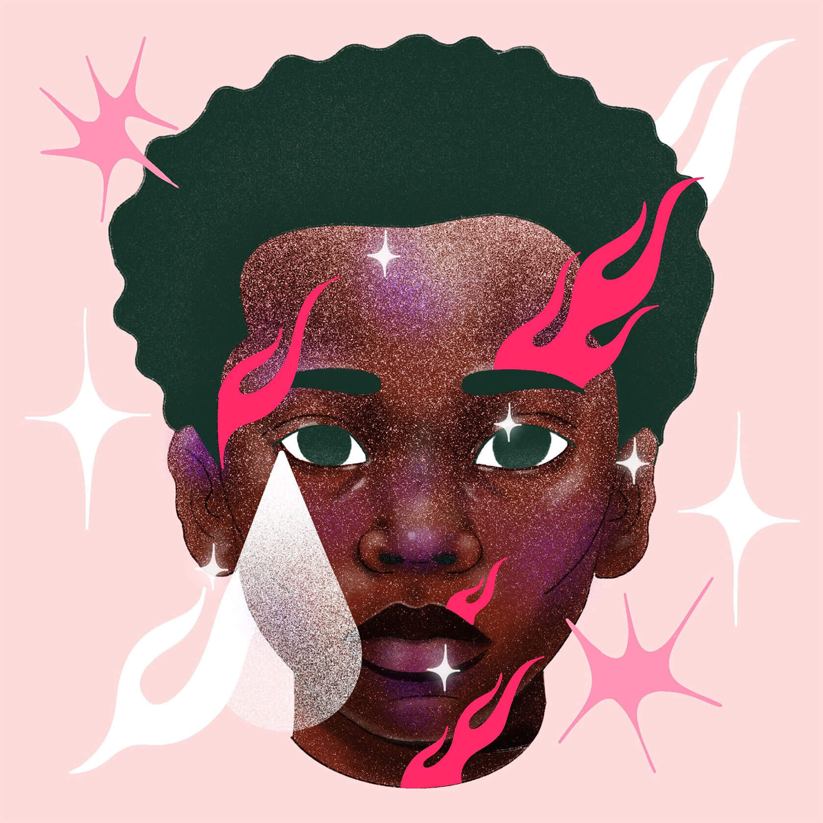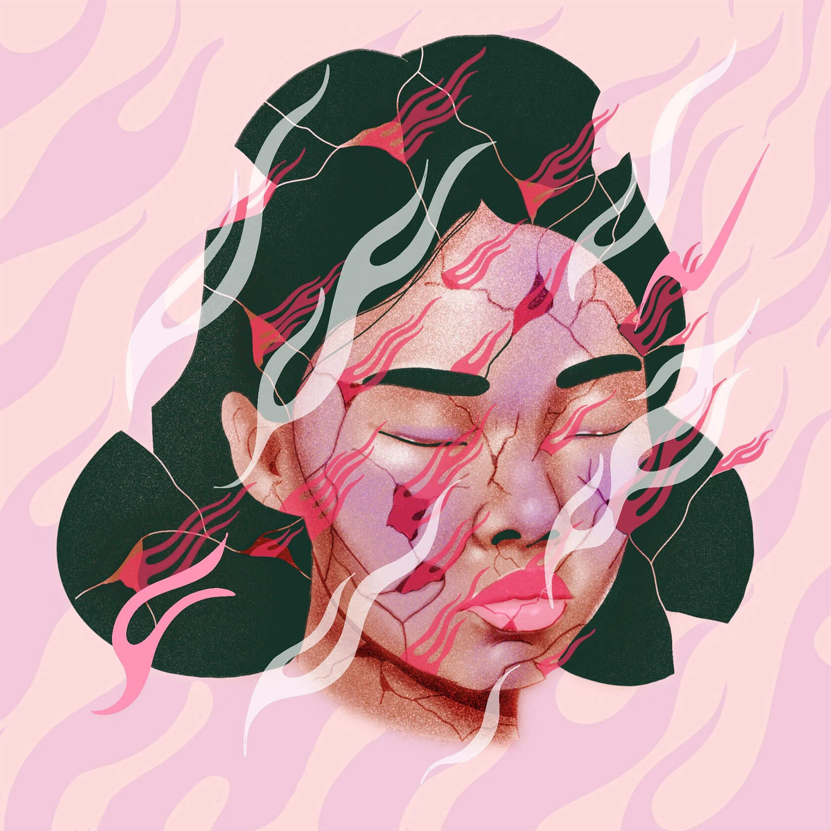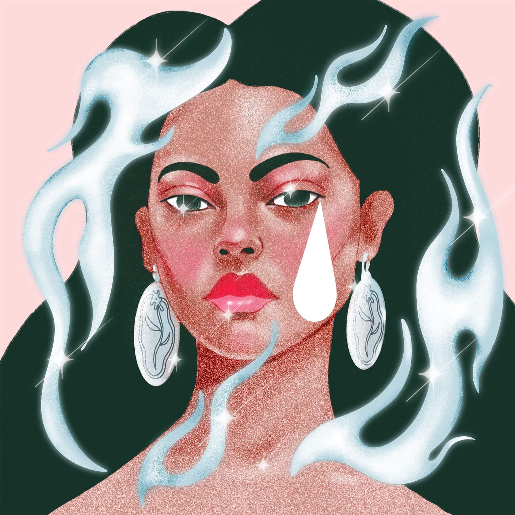 The faces in Ulises’ portraits are adorned with juxtaposed elements like oversized tears, glowing flames and radiant sparkles, blending tenderness and intensity in a striking visual language. Each portrait feels alive with contrast, featuring soft textures against sharp shapes, melancholy fused with humor, and vulnerability framed by vibrant pinks and reds.