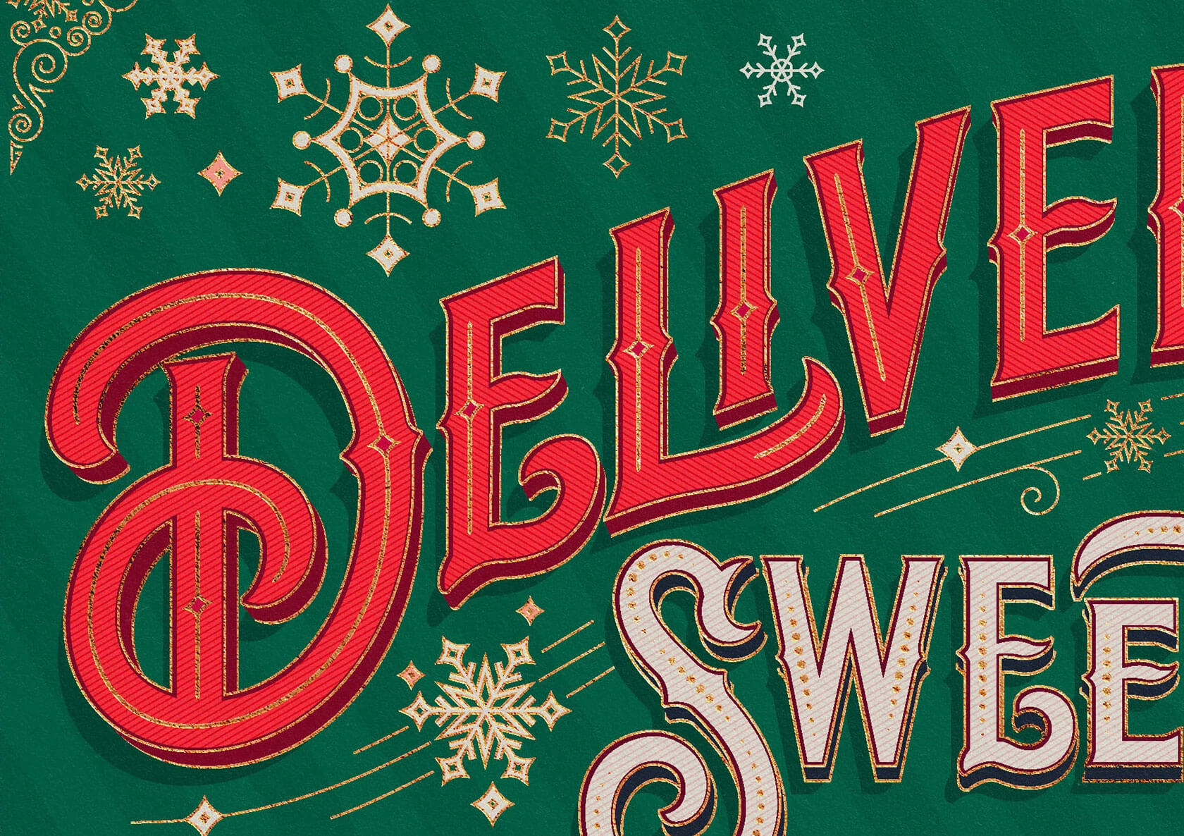 Many of the cards use traditional holiday palettes, combining deep greens, rich reds and neutral tones with specialty papers, metallic foils and tactile finishes. The typography is the star throughout, with custom letterforms, vintage-inspired layouts and carefully balanced ornamentation that gives each piece a timeless, keepsake quality.