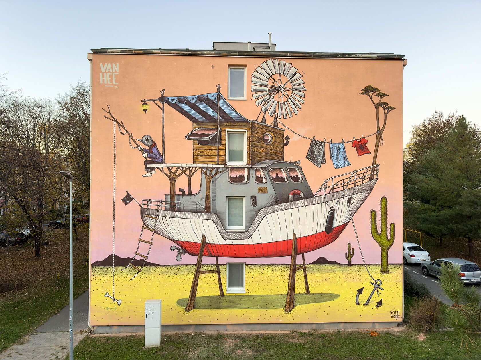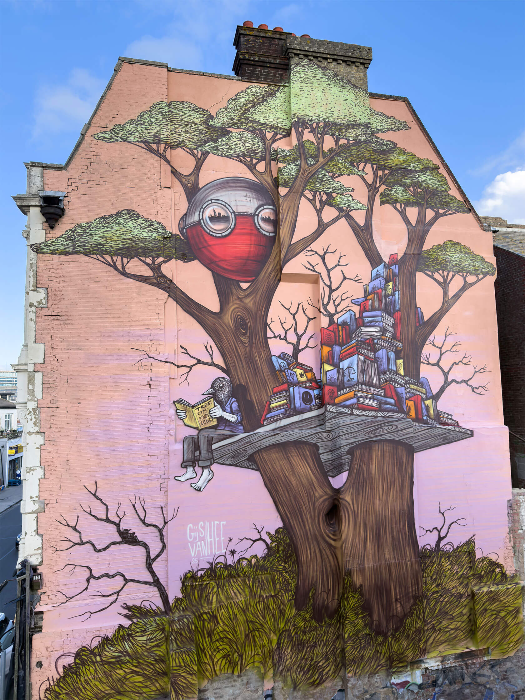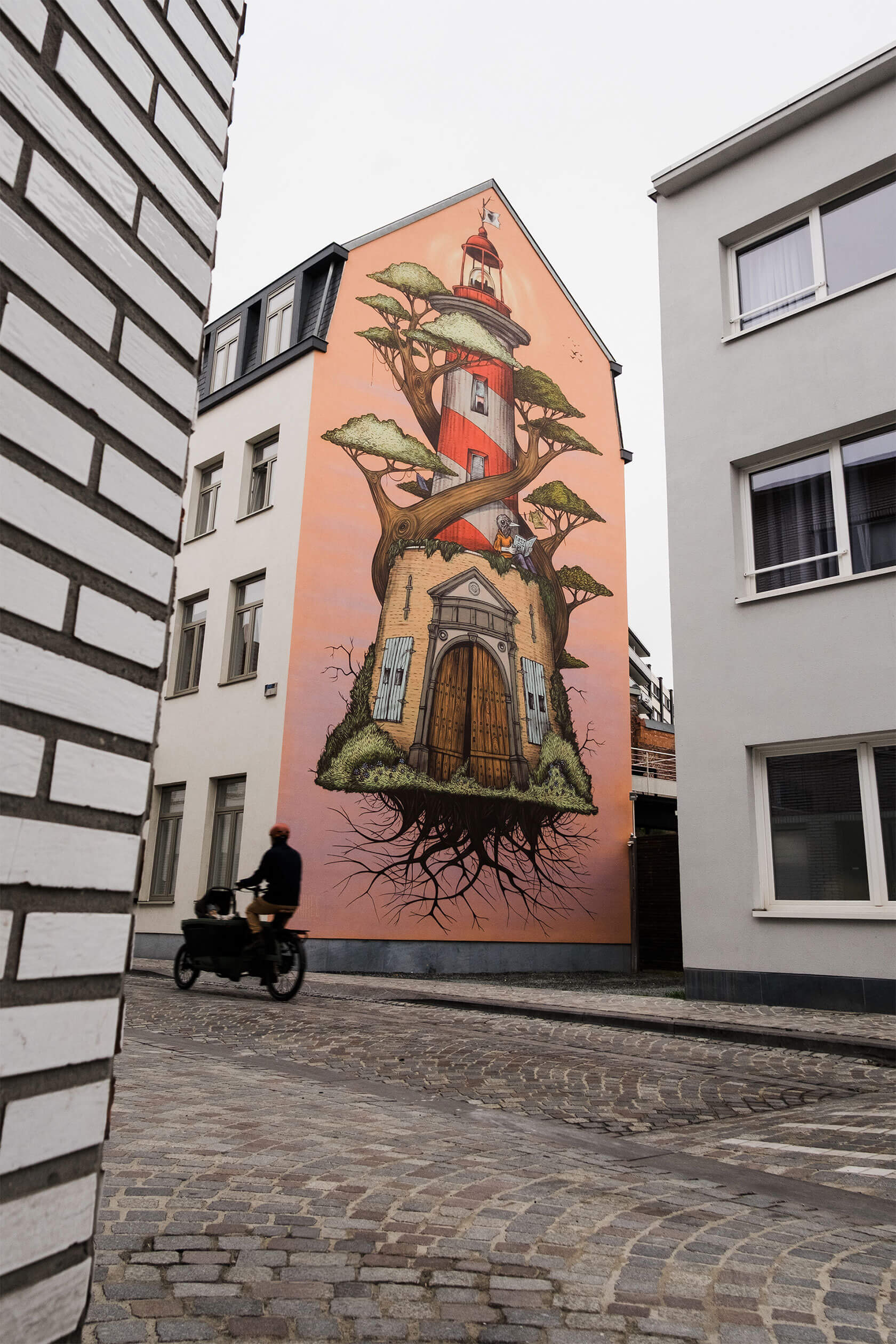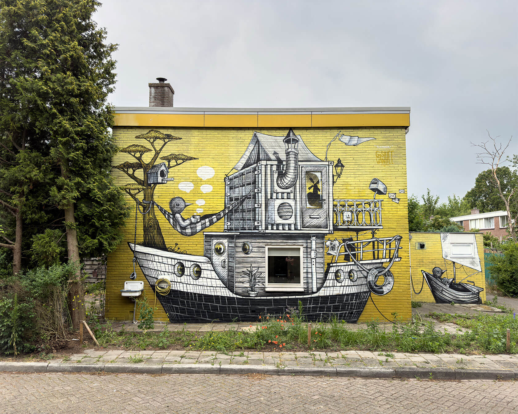 Whimsical treehouses, drifting boats and curious bird-headed characters turn up on walls across Belgium and beyond, each one part of the imaginative universe crafted by Gijs Vanhee.