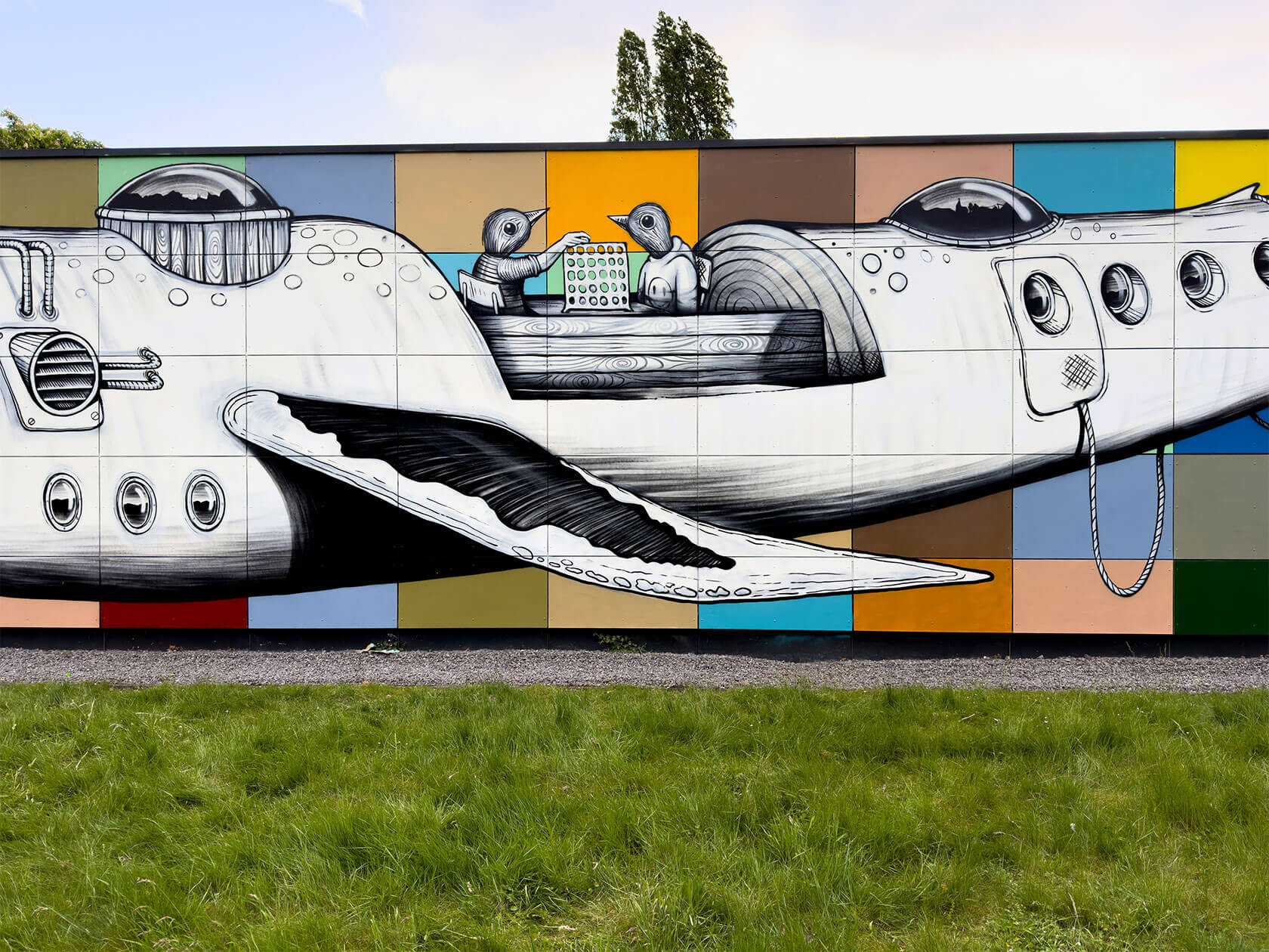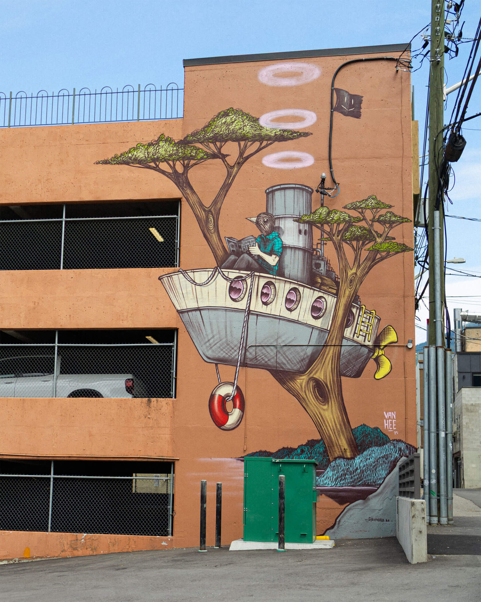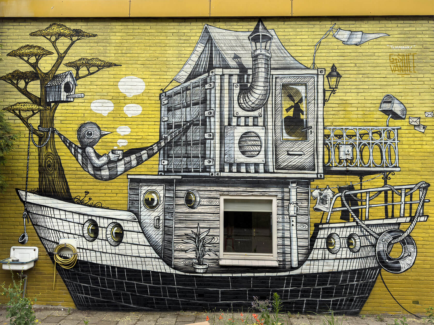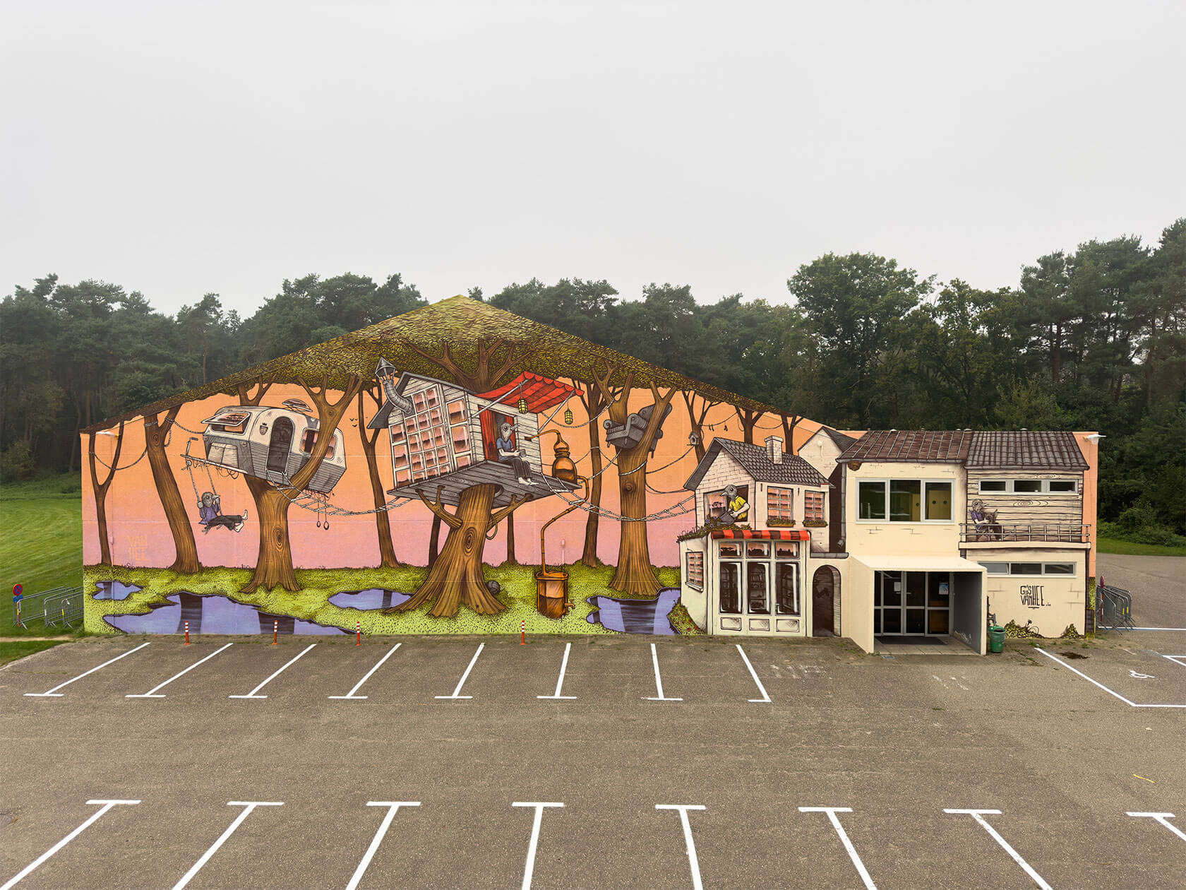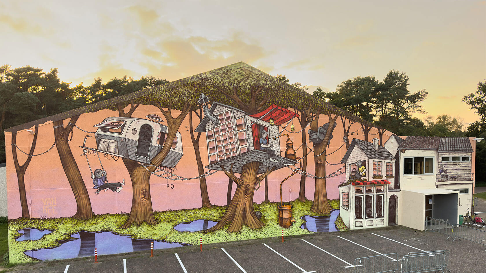 Whimsical treehouses, drifting boats and curious bird-headed characters turn up on walls across Belgium and beyond, each one part of the imaginative universe crafted by Gijs Vanhee.