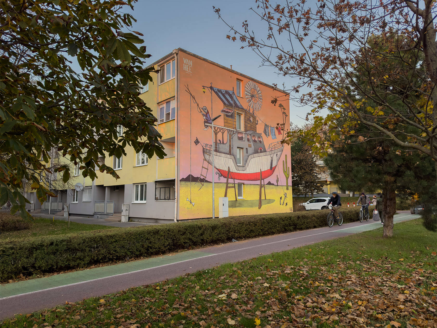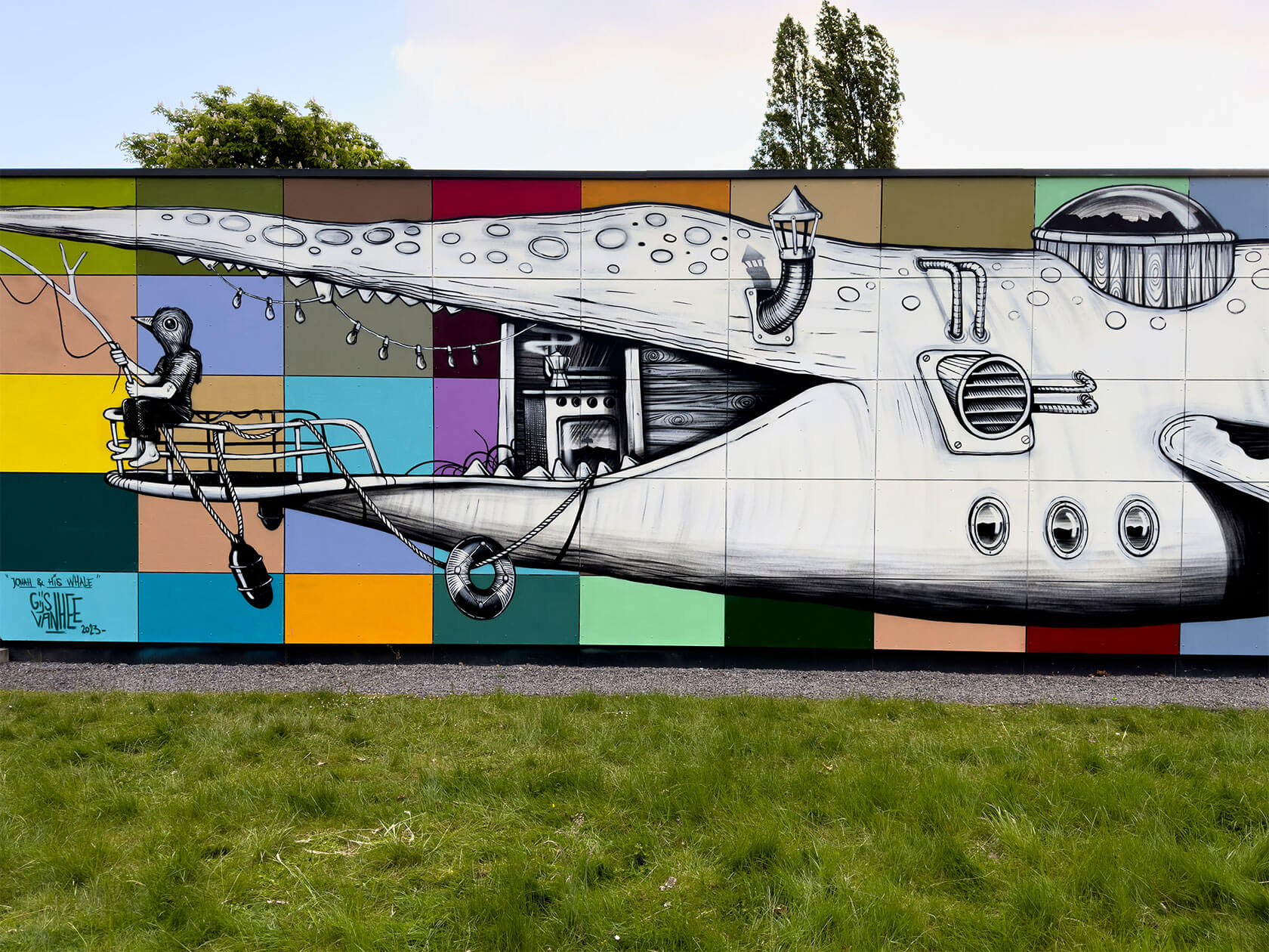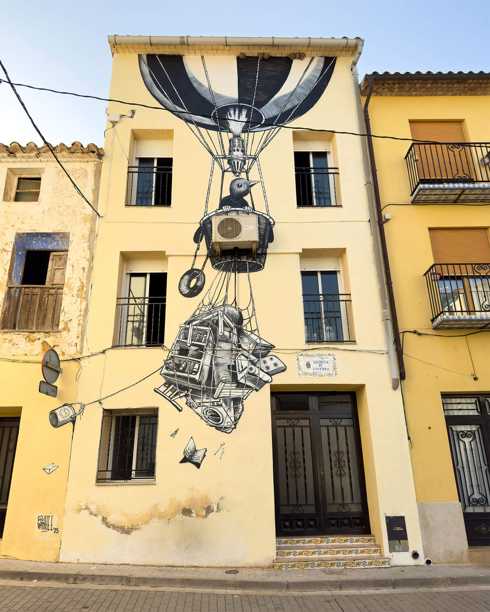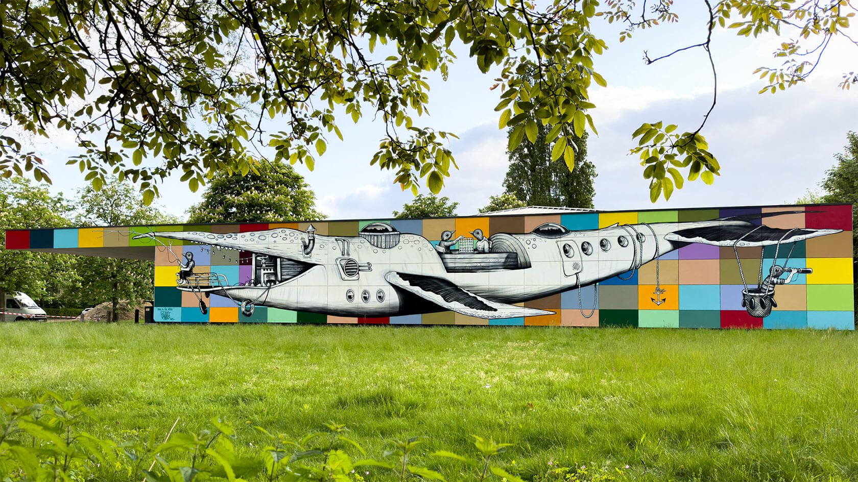 Whimsical treehouses, drifting boats and curious bird-headed characters turn up on walls across Belgium and beyond, each one part of the imaginative universe crafted by Gijs Vanhee.