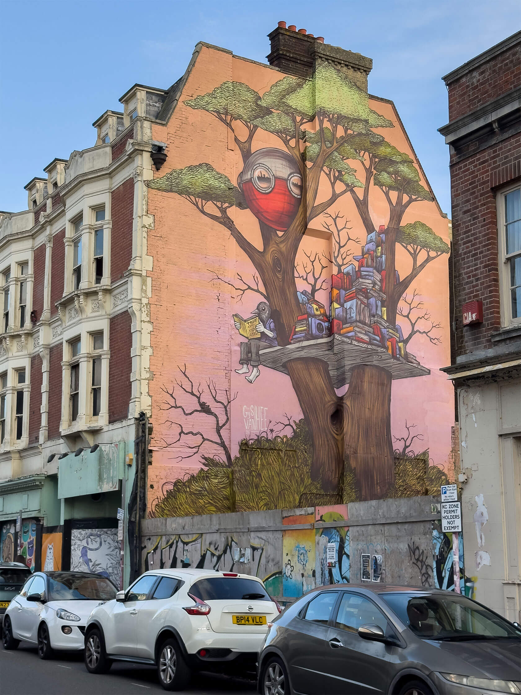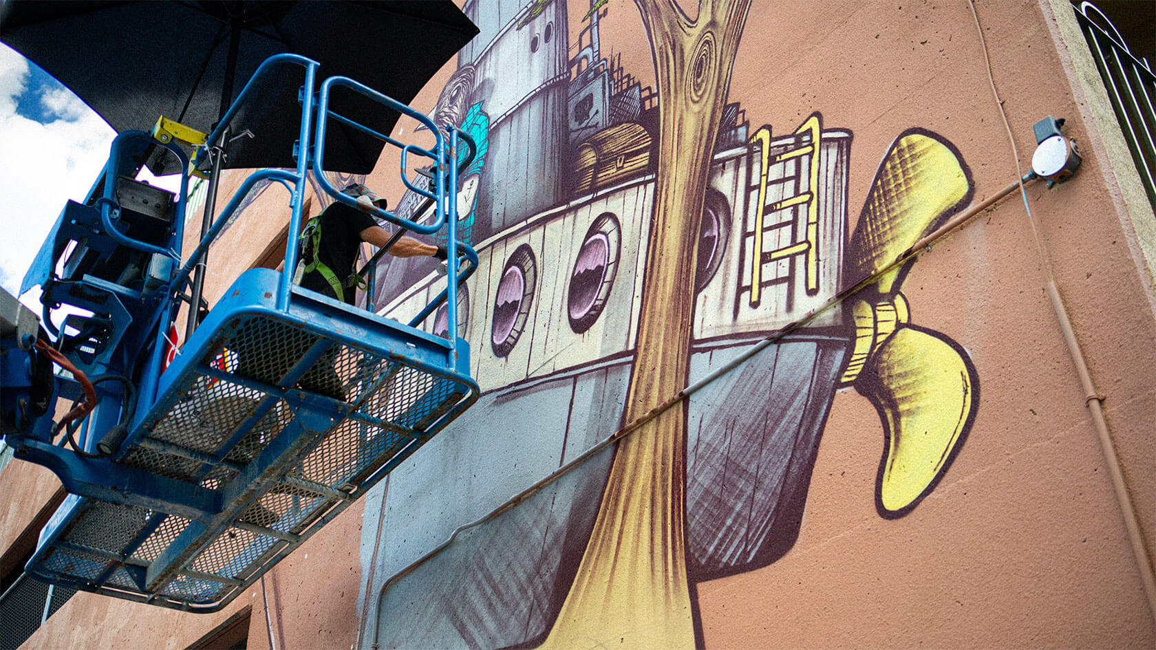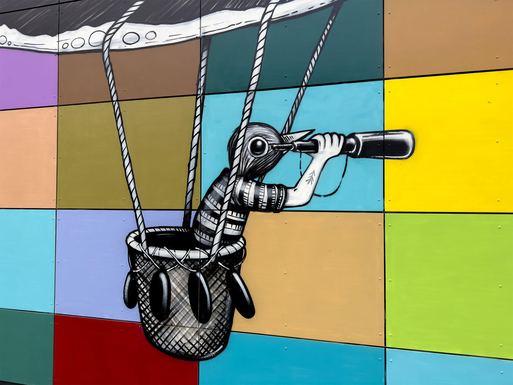 A common thread throughout his work is the presence of his “freebirds,” charming wanderers who move through surreal, hand-drawn landscapes. Using expressive linework and a soft, limited palette, he creates mural scenes that unfold like captivating short stories. Windows become portholes, tree trunks merge with architecture and everyday buildings transform into playful, narrative spaces that reward a closer look.
