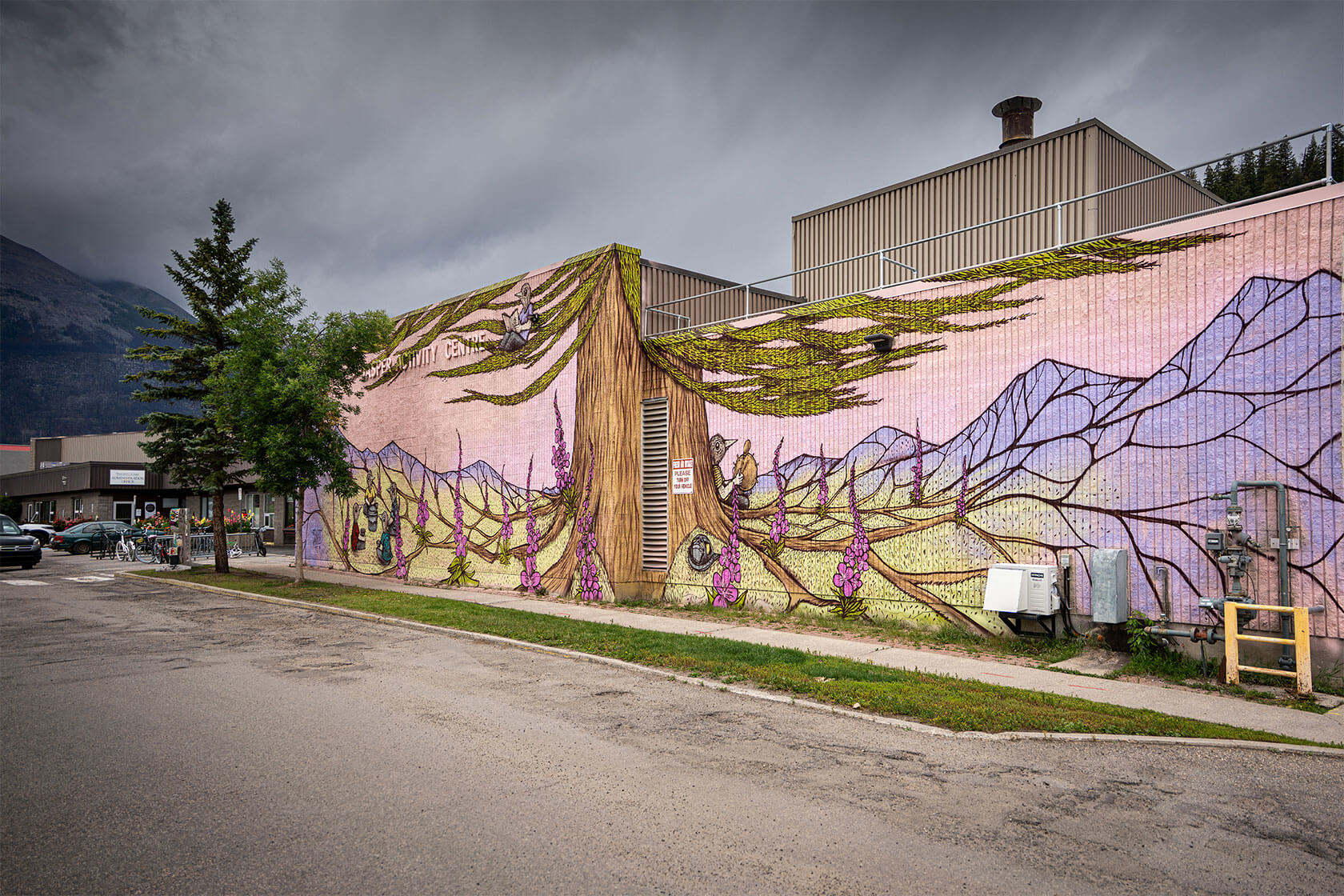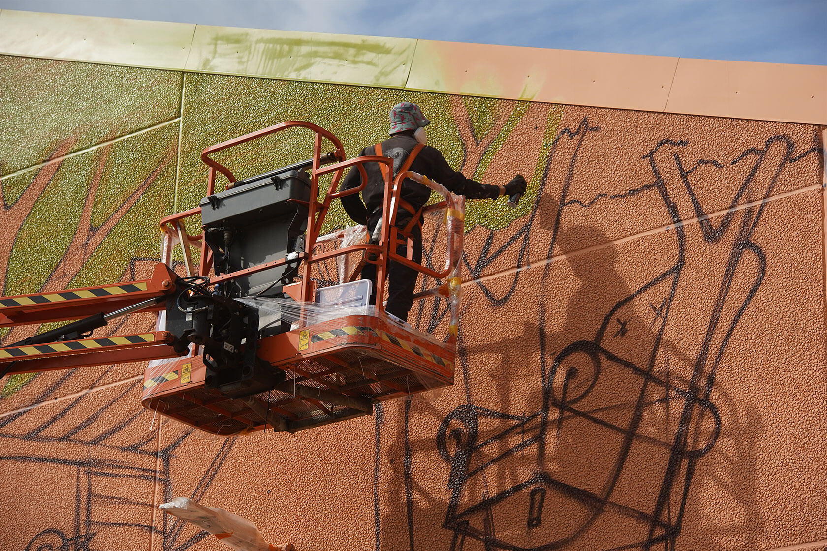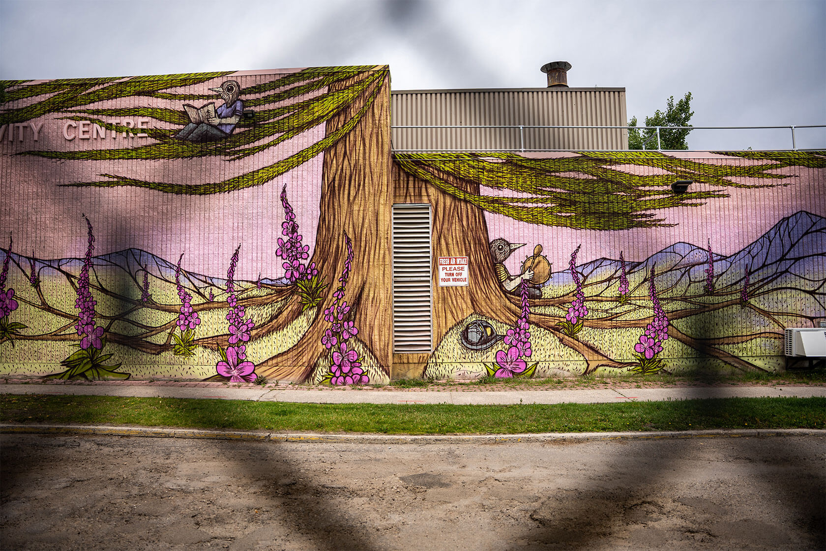 A common thread throughout his work is the presence of his “freebirds,” charming wanderers who move through surreal, hand-drawn landscapes. Using expressive linework and a soft, limited palette, he creates mural scenes that unfold like captivating short stories. Windows become portholes, tree trunks merge with architecture and everyday buildings transform into playful, narrative spaces that reward a closer look.