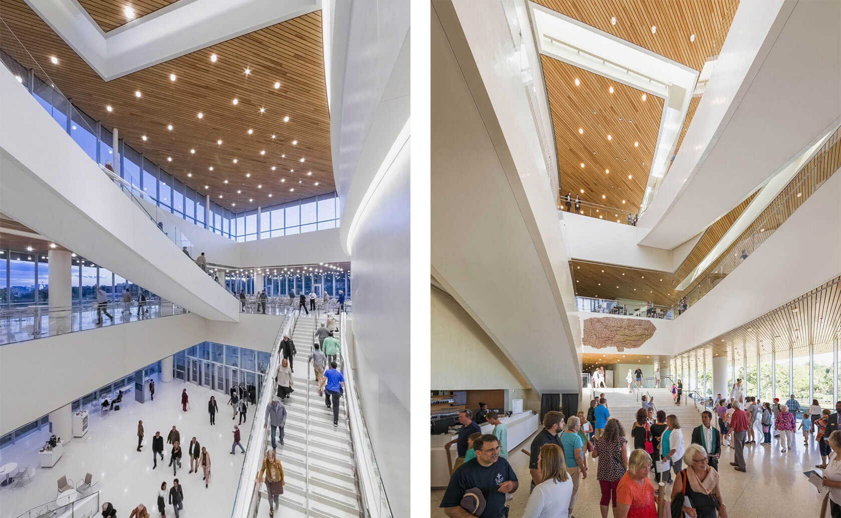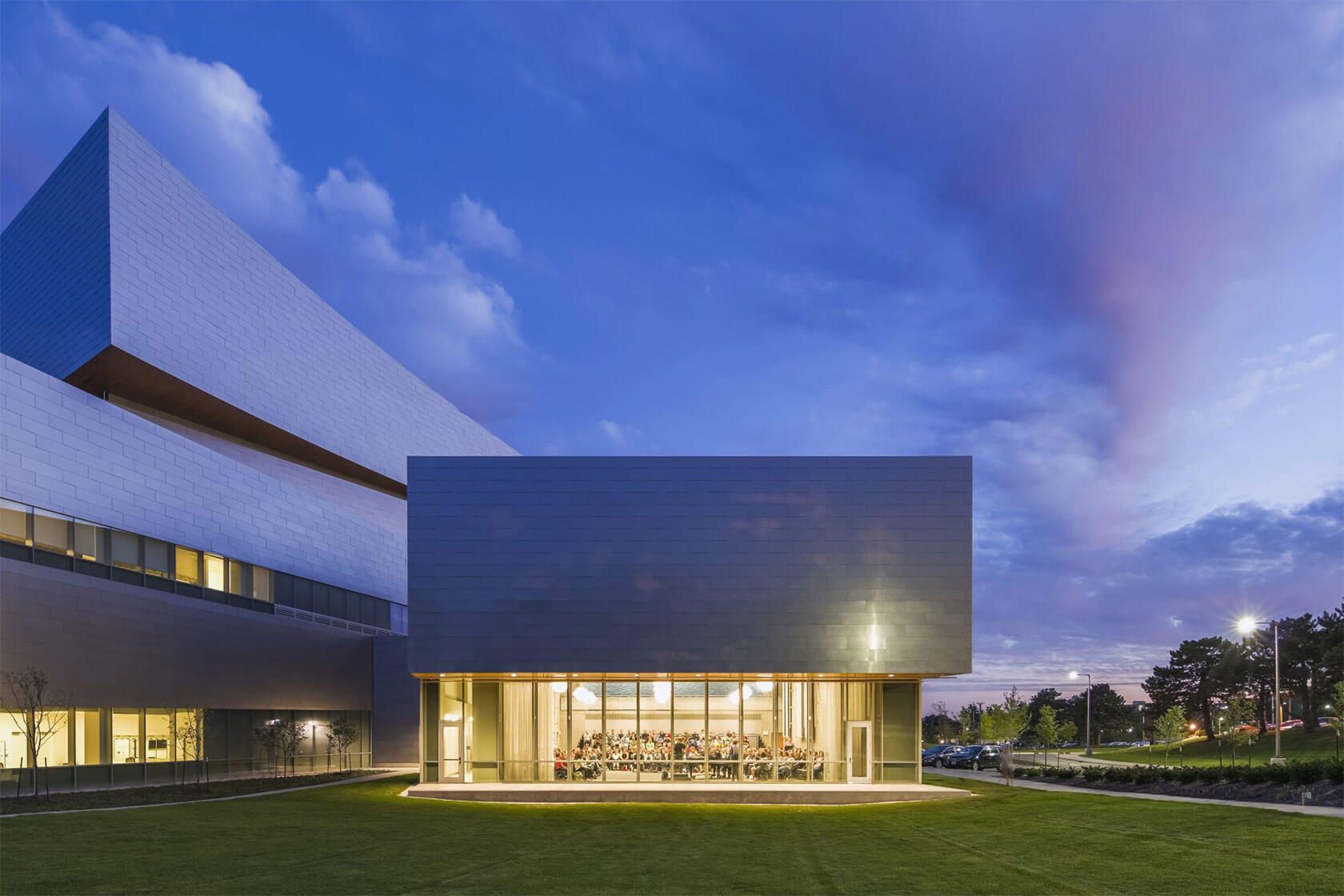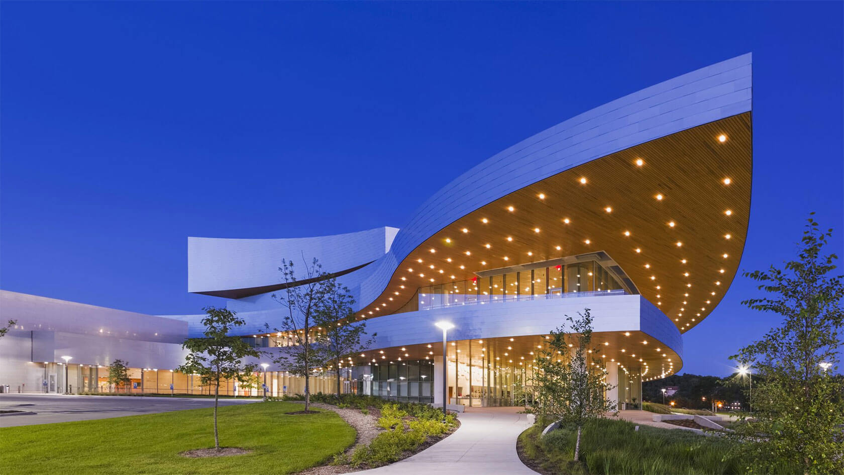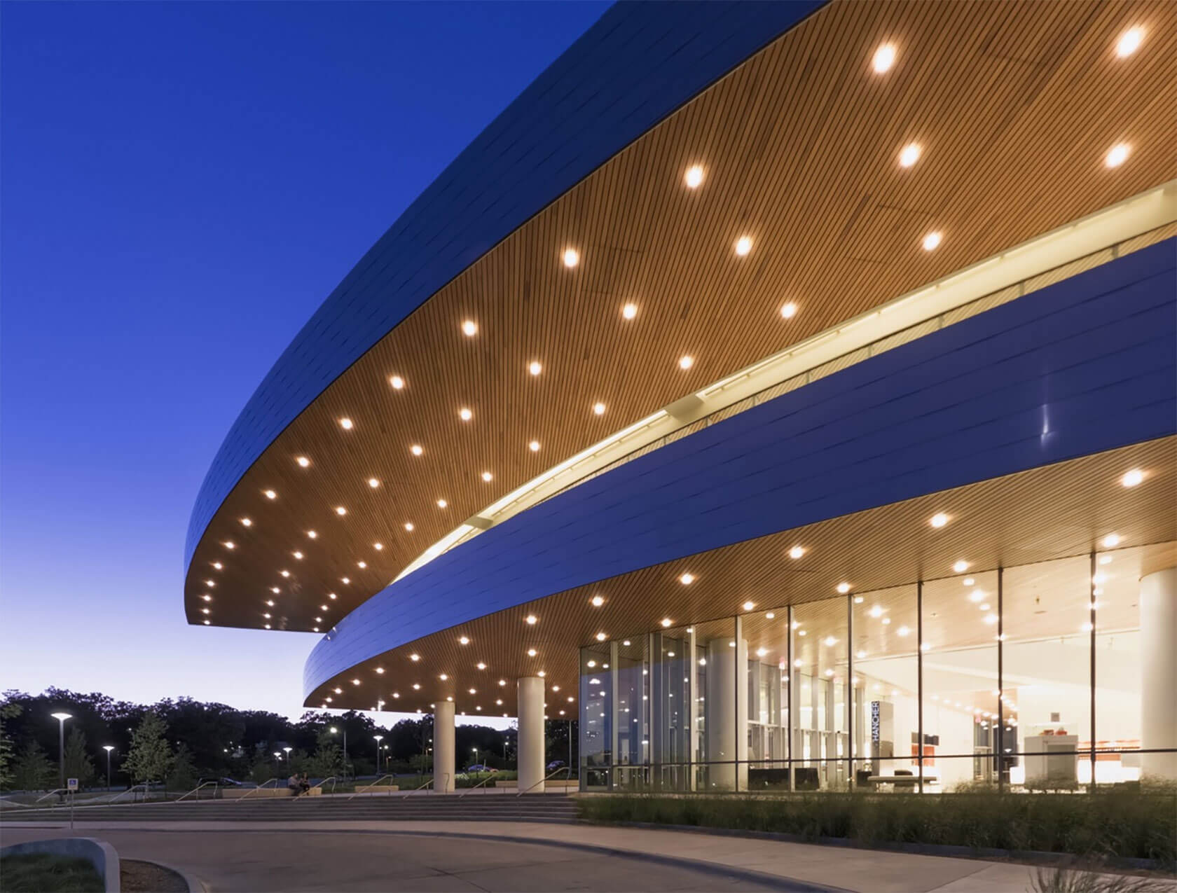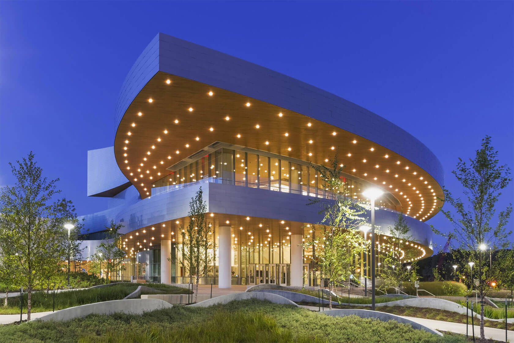Completed in 2016, the new Hancher overlooks the Iowa River from a prominent hilltop site and greets visitors with sweeping horizontal lines that echo the surrounding landscape and the curve of the river. Cantilevered terraces extend dramatically over the lobby and second-level terrace, while expansive glass walls flood the interior with natural light and frame panoramic views of the campus and water below. At night, the building glows warmly, with its curved metal and glass forms inviting audiences inside.