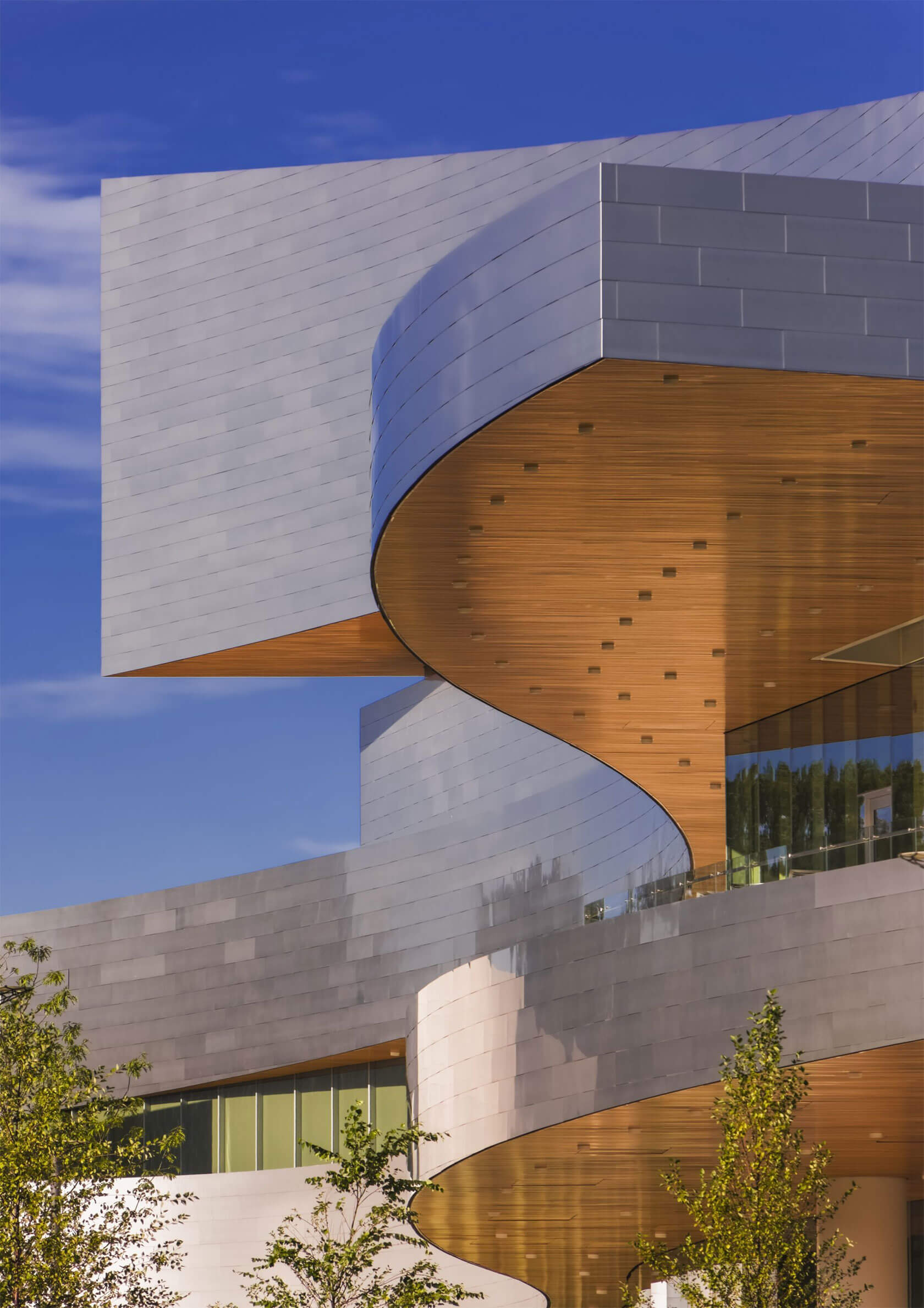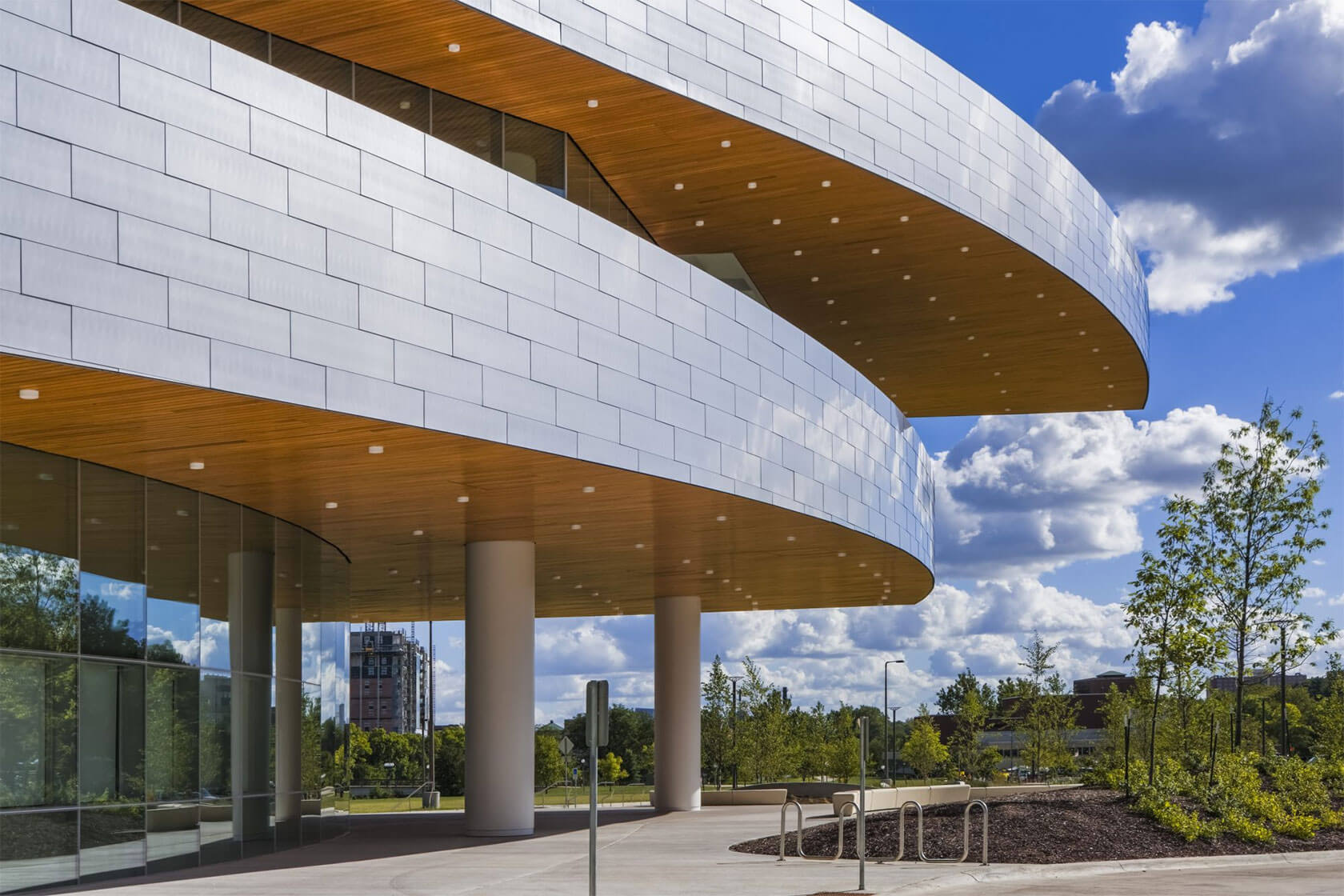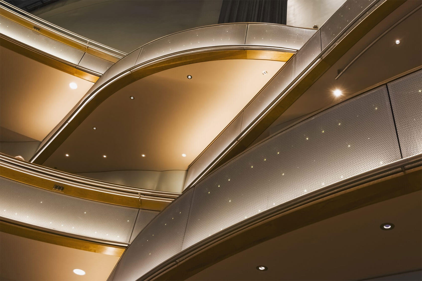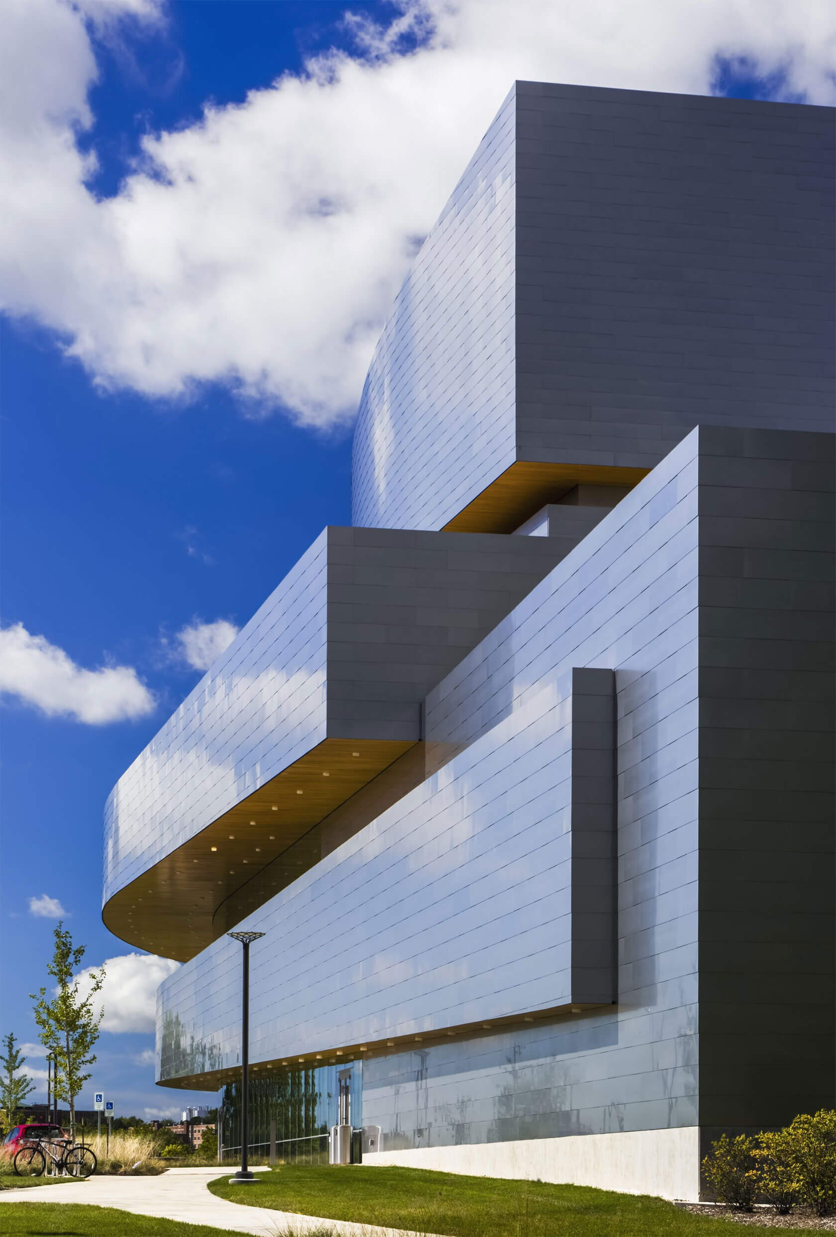 Completed in 2016, the new Hancher overlooks the Iowa River from a prominent hilltop site and greets visitors with sweeping horizontal lines that echo the surrounding landscape and the curve of the river. Cantilevered terraces extend dramatically over the lobby and second-level terrace, while expansive glass walls flood the interior with natural light and frame panoramic views of the campus and water below. At night, the building glows warmly, with its curved metal and glass forms inviting audiences inside.