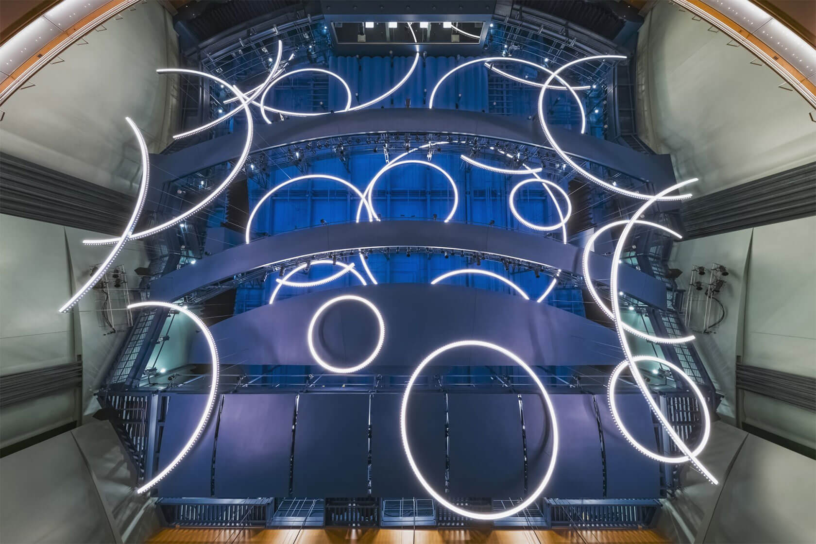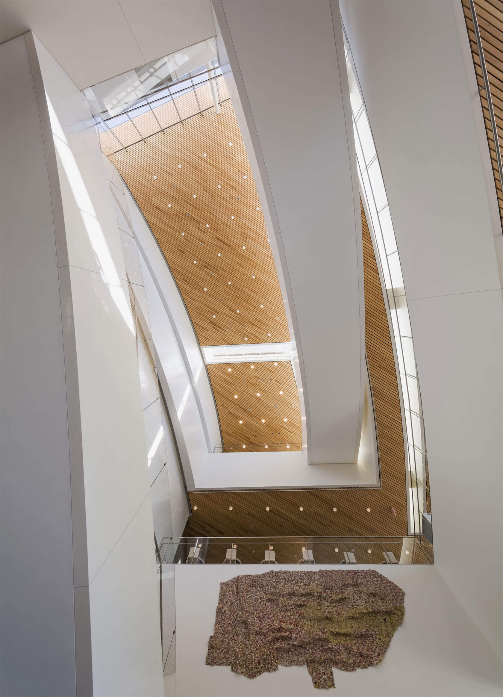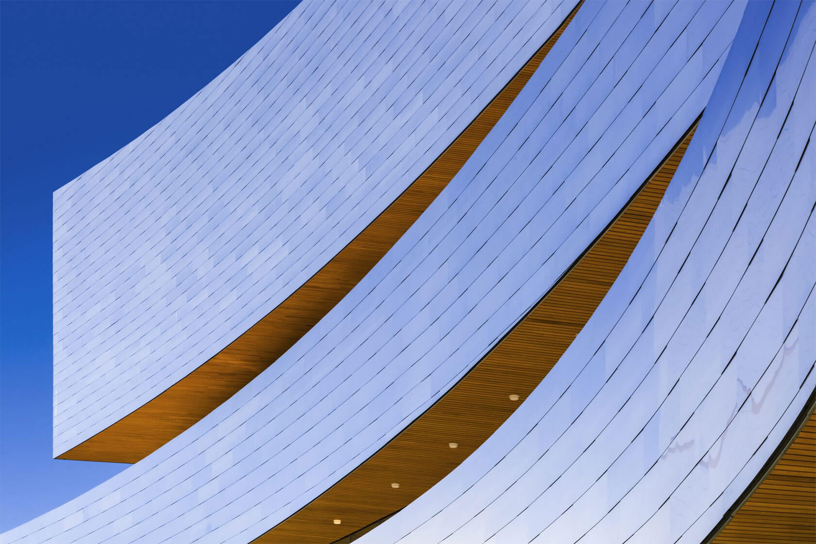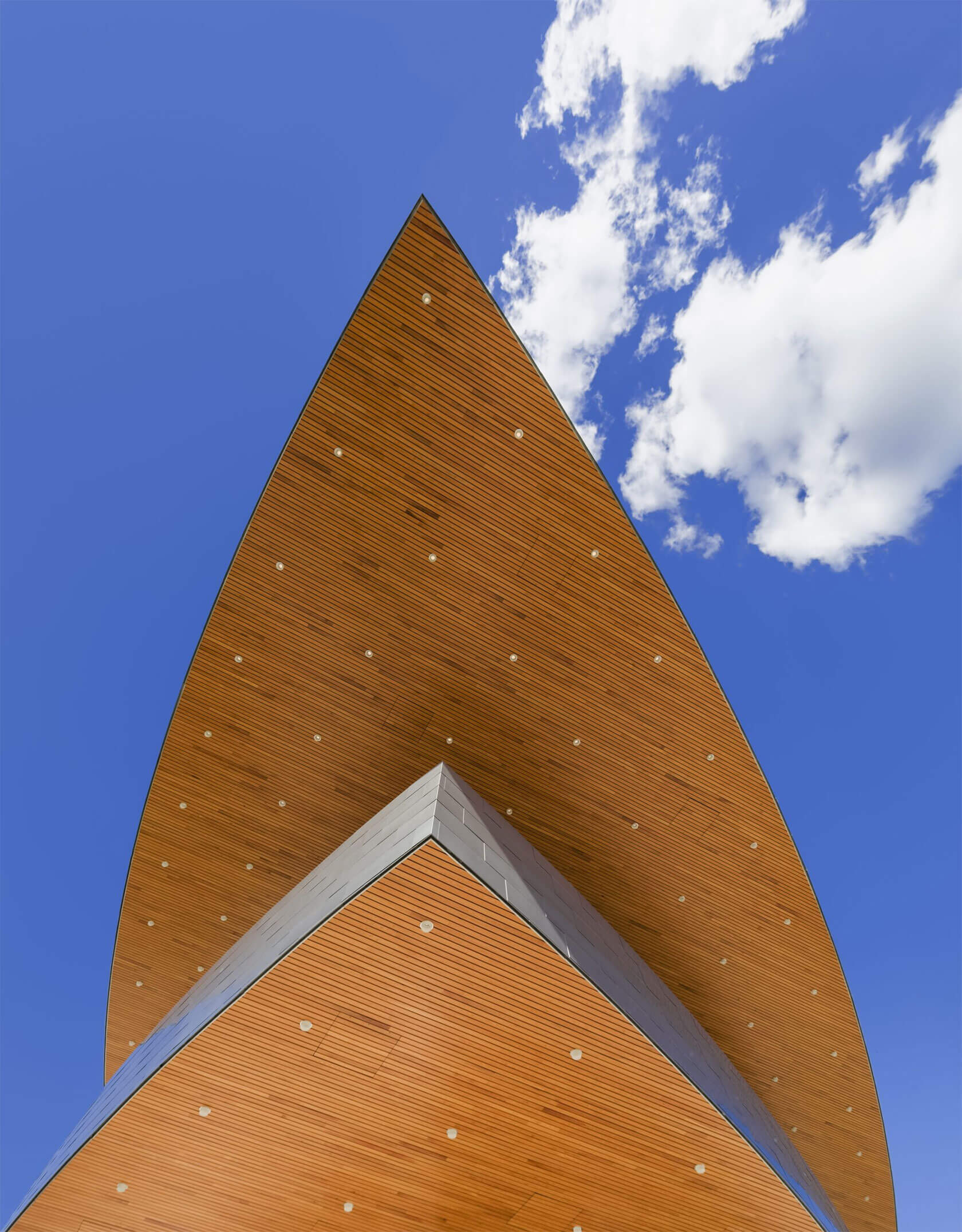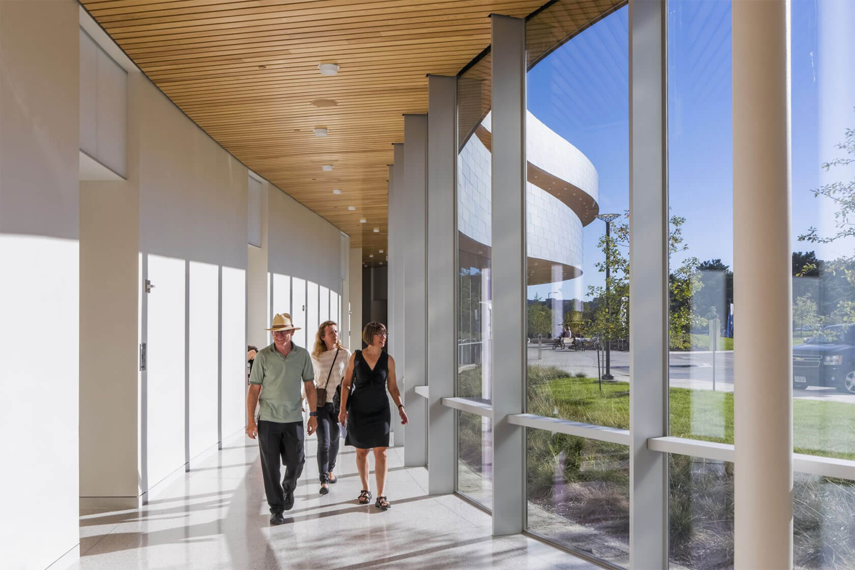 Completed in 2016, the new Hancher overlooks the Iowa River from a prominent hilltop site and greets visitors with sweeping horizontal lines that echo the surrounding landscape and the curve of the river. Cantilevered terraces extend dramatically over the lobby and second-level terrace, while expansive glass walls flood the interior with natural light and frame panoramic views of the campus and water below. At night, the building glows warmly, with its curved metal and glass forms inviting audiences inside.