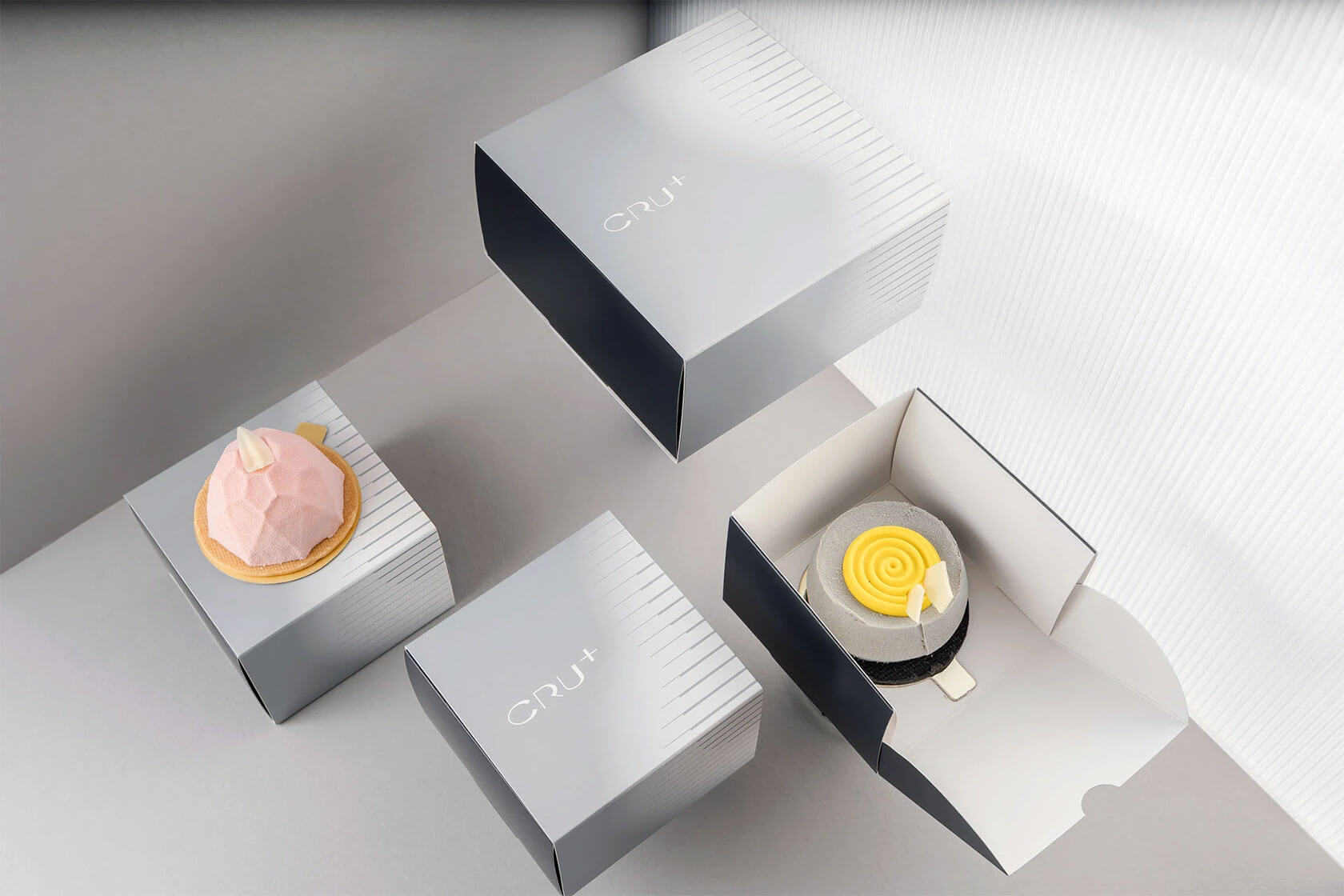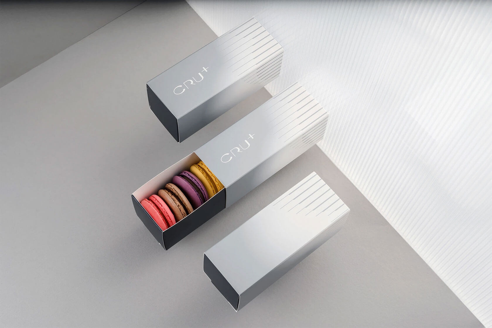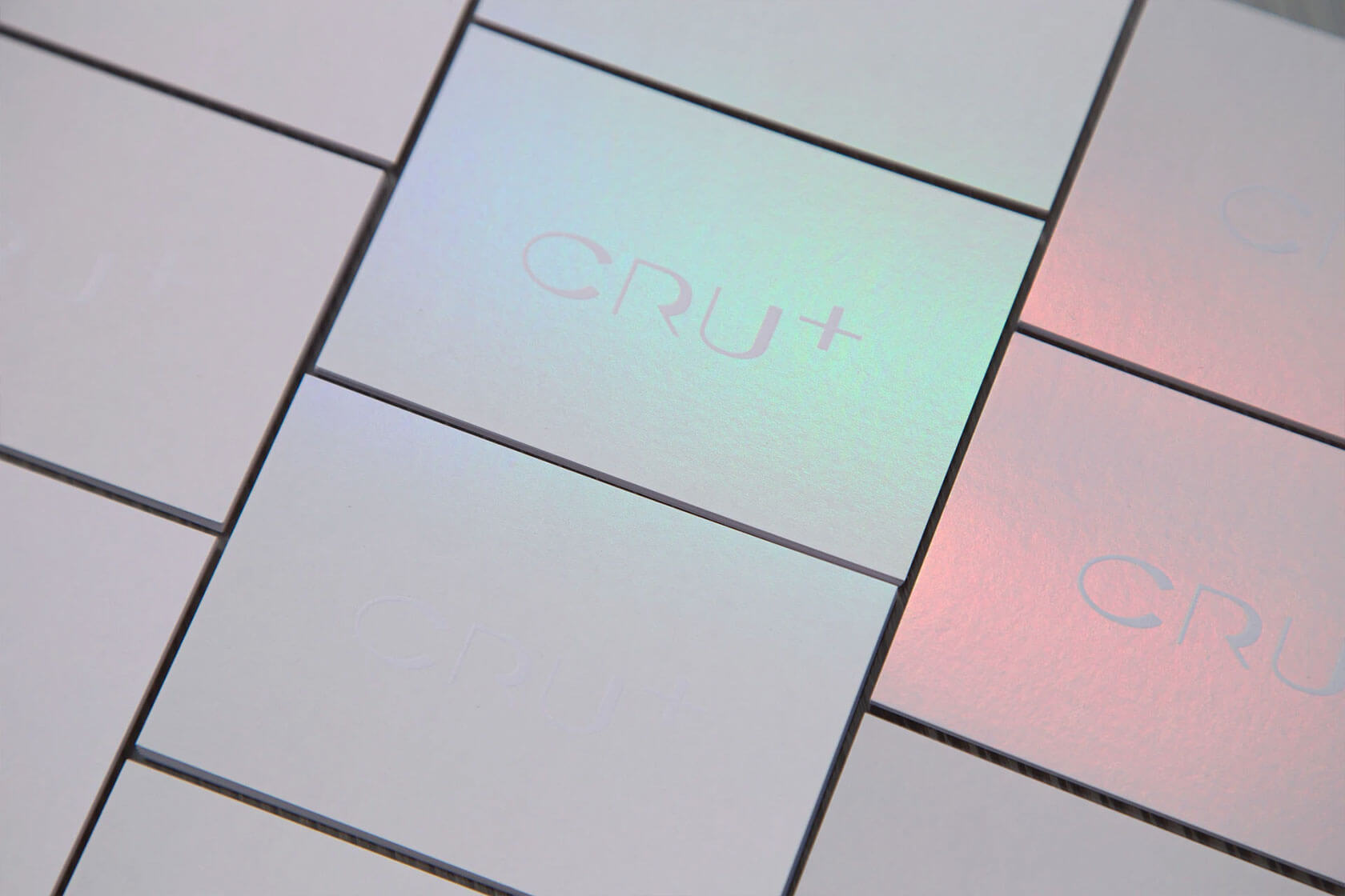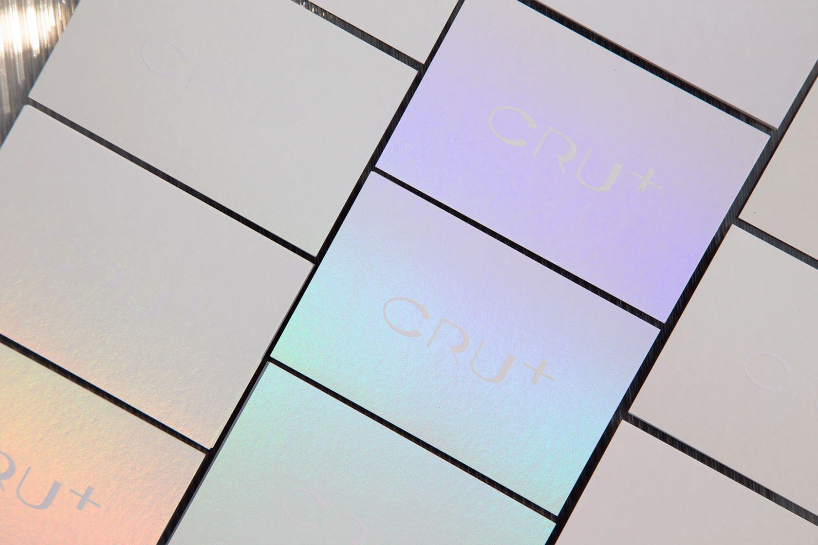 The minimalist wordmark is paired with iridescent print finishes, adding a subtle play of light and color. These shimmering details shift hues depending on the angle, creating a tactile and sensorial experience that aligns perfectly with Cru+’s refined patisserie offerings and fashion-forward surroundings.