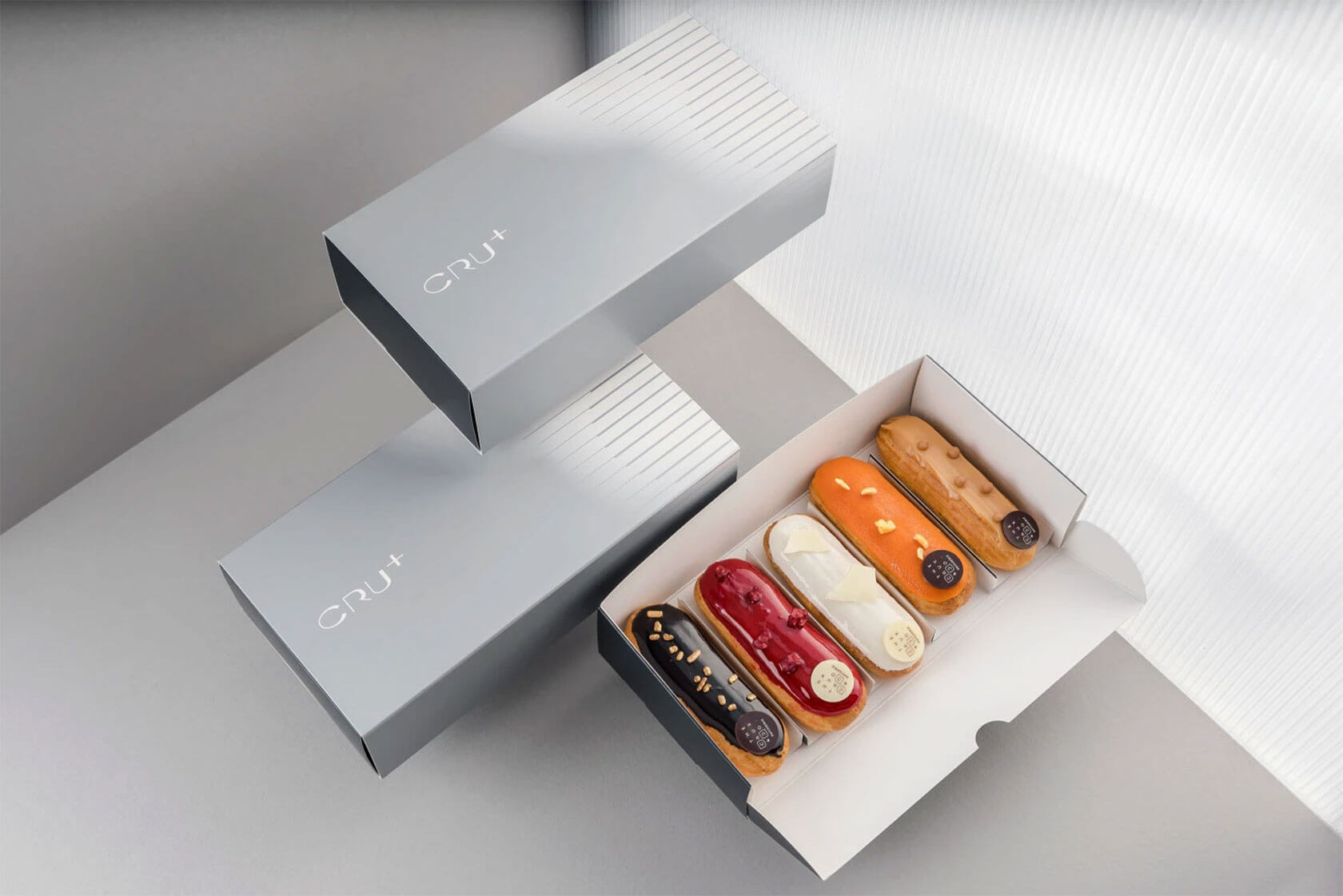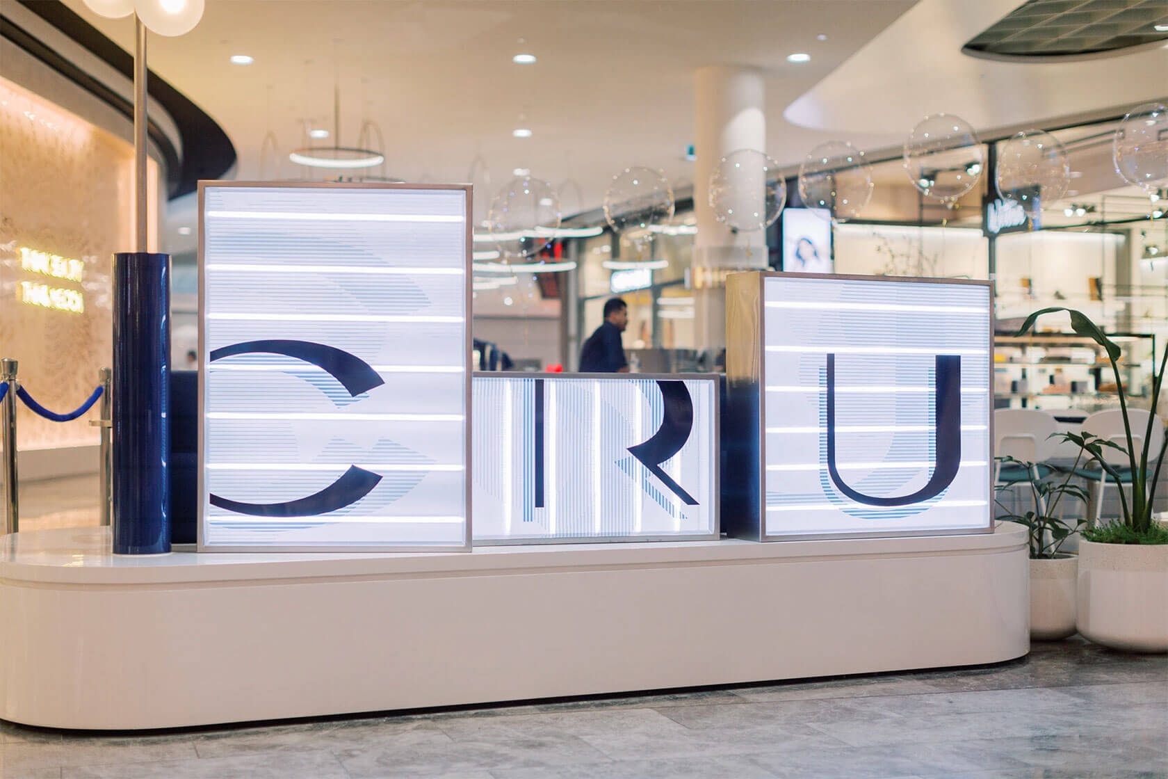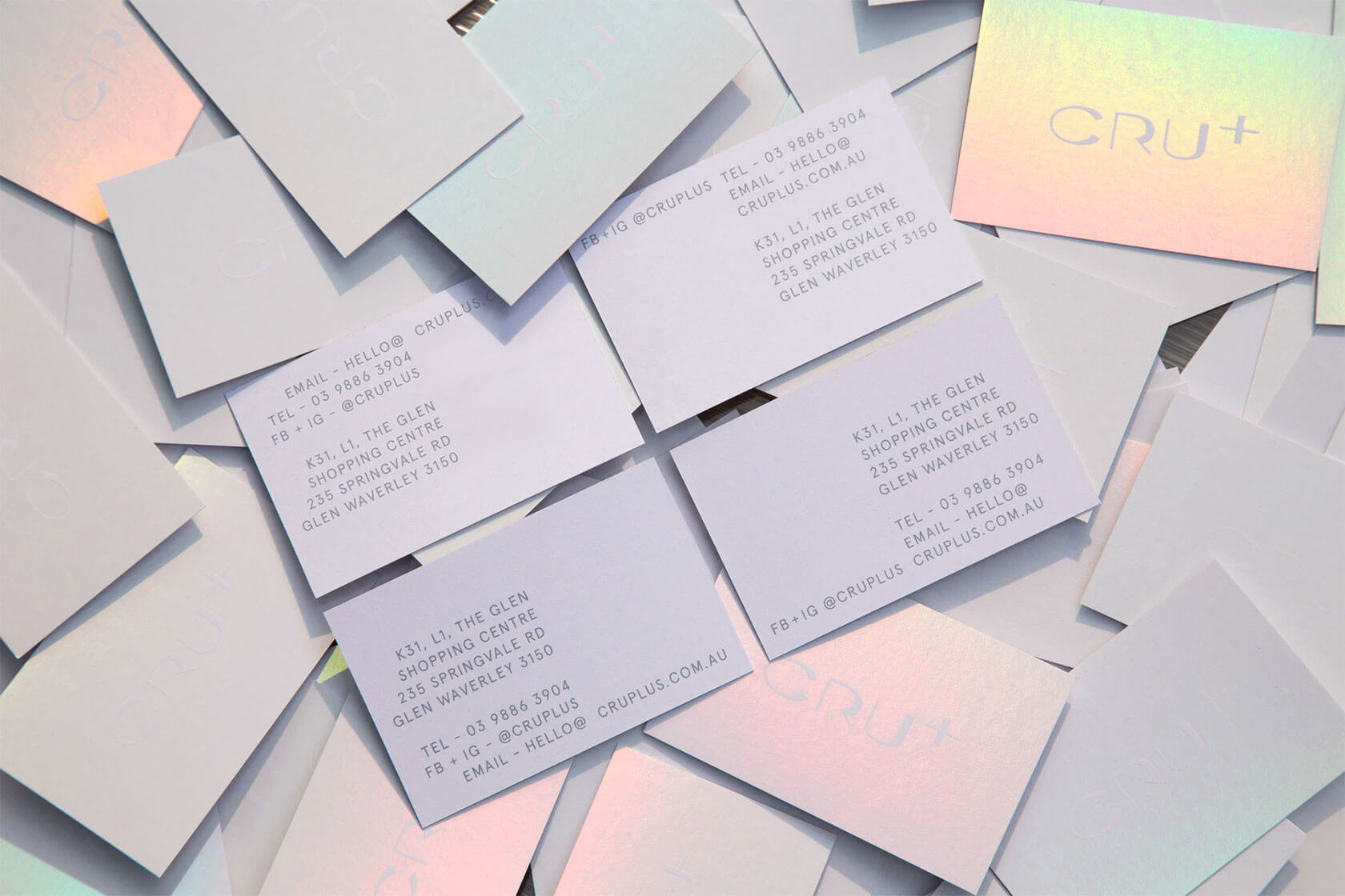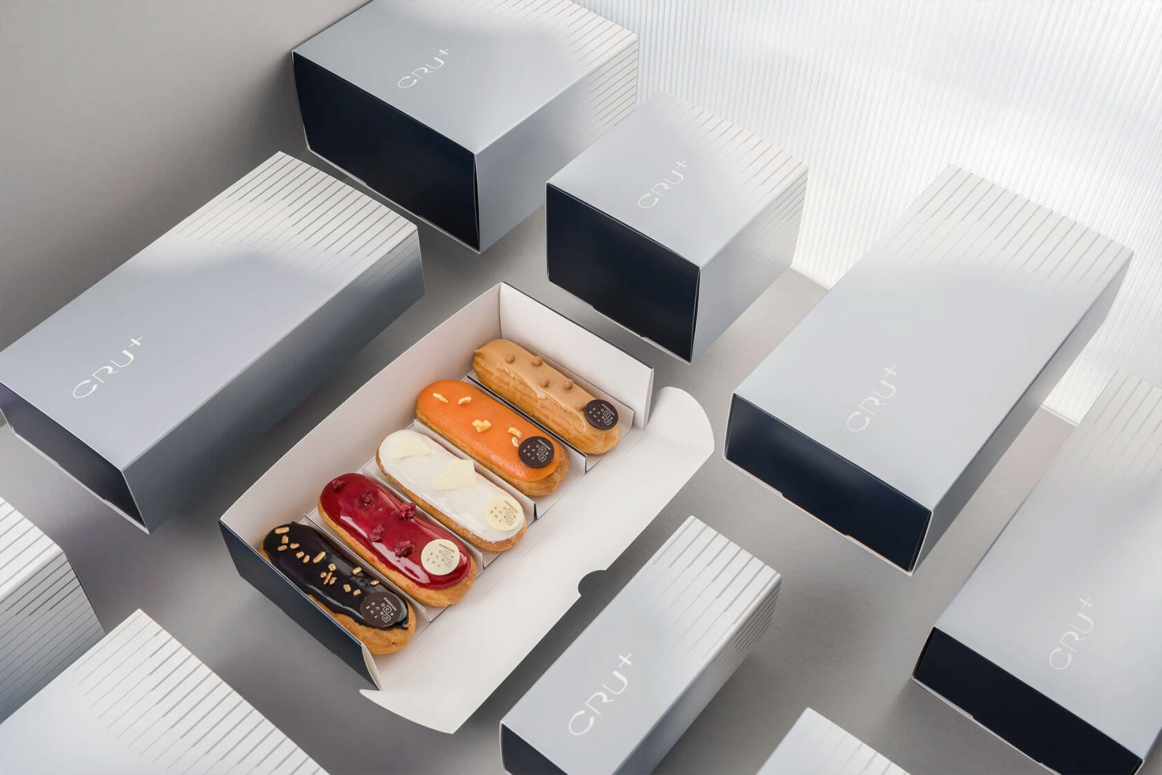 The minimalist wordmark is paired with iridescent print finishes, adding a subtle play of light and color. These shimmering details shift hues depending on the angle, creating a tactile and sensorial experience that aligns perfectly with Cru+’s refined patisserie offerings and fashion-forward surroundings.