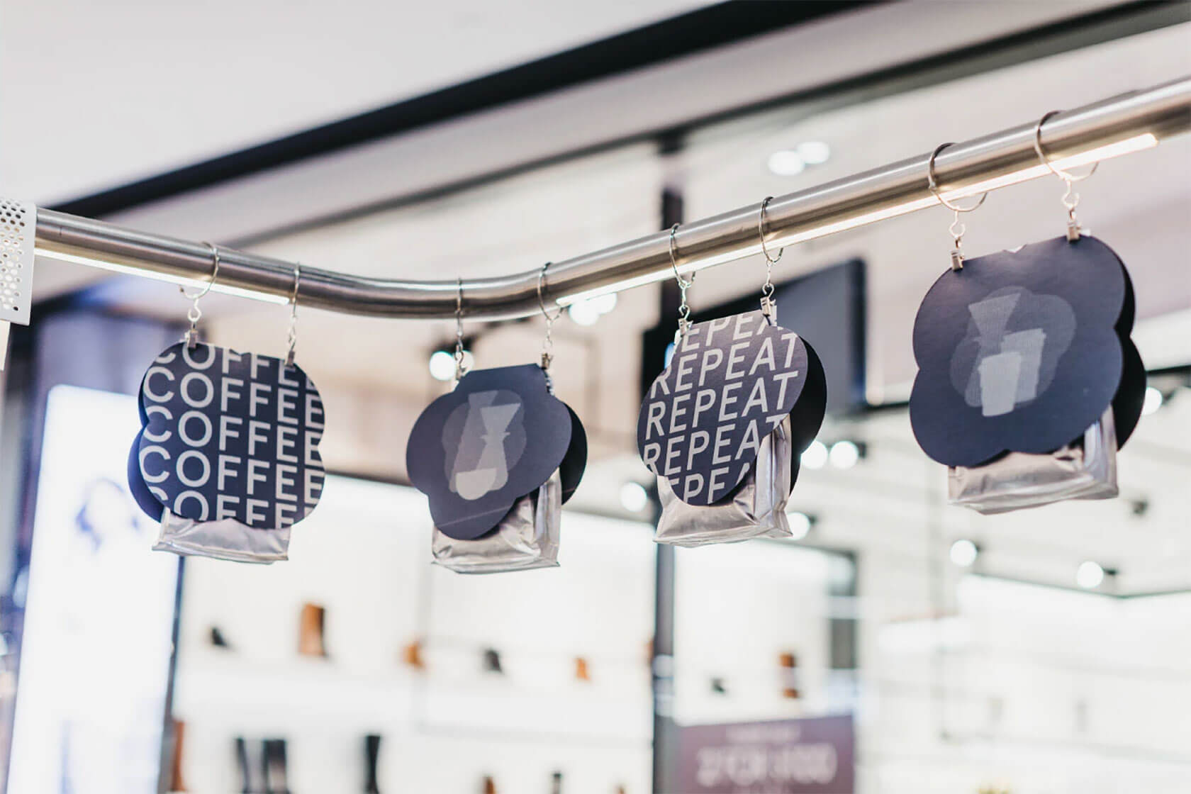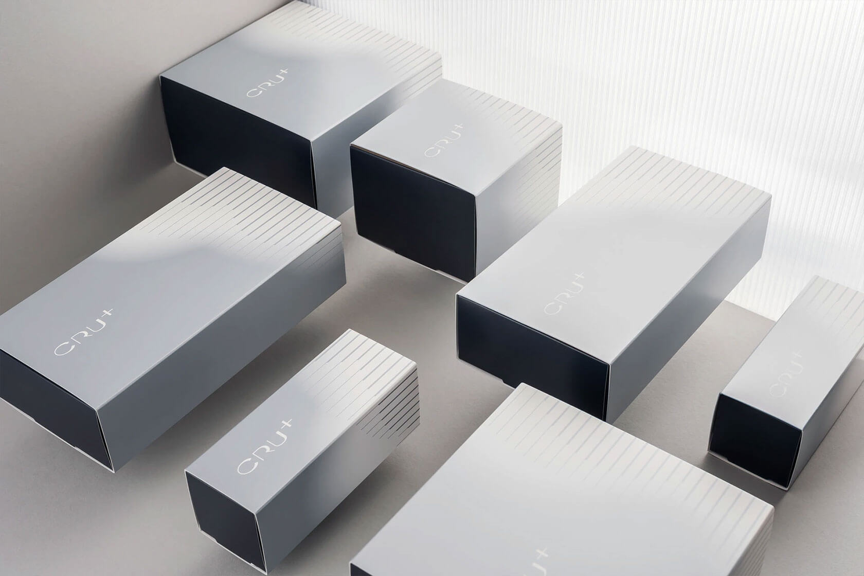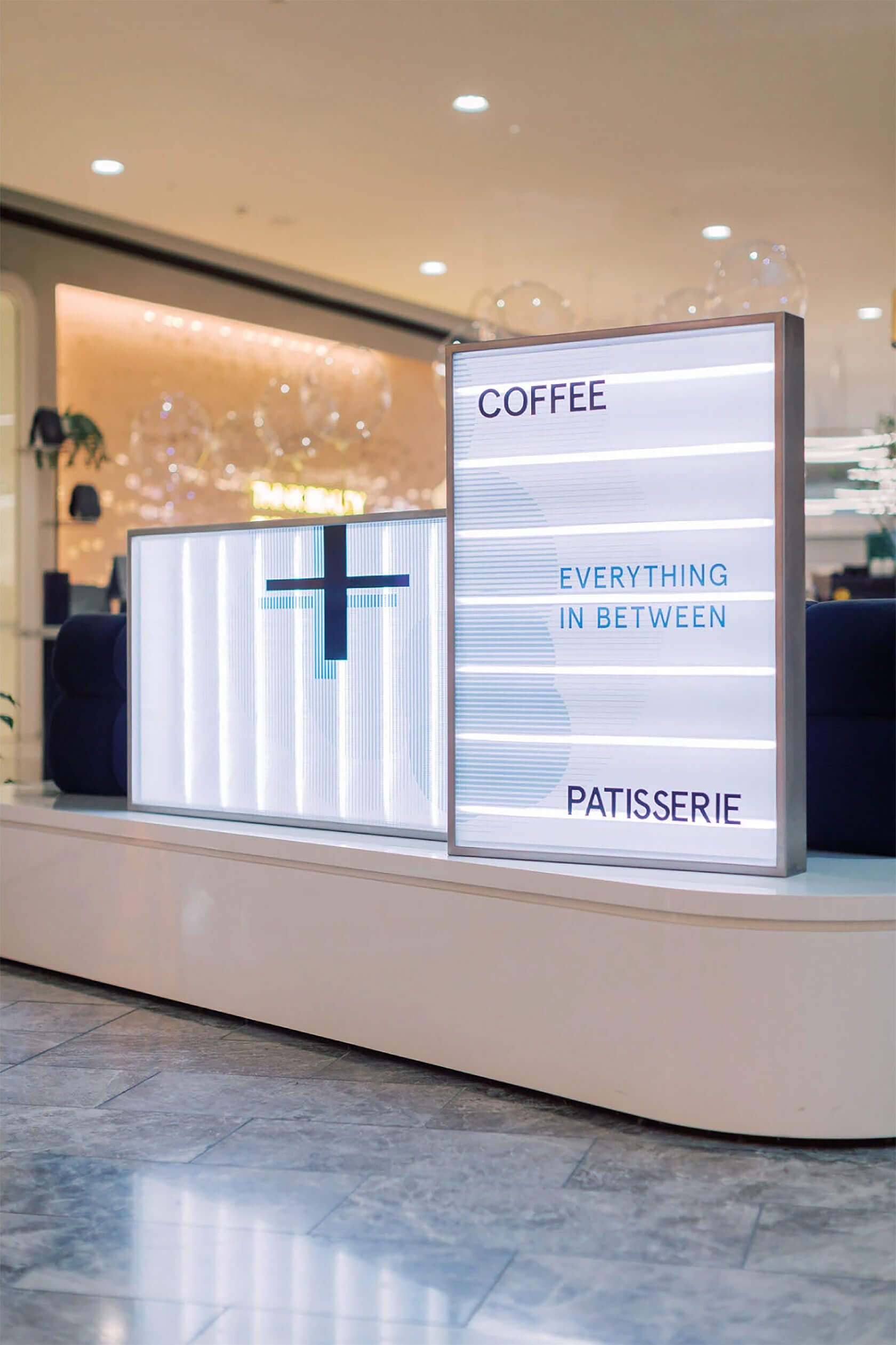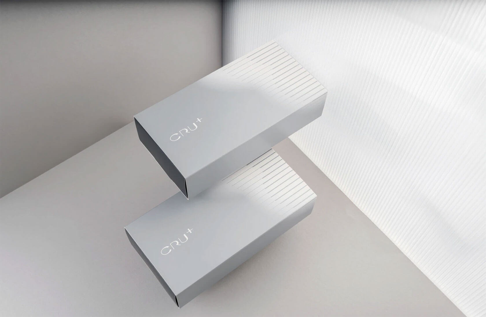 The minimalist wordmark is paired with iridescent print finishes, adding a subtle play of light and color. These shimmering details shift hues depending on the angle, creating a tactile and sensorial experience that aligns perfectly with Cru+’s refined patisserie offerings and fashion-forward surroundings.