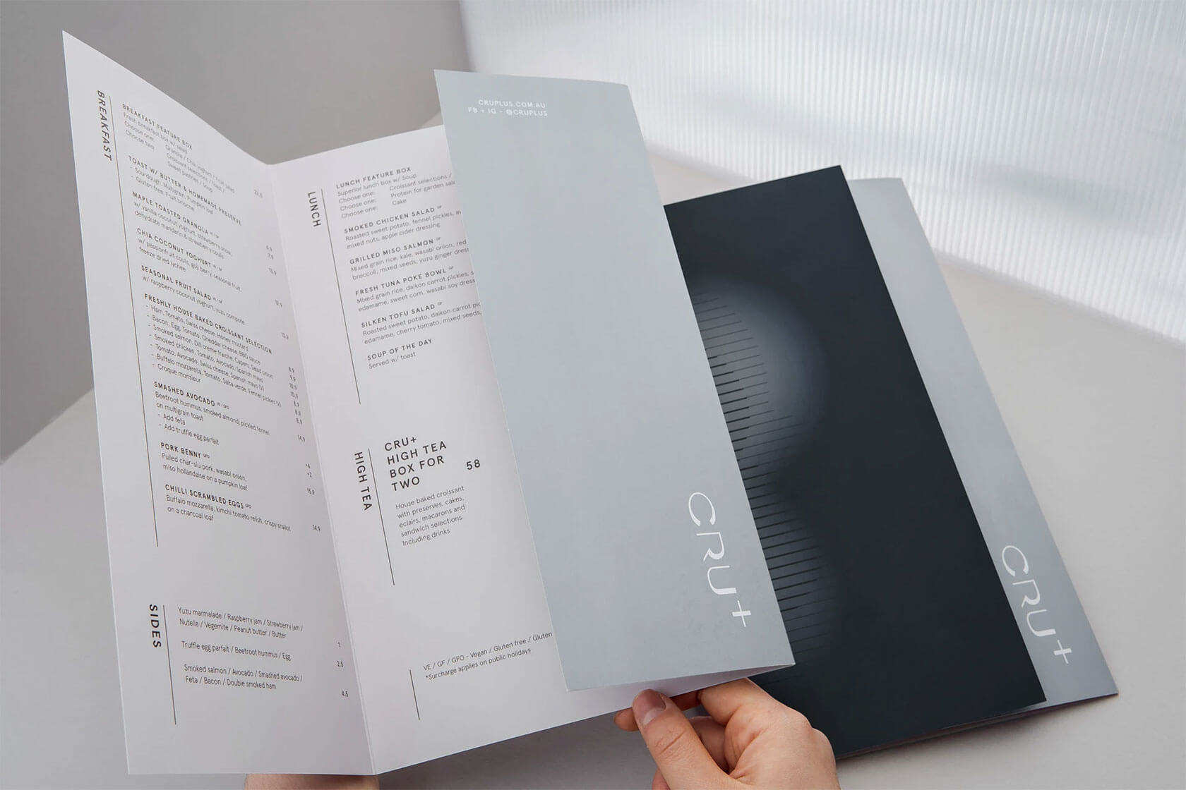 Melbourne-based Hue Studio has created a refined and luminous brand identity for Cru+, a café and patisserie nestled among high-end lifestyle and fashion boutiques in a local mall. As the sister venue to The Crux & Co, Cru+ carries forward the same sense of design sophistication and culinary elegance, expressed here through a more modern aesthetic.