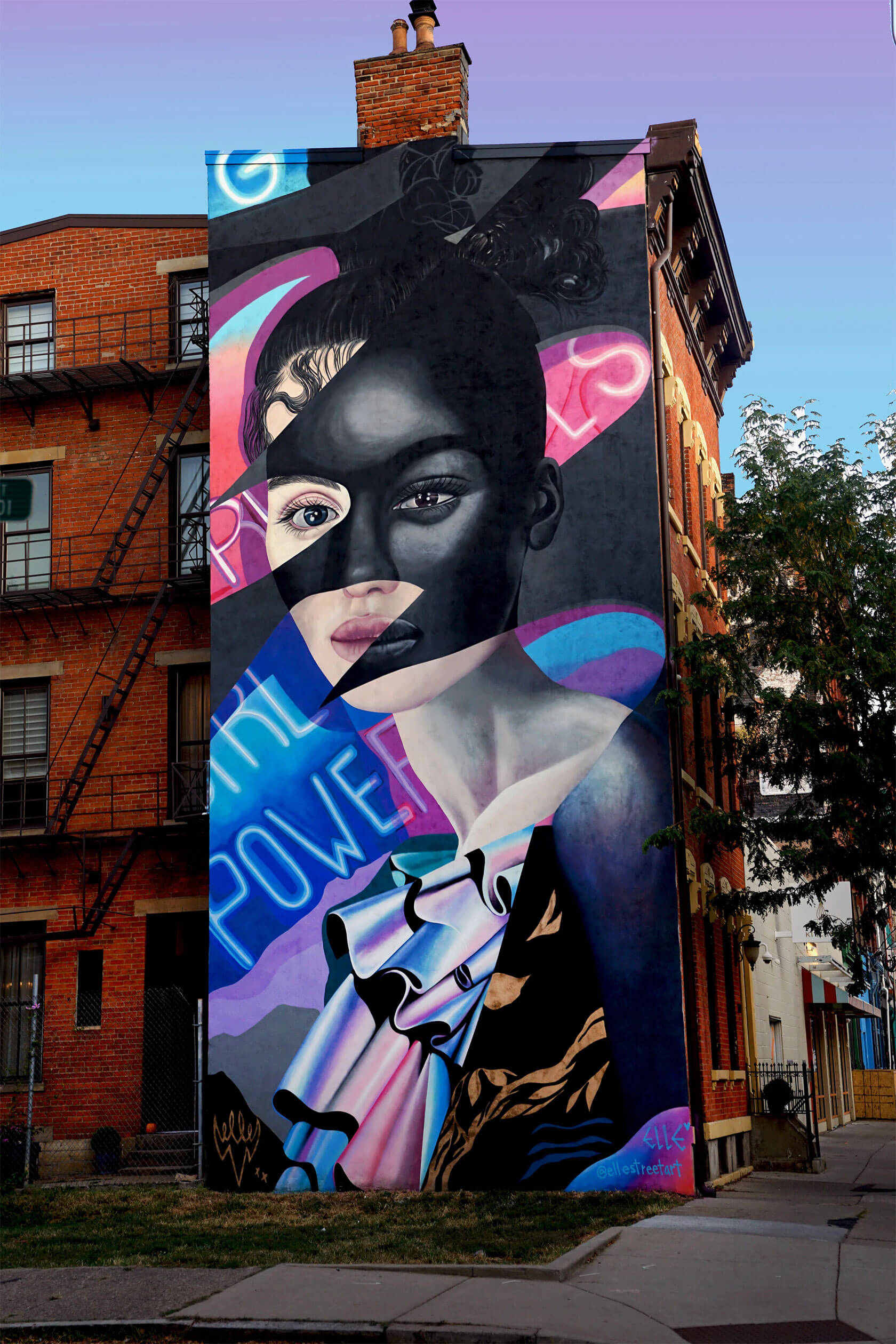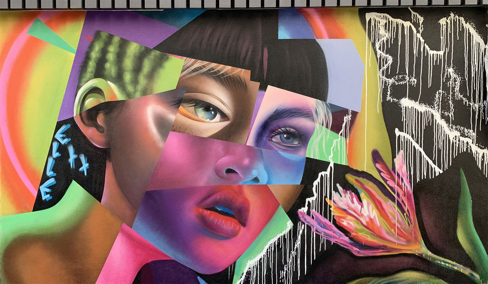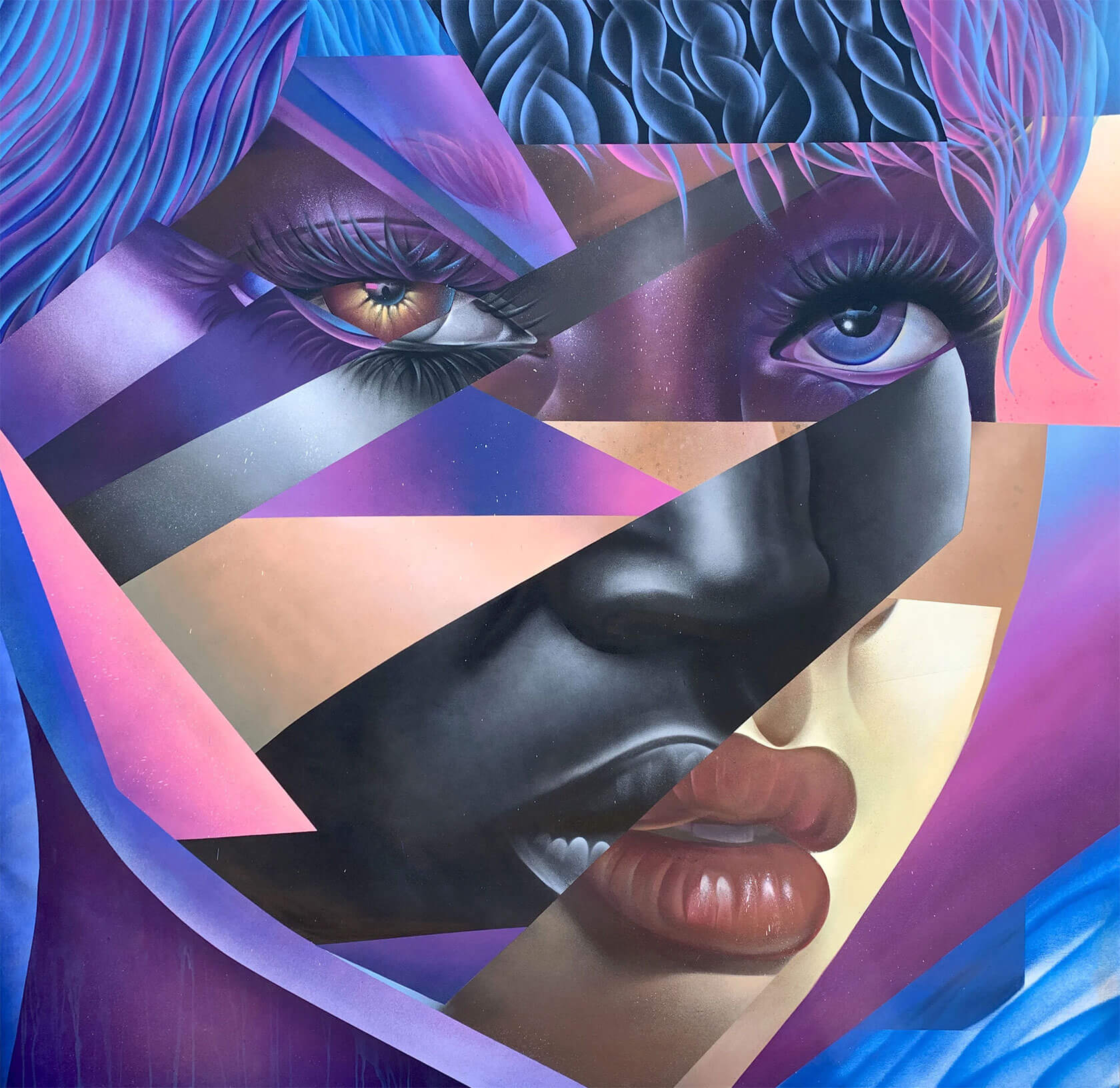 Once an underground graffiti figure in New York, Brooklyn-based artist ELLE is now celebrated worldwide for her bold murals and gallery work. With a distinctive collage style, she assembles portraits from fractured planes, blending hyperrealism with neon tones, surreal textures and symbolic overlays.