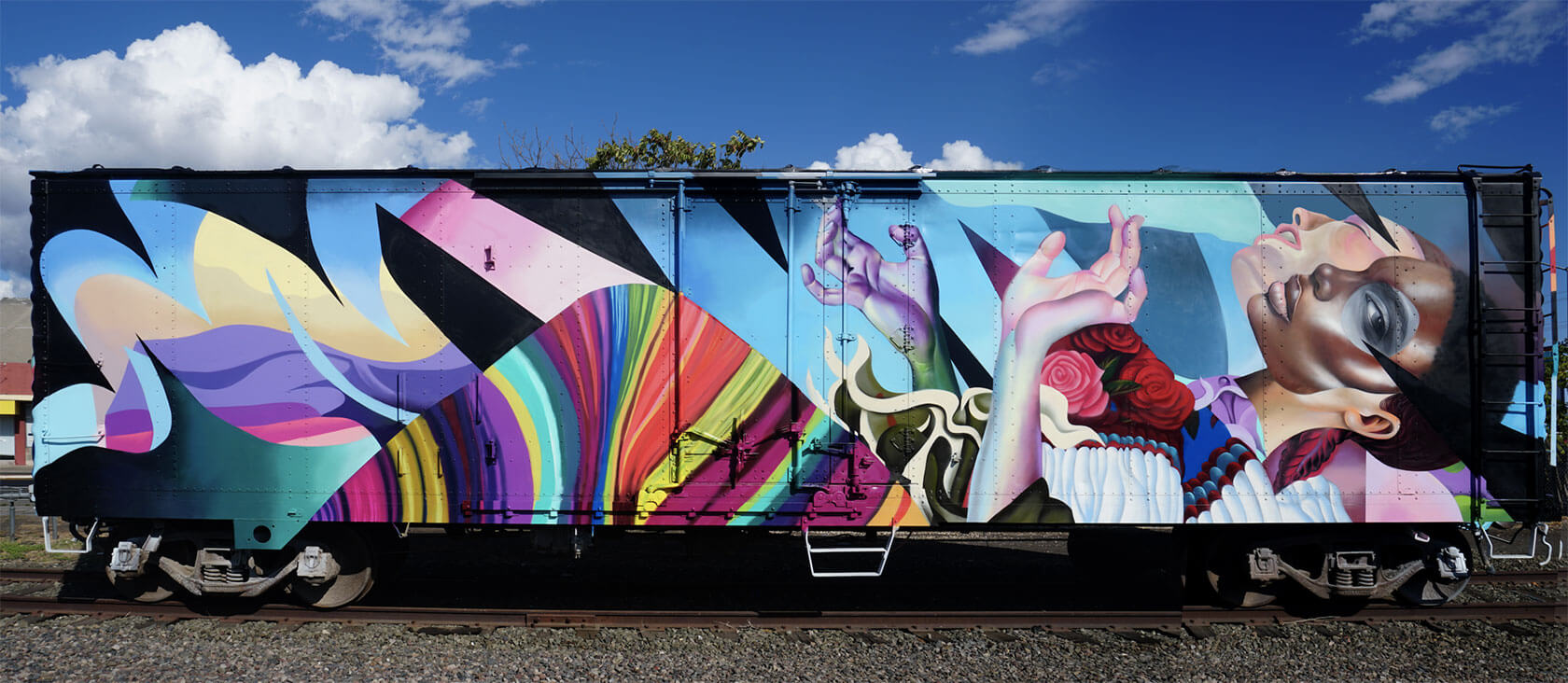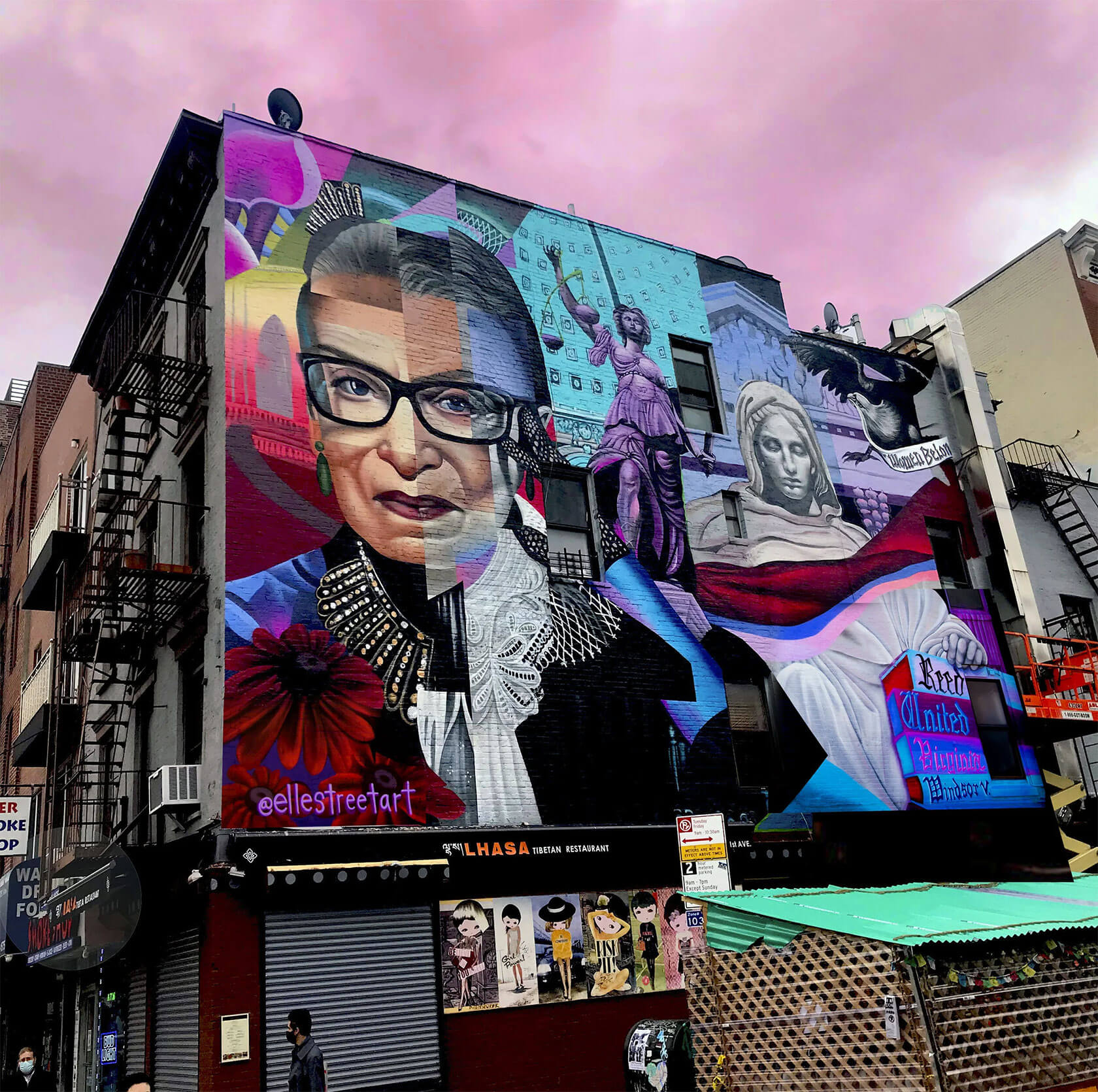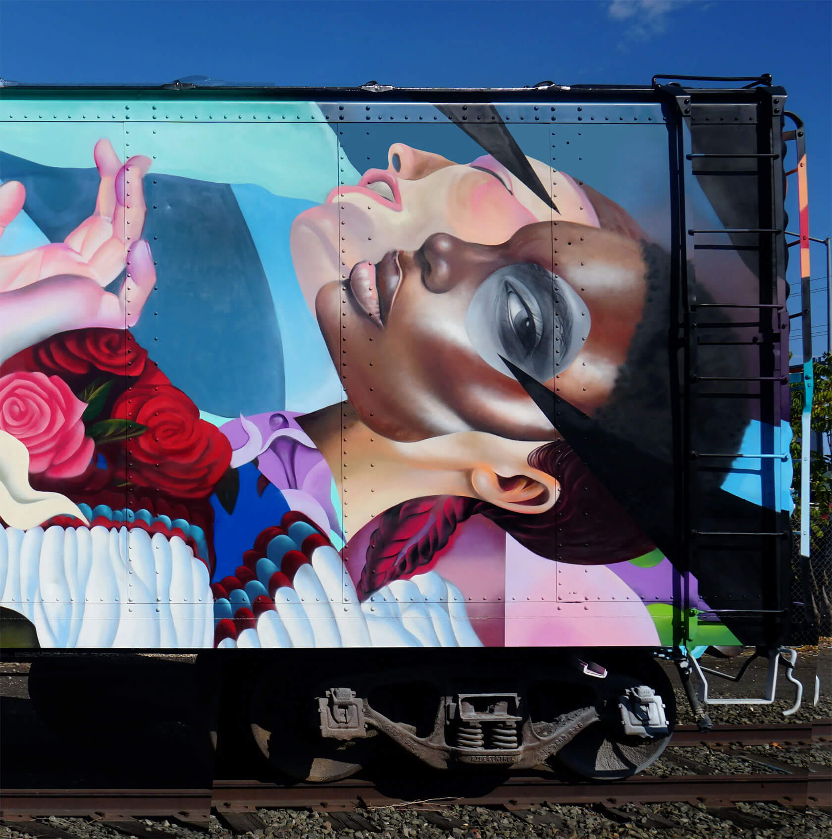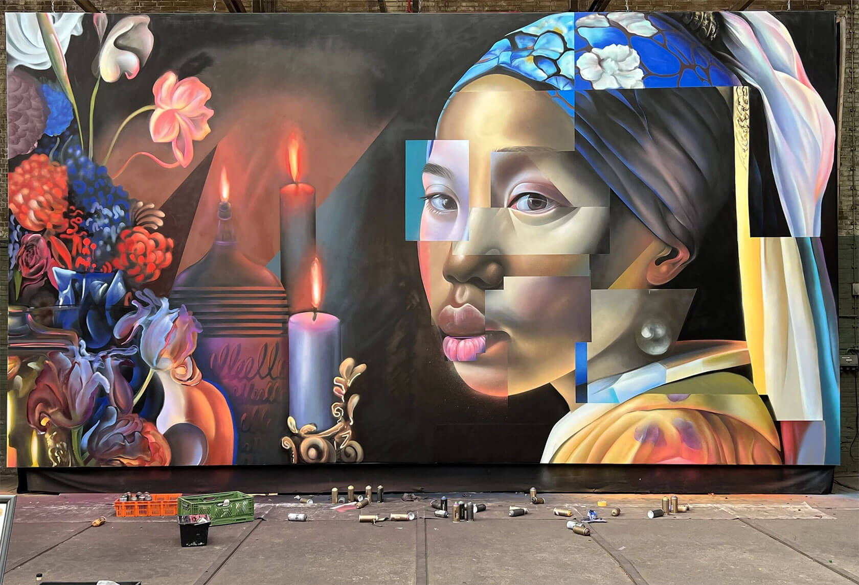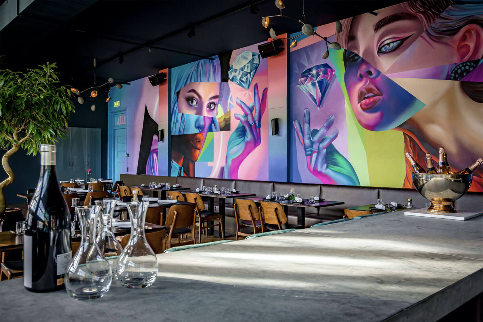She works across outdoor murals, indoor installations and canvas pieces, painting everything from towering façades in New York, Berlin and Melbourne to immersive interiors that transform restaurants and galleries into cinematic environments.