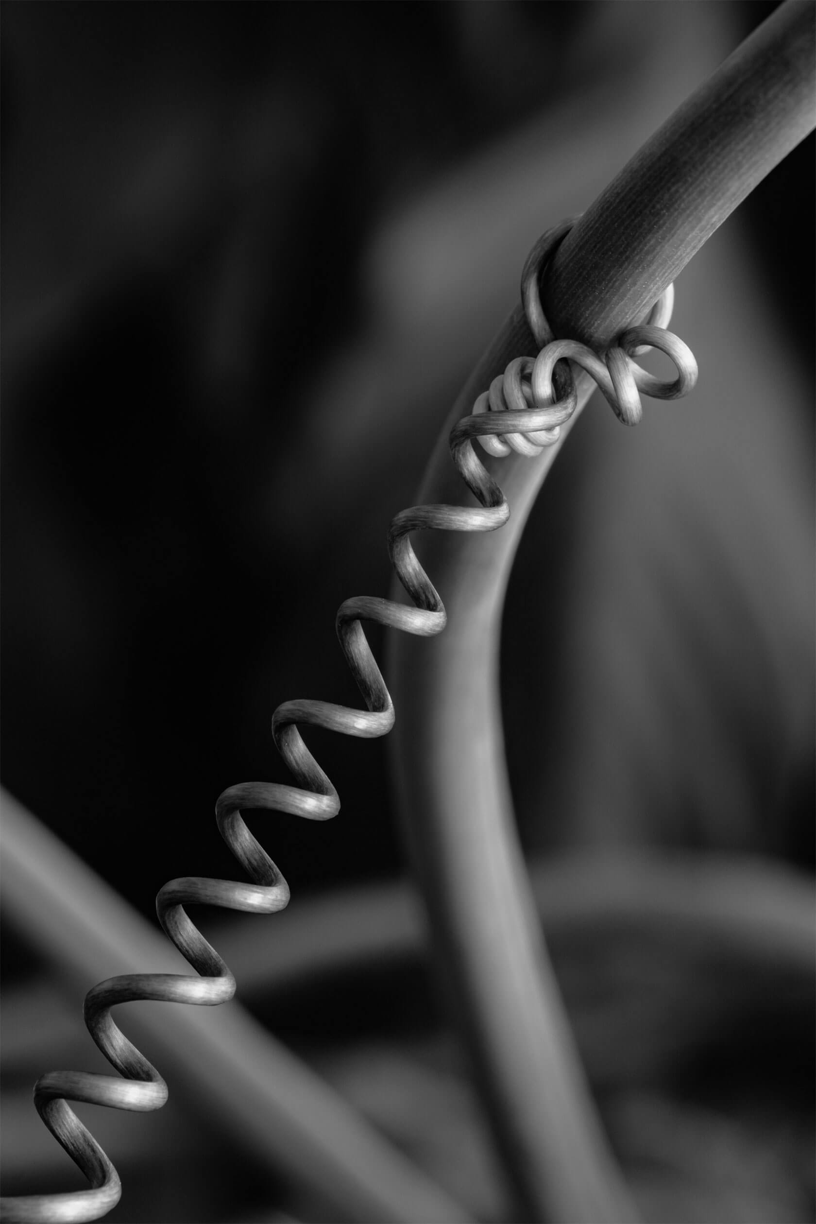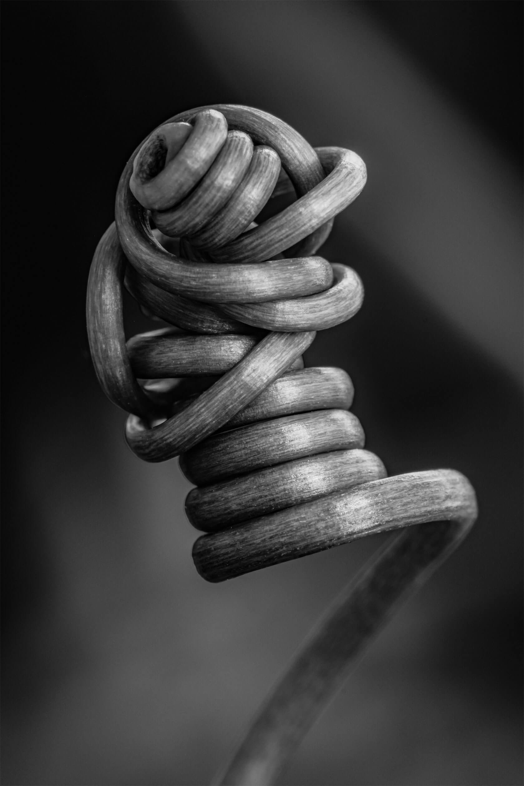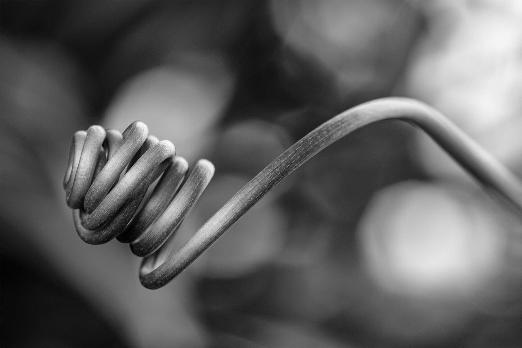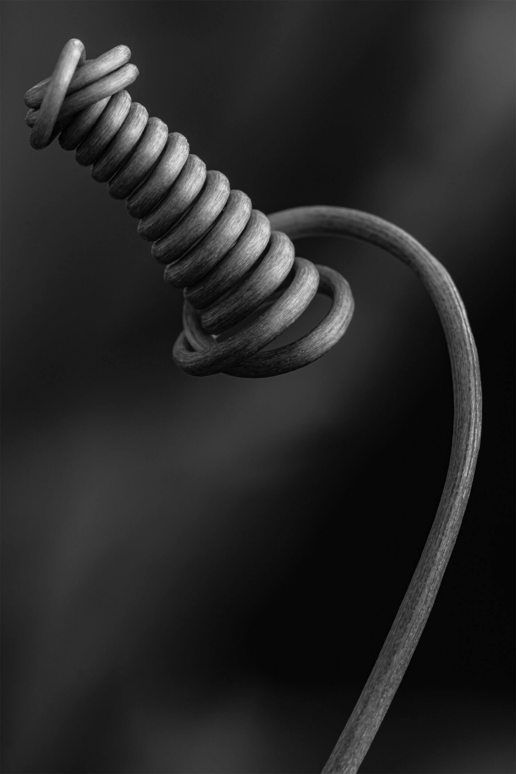 The project focuses on the intricate tendrils that allow climbing plants to anchor, stretch and thrive. Bruno isolates these tiny structures with striking clarity, revealing elegant loops, tight coils and striking geometric twists. Stripped of color, each frame becomes a sculptural study in texture and rhythm, highlighting the organic engineering behind the plant’s growth.
