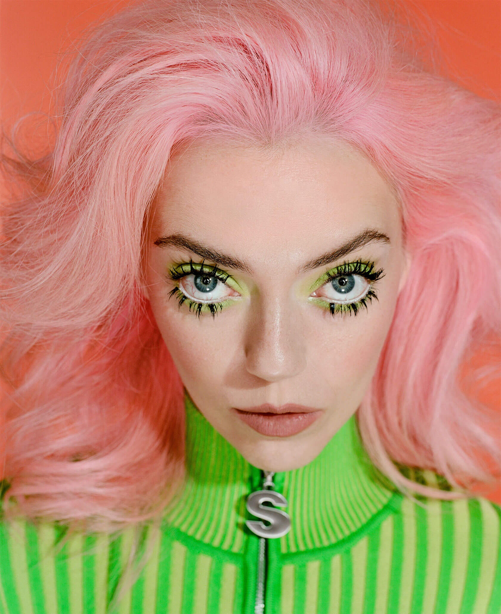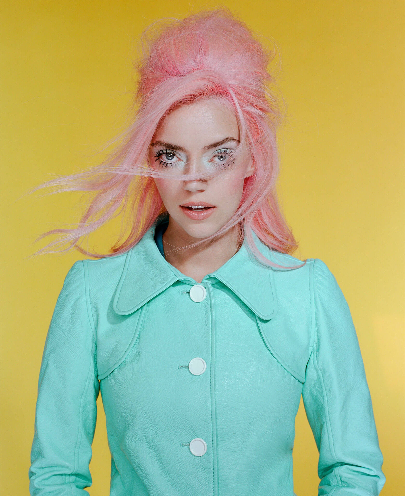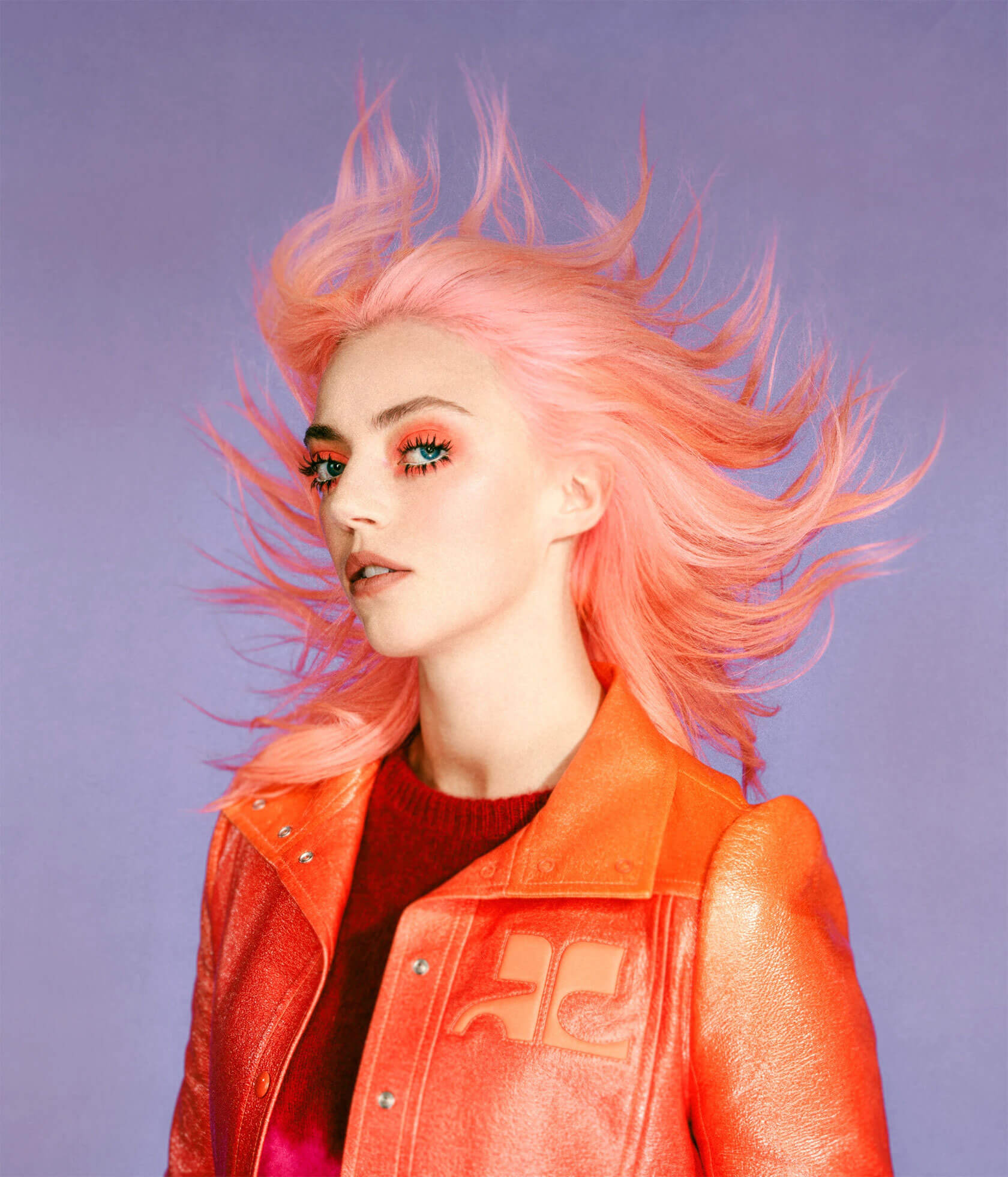Every image in the dazzling series is a celebration of bold contrasts and maximalist energy. Pyper’s pastel-pink hair and expressive makeup are paired with saturated backdrops in punchy yellows, greens and purples, while the styling ranges from ’60s mod to sporty streetwear.