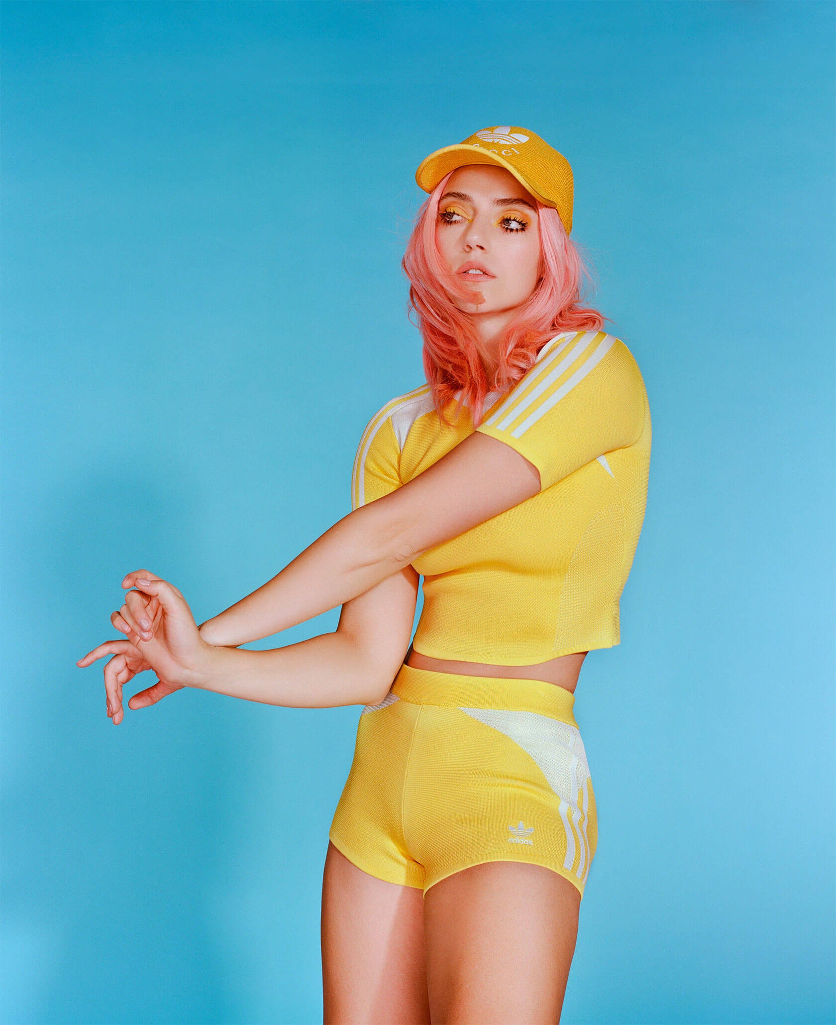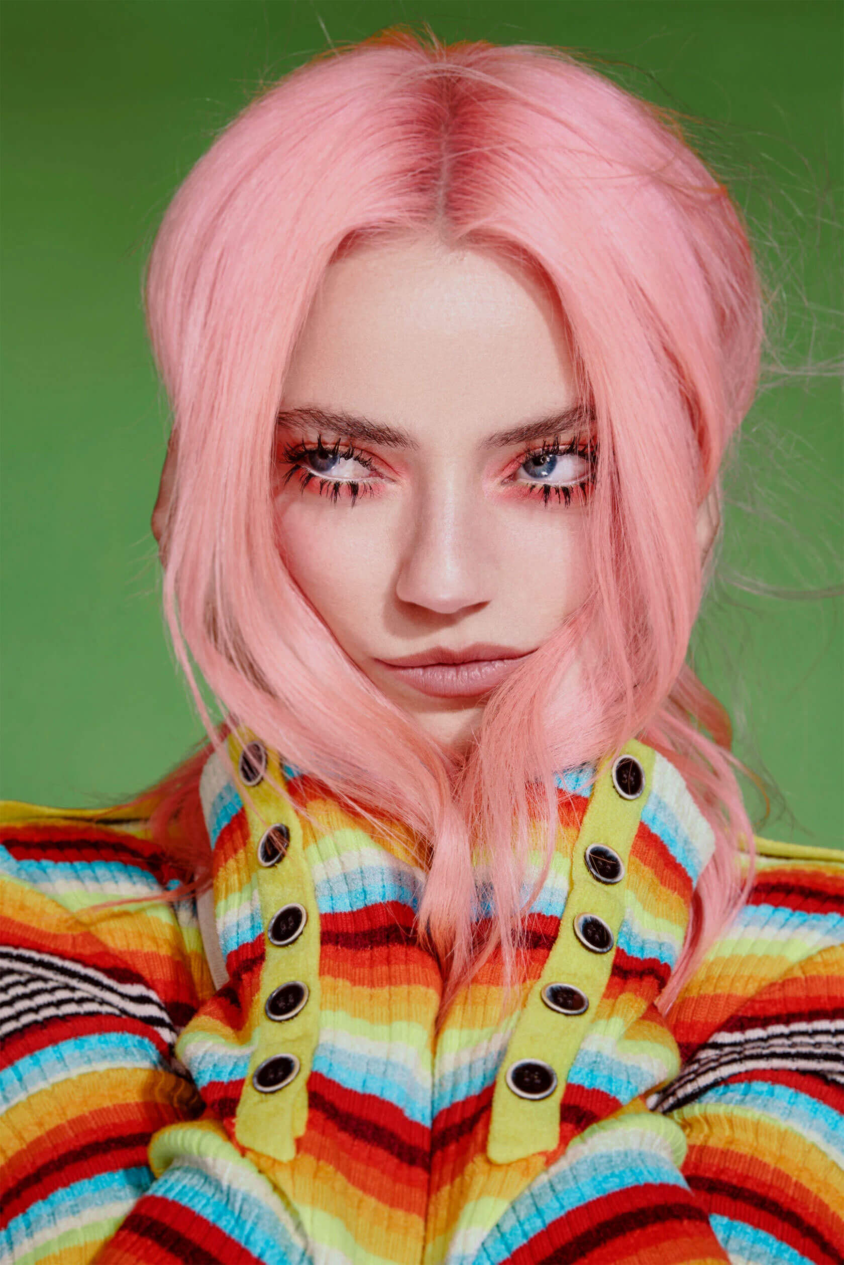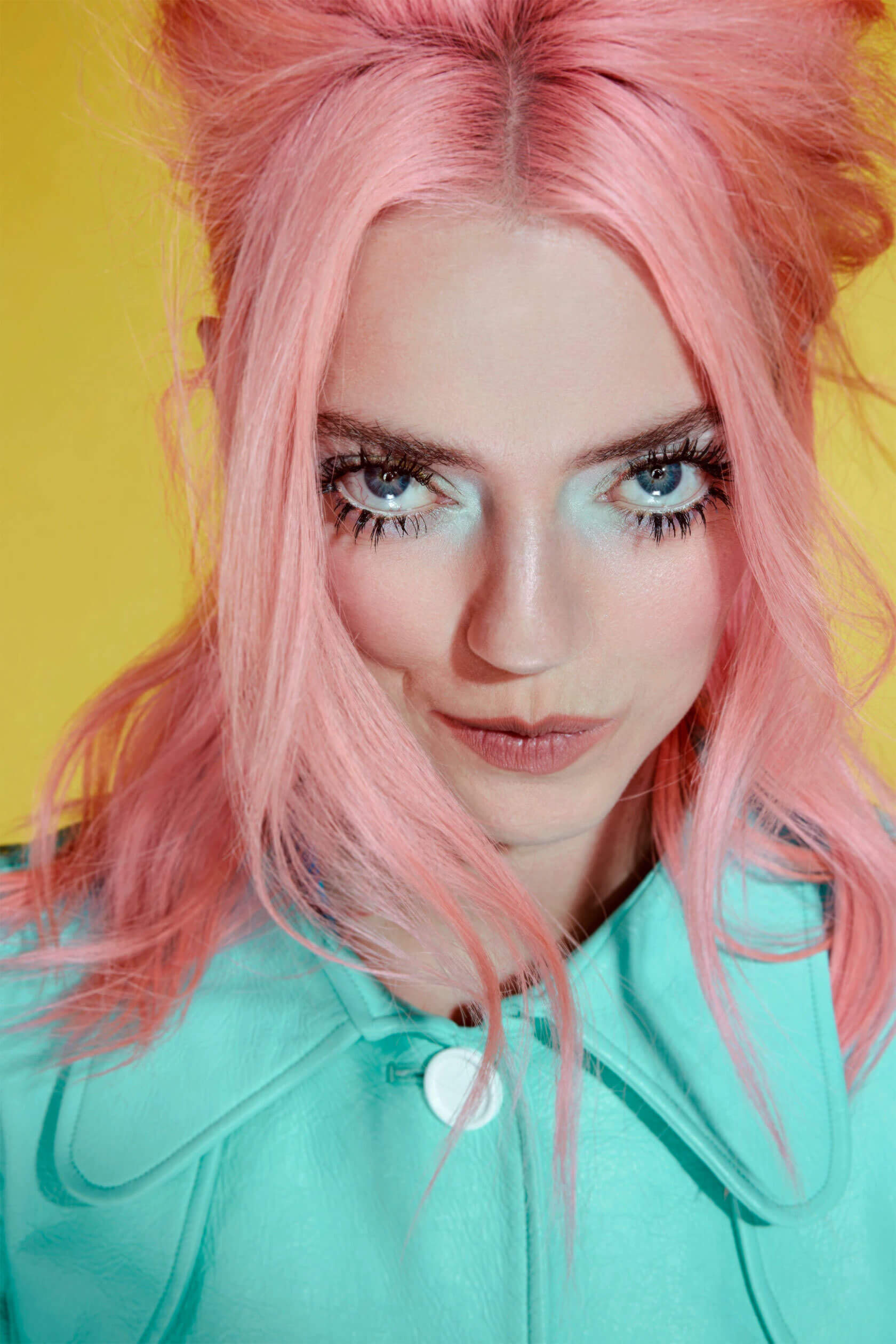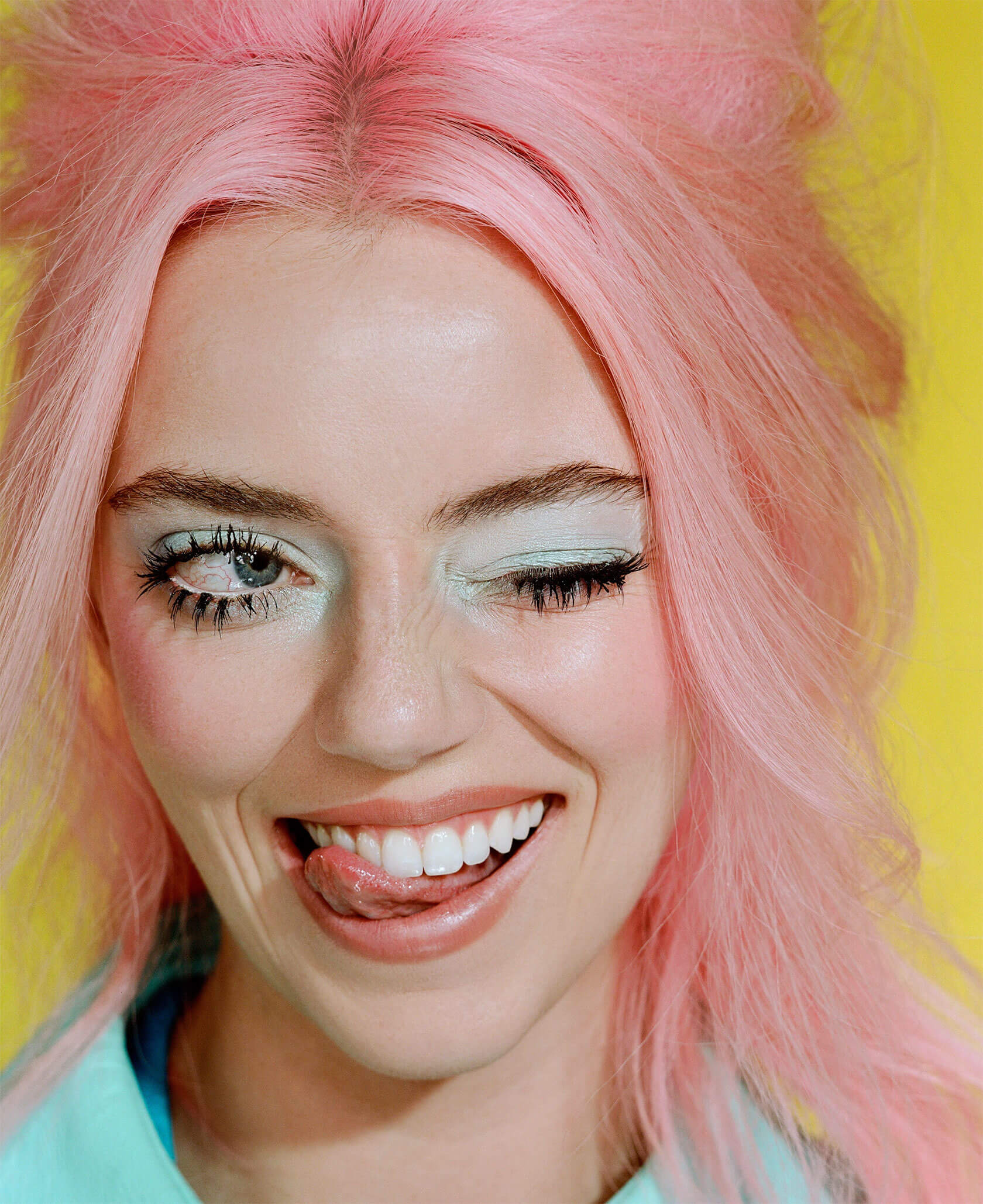 Every image in the dazzling series is a celebration of bold contrasts and maximalist energy. Pyper’s pastel-pink hair and expressive makeup are paired with saturated backdrops in punchy yellows, greens and purples, while the styling ranges from ’60s mod to sporty streetwear.