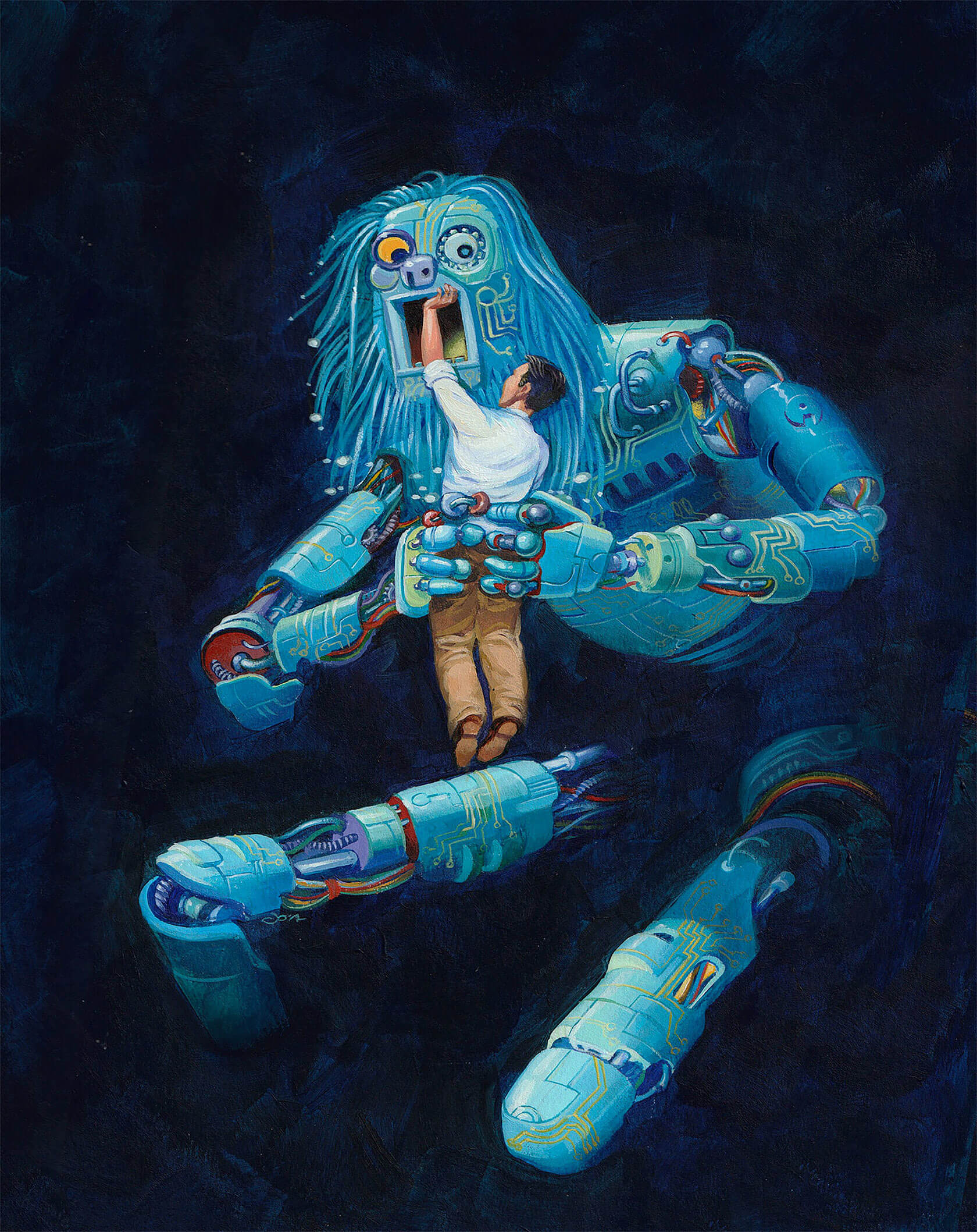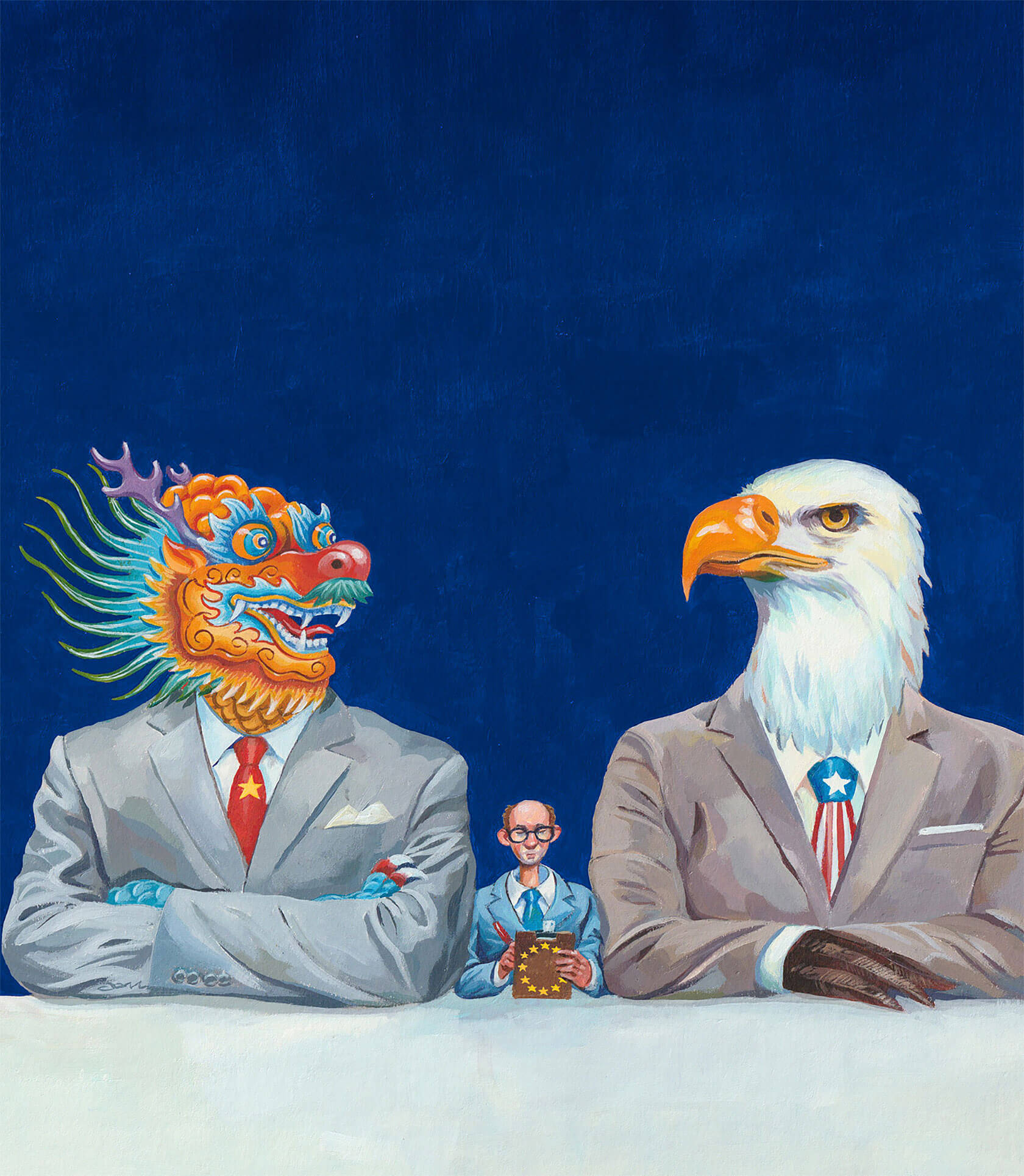 Over the years, he’s created over 150 covers for The Economist and hundreds more for publications like Newsweek, Foreign Affairs and The New Statesman. His paintings often balance vibrant color with biting commentary, whether depicting geopolitical tensions through mythic creatures and caricatures or exploring technology, art and identity through dreamlike symbolism.