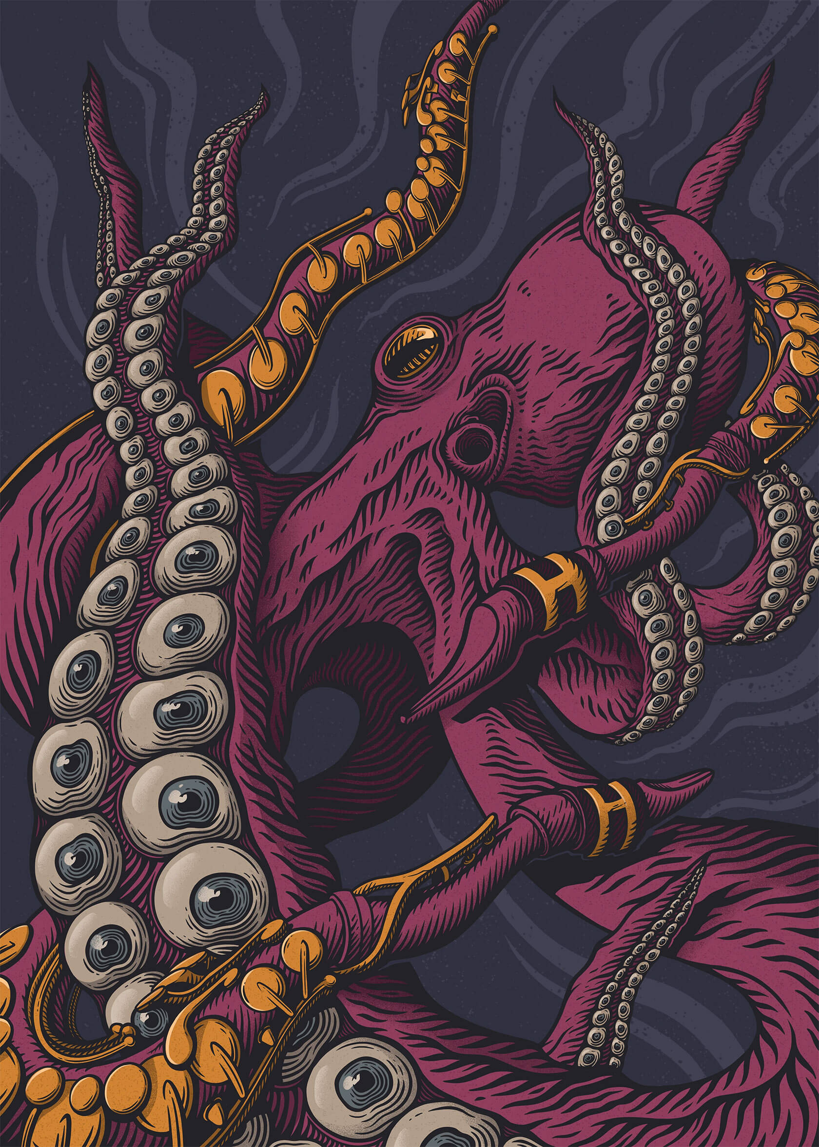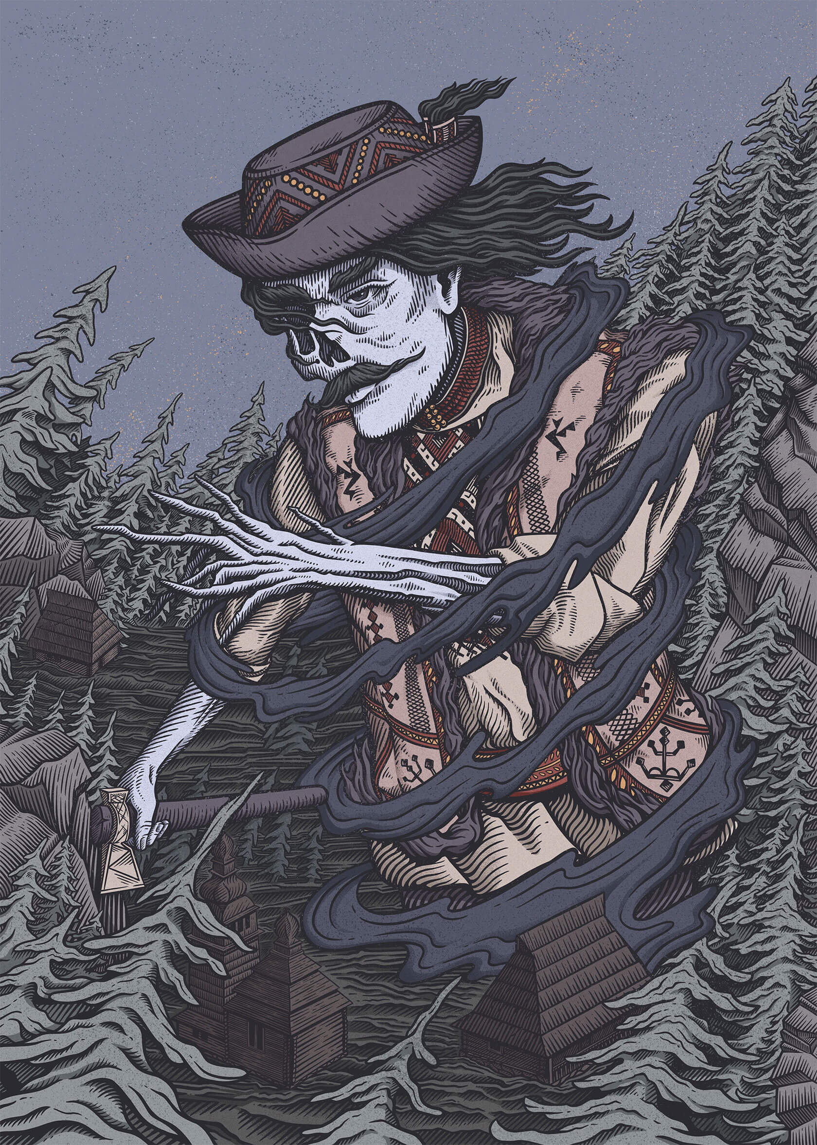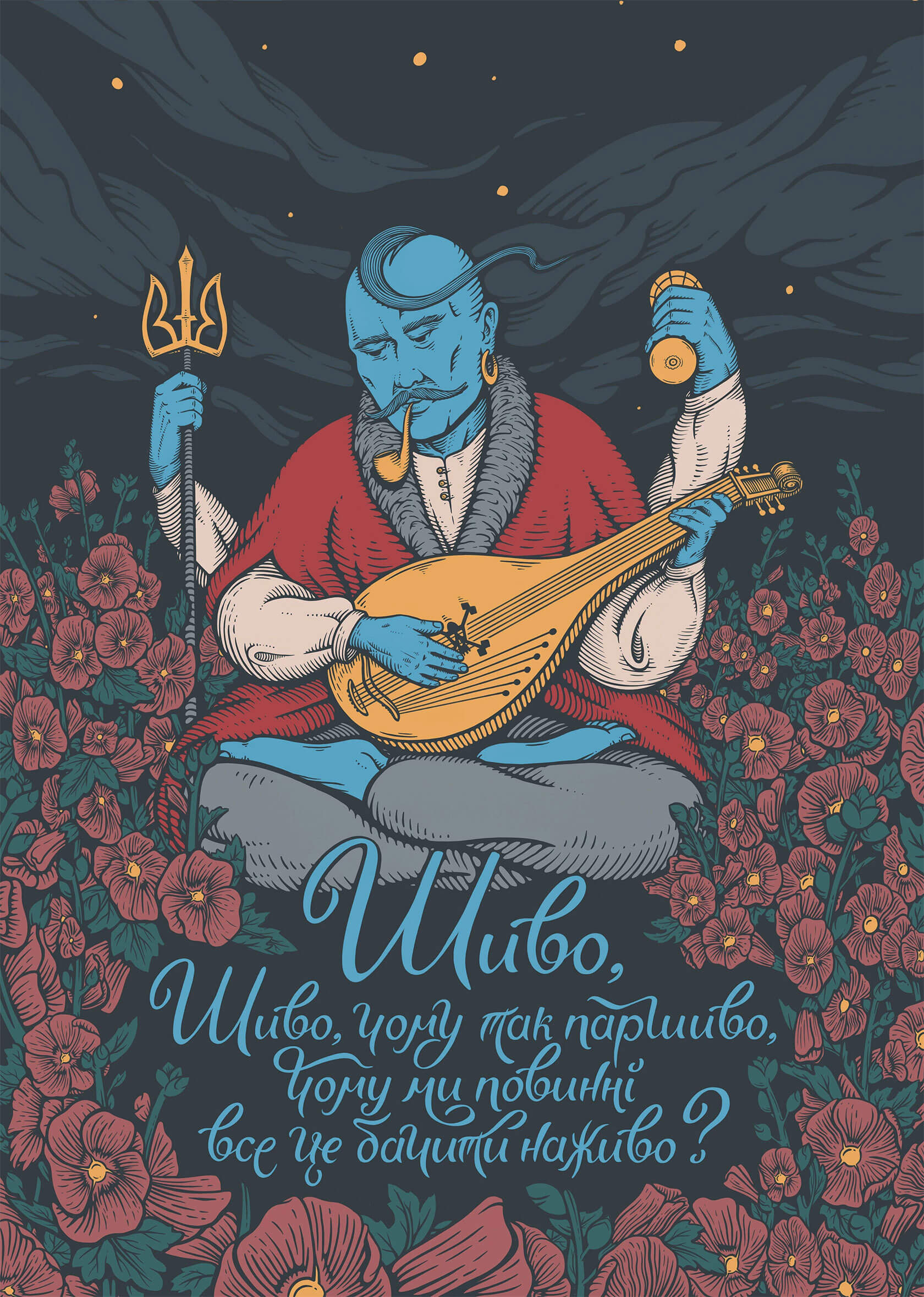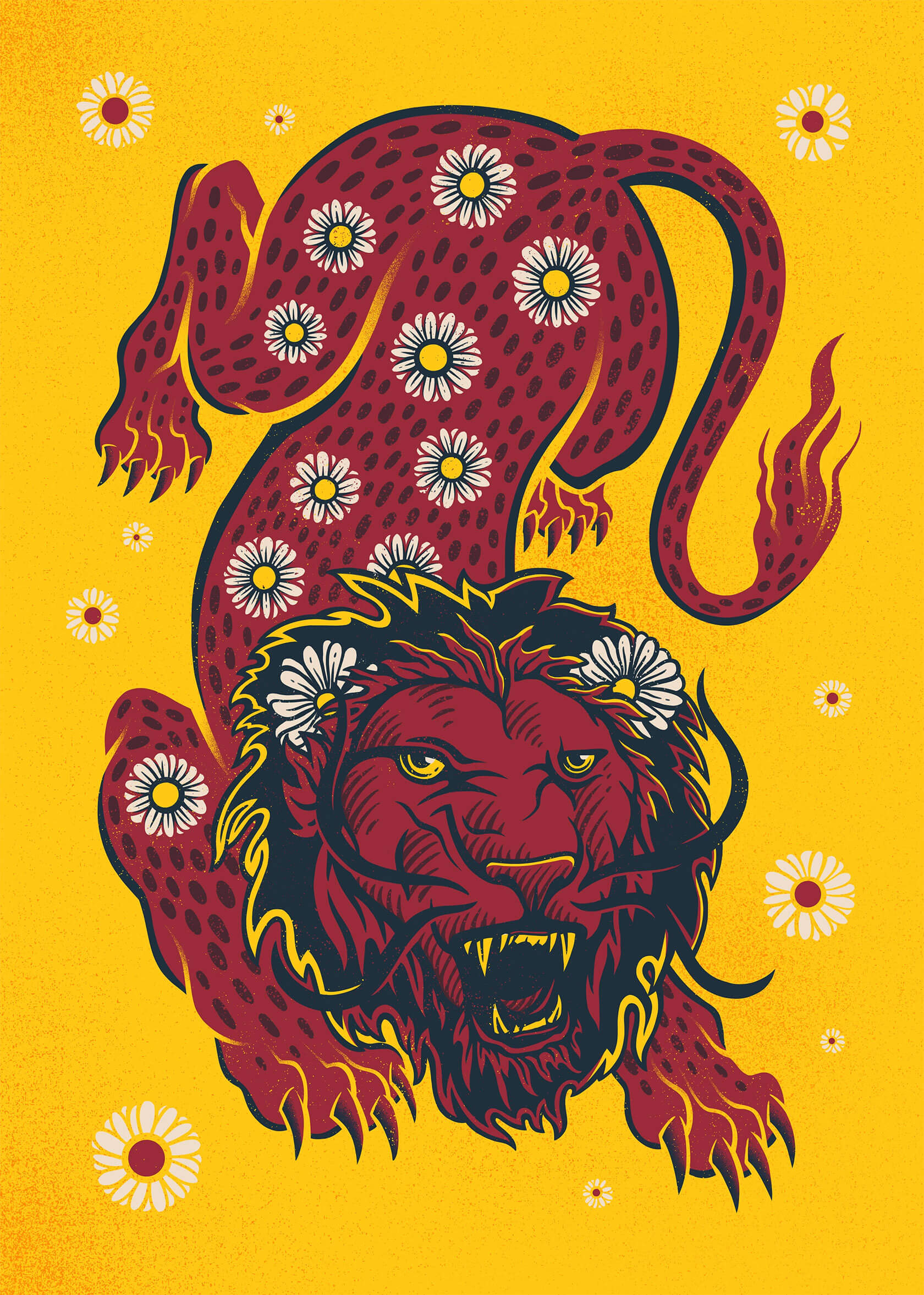 From concert posters to editorial illustrations, Serhii’s art strikes the perfect balance of grit and imagination. His unique style blends bold color palettes with woodcut-inspired textures and intricate linework, often weaving together myth and metaphor. Skeletal figures wander through forests, lions bloom with daisies, and octopuses sprout watchful eyes across their tentacles.