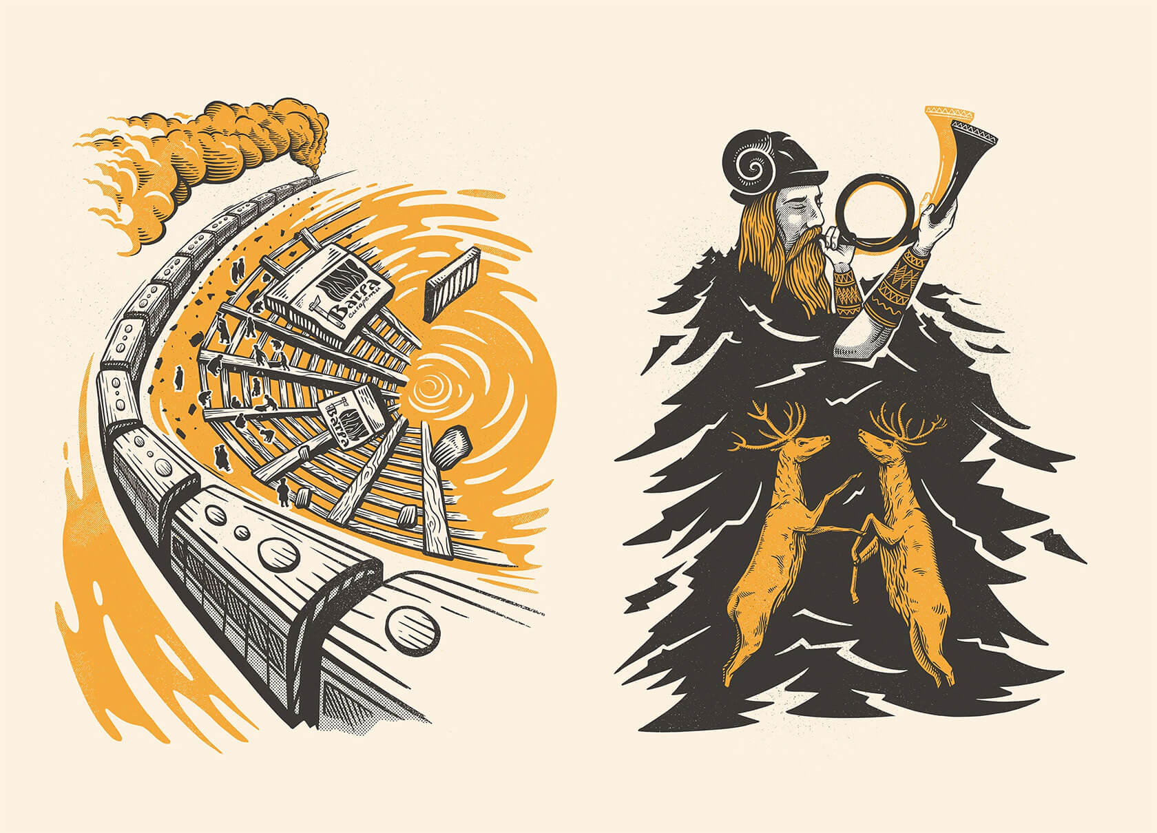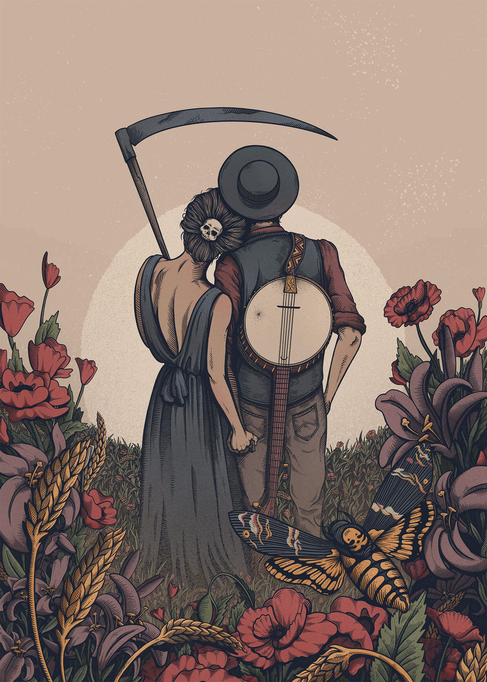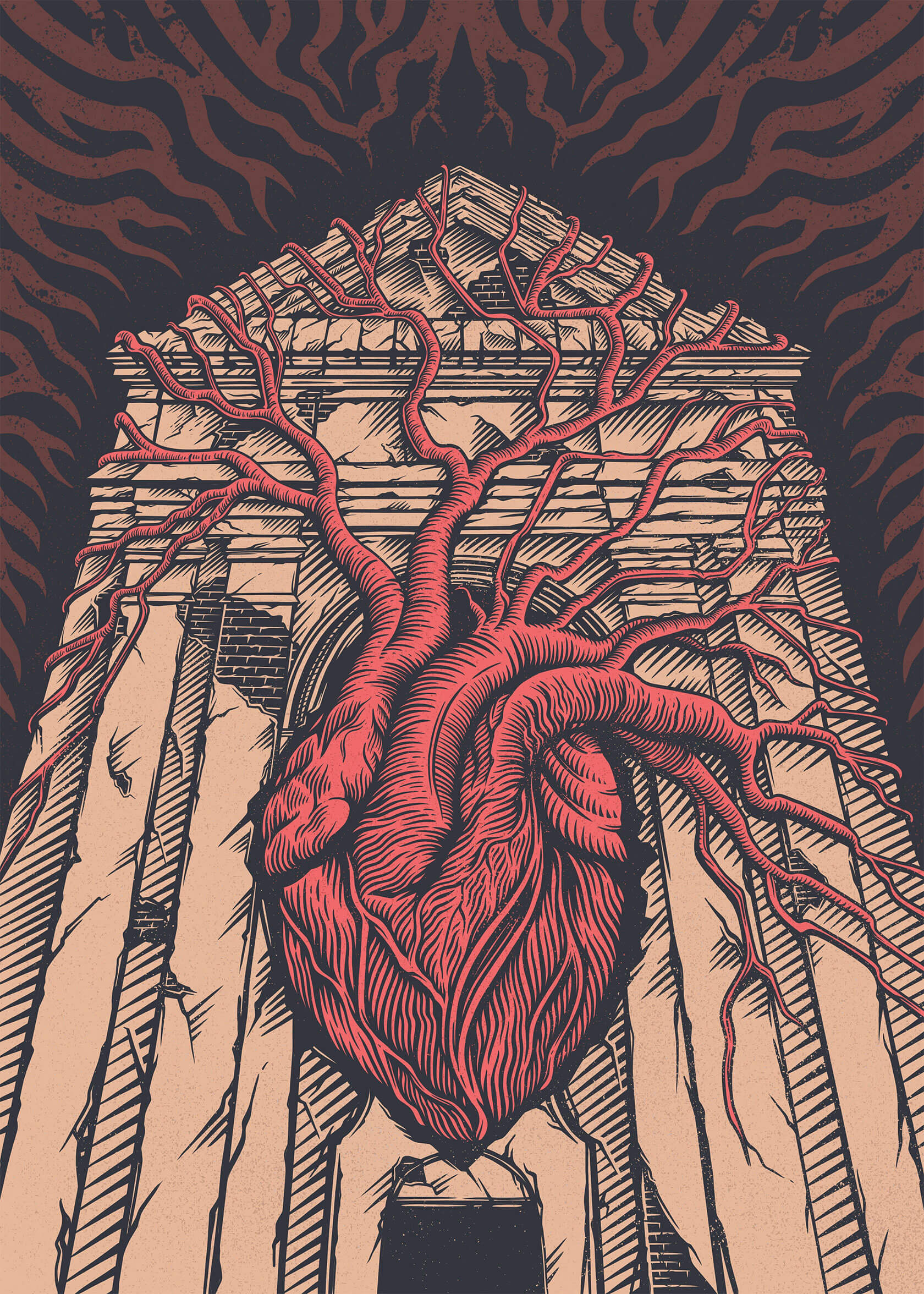 From concert posters to editorial illustrations, Serhii’s art strikes the perfect balance of grit and imagination. His unique style blends bold color palettes with woodcut-inspired textures and intricate linework, often weaving together myth and metaphor. Skeletal figures wander through forests, lions bloom with daisies, and octopuses sprout watchful eyes across their tentacles.