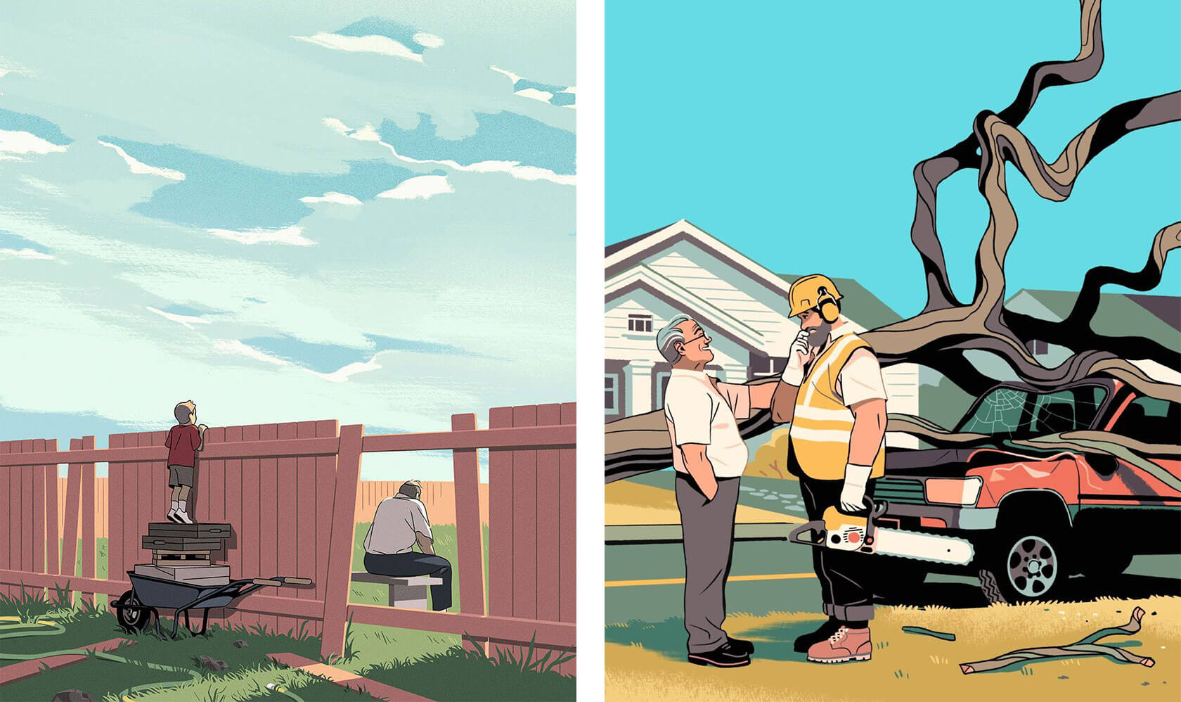 His creations are often defined by limited yet striking color palettes, bold contrasts and a natural sense of storytelling. Influenced by both American graphic novelists and classic cinema, Bruno’s compositions manage to stay clean and refined while still feeling rich and full of life.