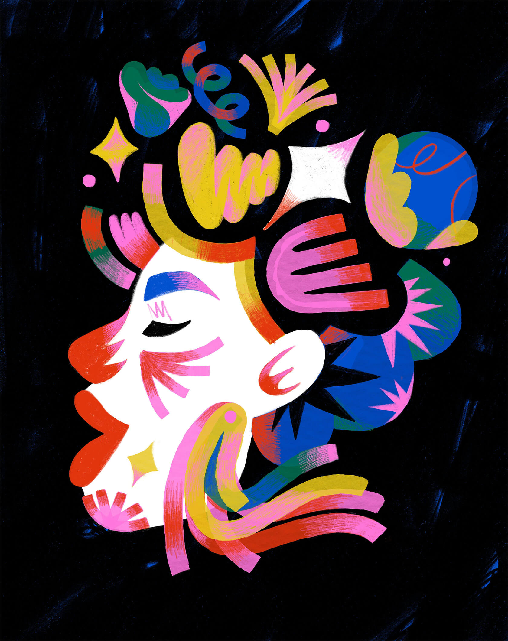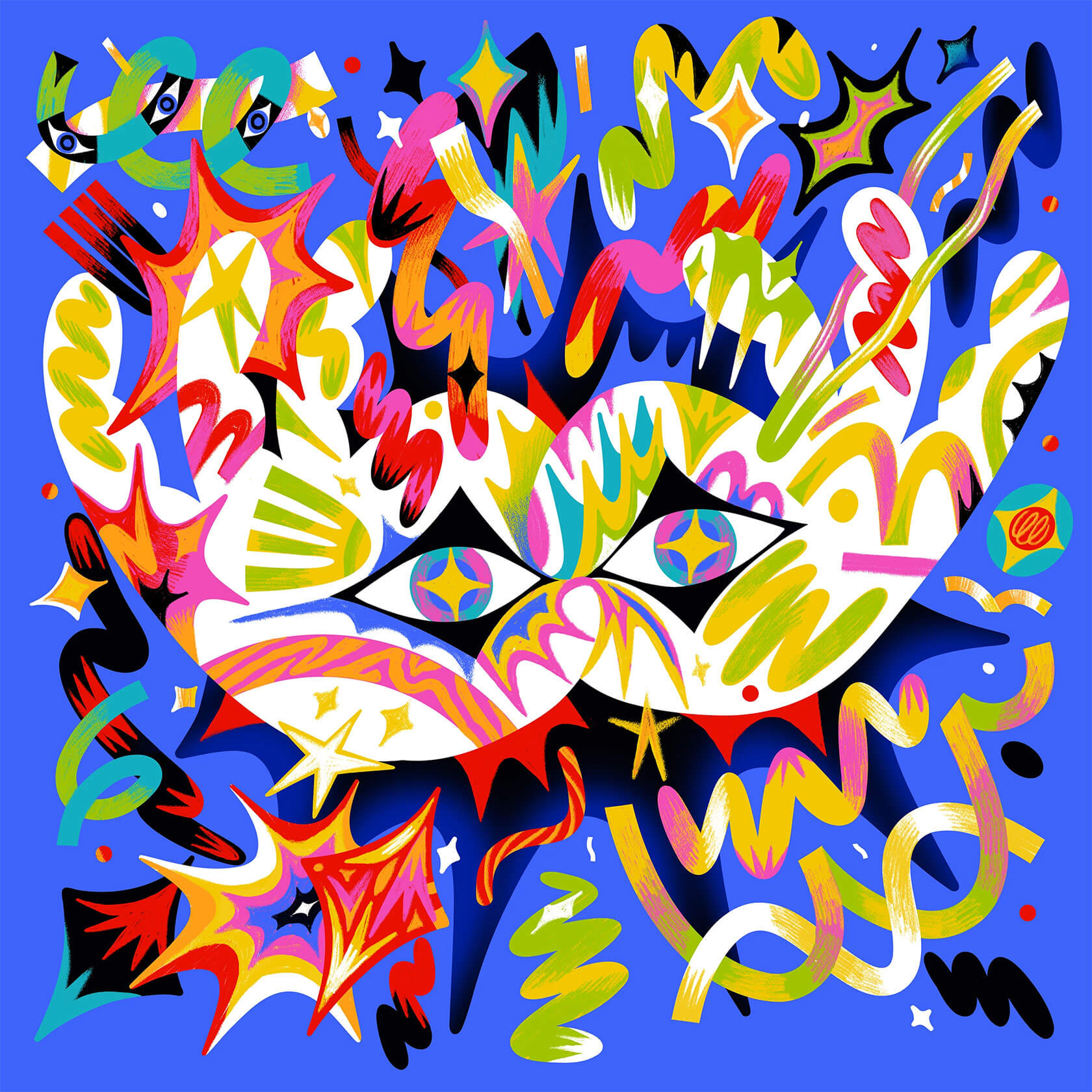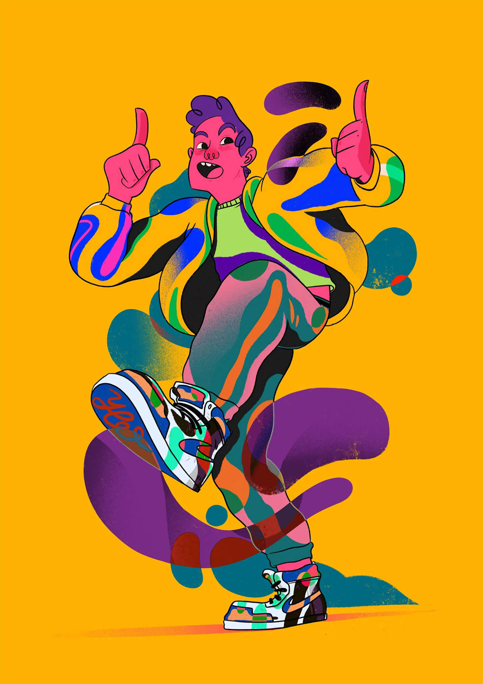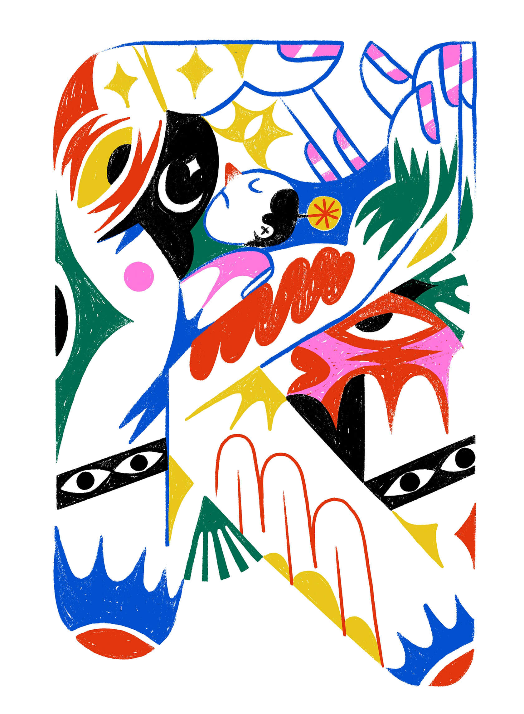 With a background in art direction and creative design, Yann brings a strong sense of visual rhythm and composition to his illustrations. His style is instantly recognizable — joyful, surreal, and unapologetically loud. Whether he’s creating expressive characters or abstract, dreamlike scenes, every stroke seems to vibrate with emotion and intent.