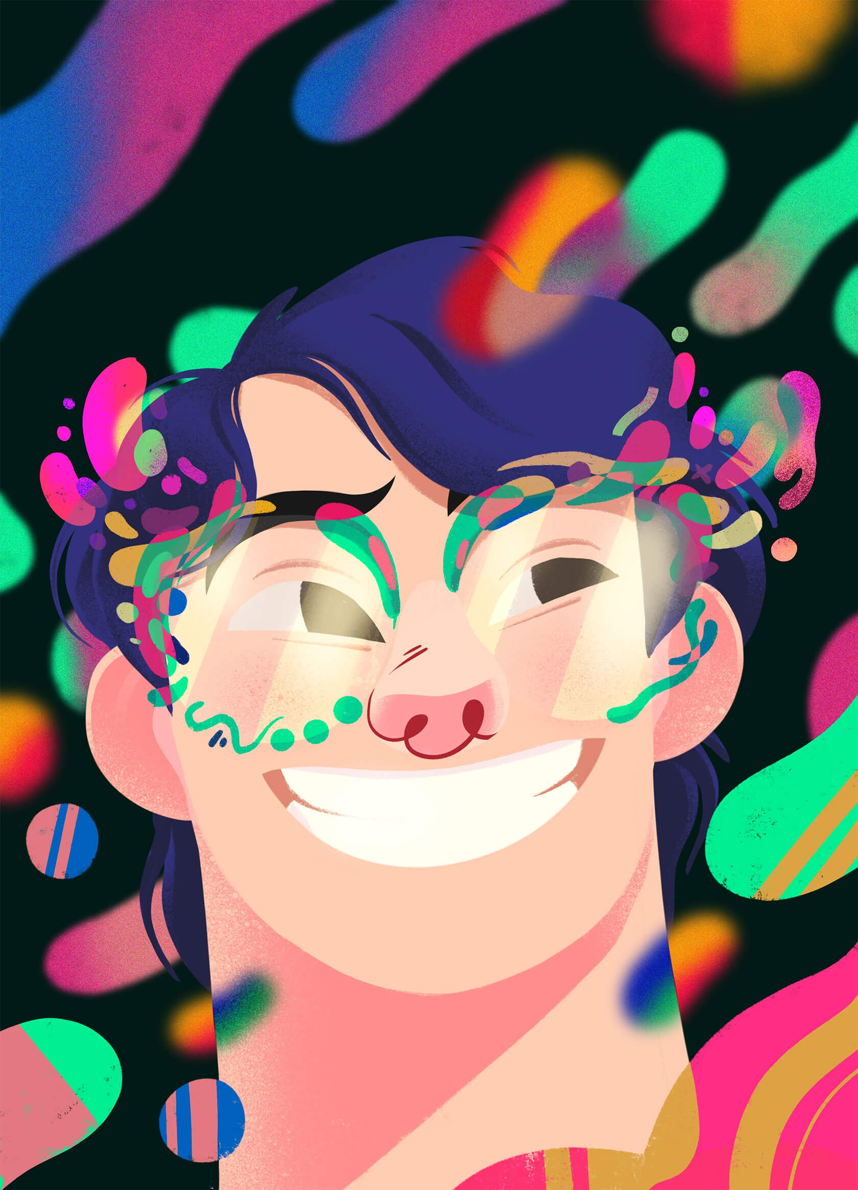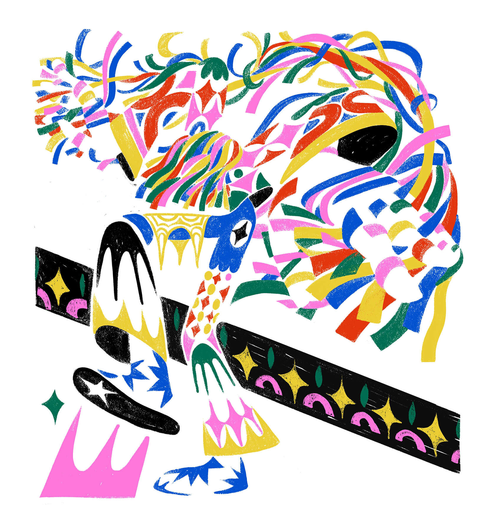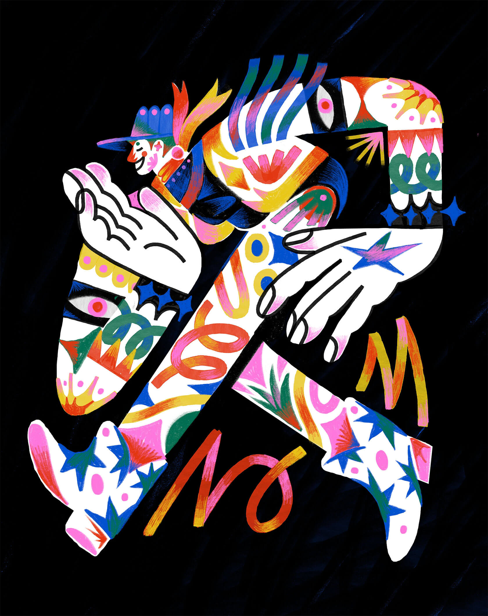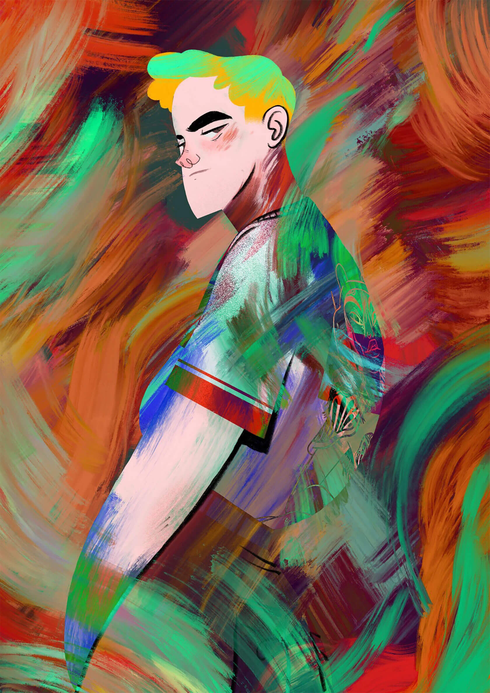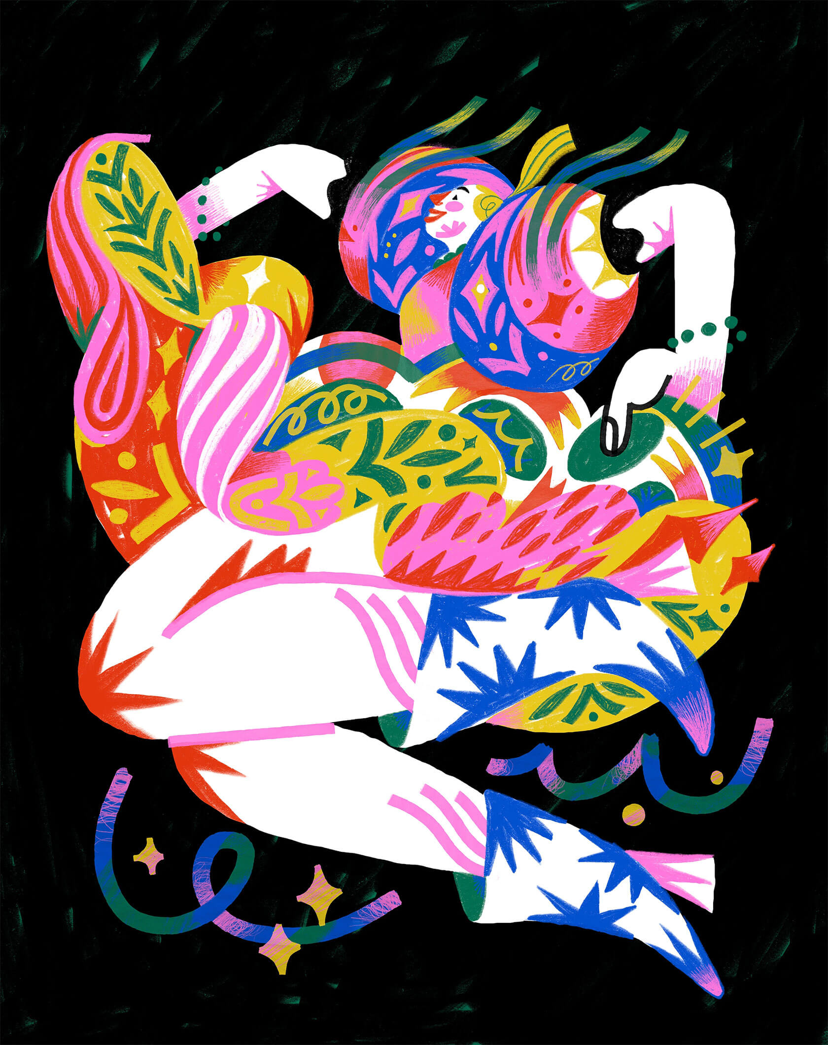 With a background in art direction and creative design, Yann brings a strong sense of visual rhythm and composition to his illustrations. His style is instantly recognizable — joyful, surreal, and unapologetically loud. Whether he’s creating expressive characters or abstract, dreamlike scenes, every stroke seems to vibrate with emotion and intent.