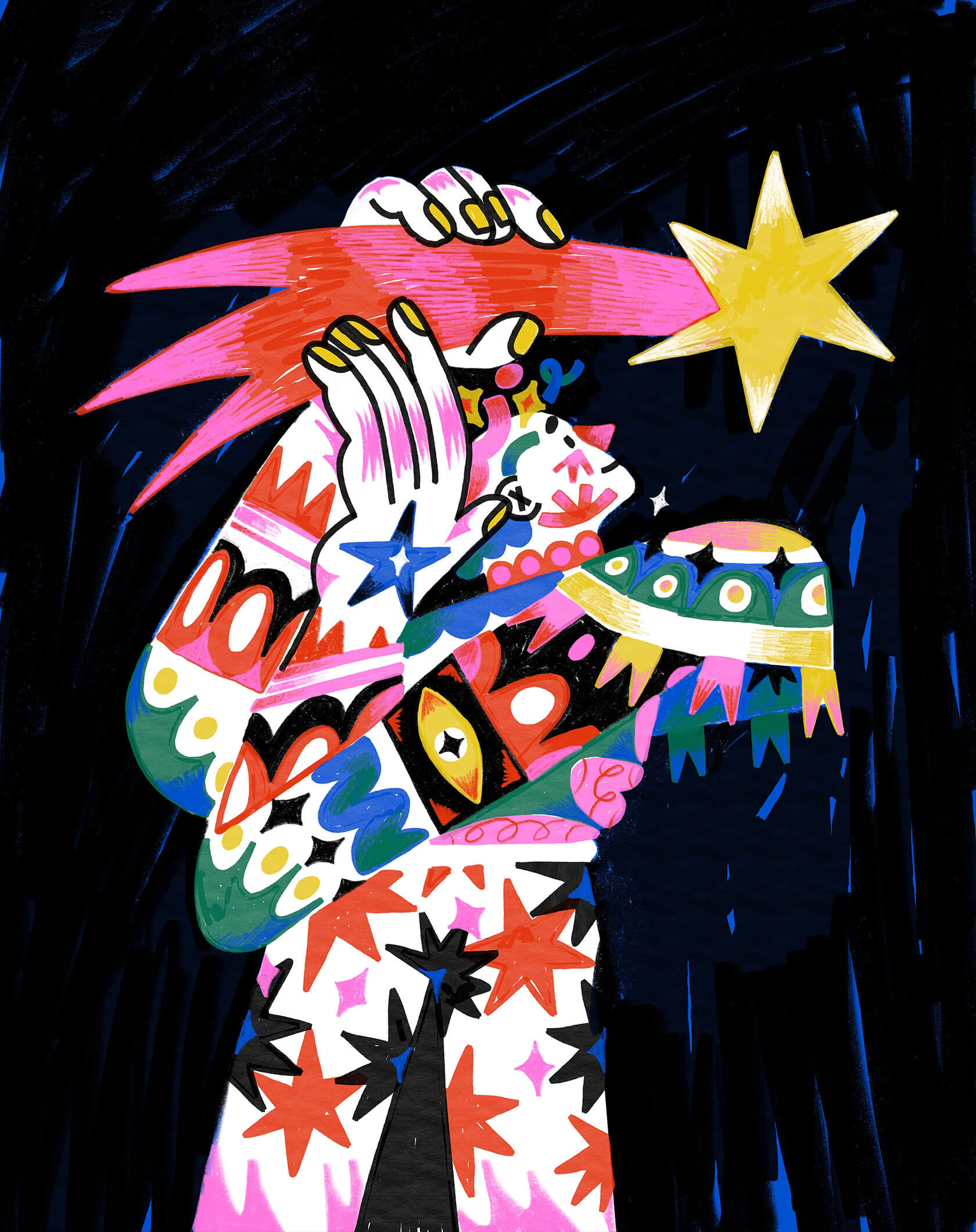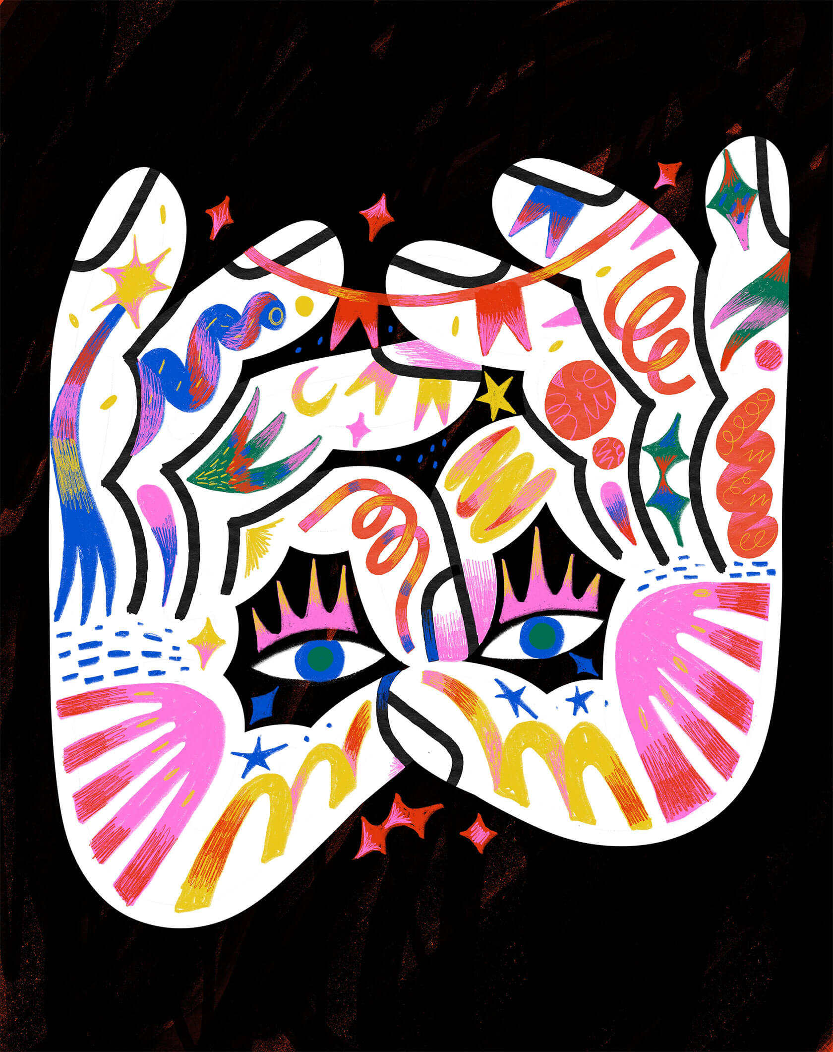 Brazilian artist and designer Yann Valber has a thing for bright colors, and he doesn’t hold back. His work bursts with movement and personality, mixing hand-drawn energy with bold, graphic precision. His creations often feel like a visual explosion: eyes, stars, hands and faces intertwine in a chaotic harmony of neon pinks, electric blues, yellows and greens.