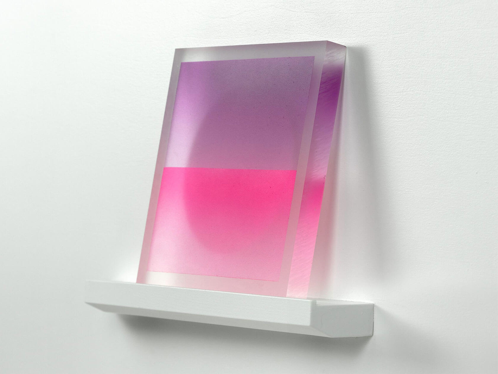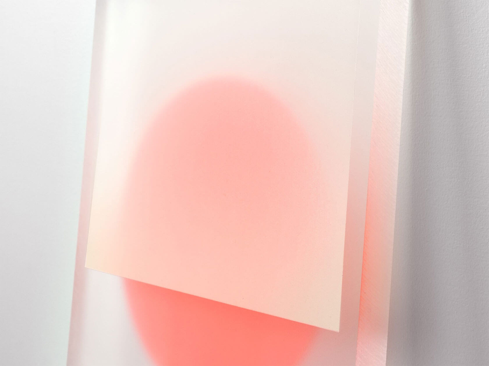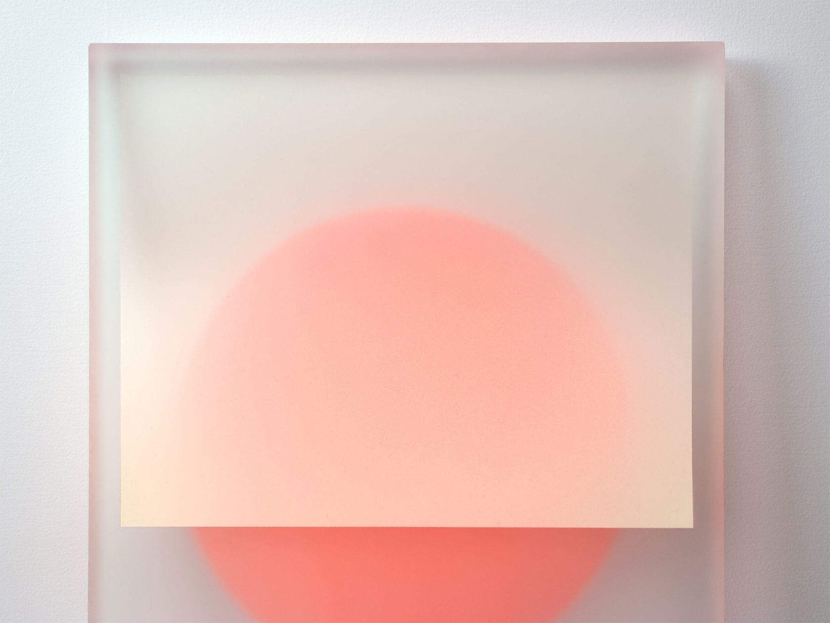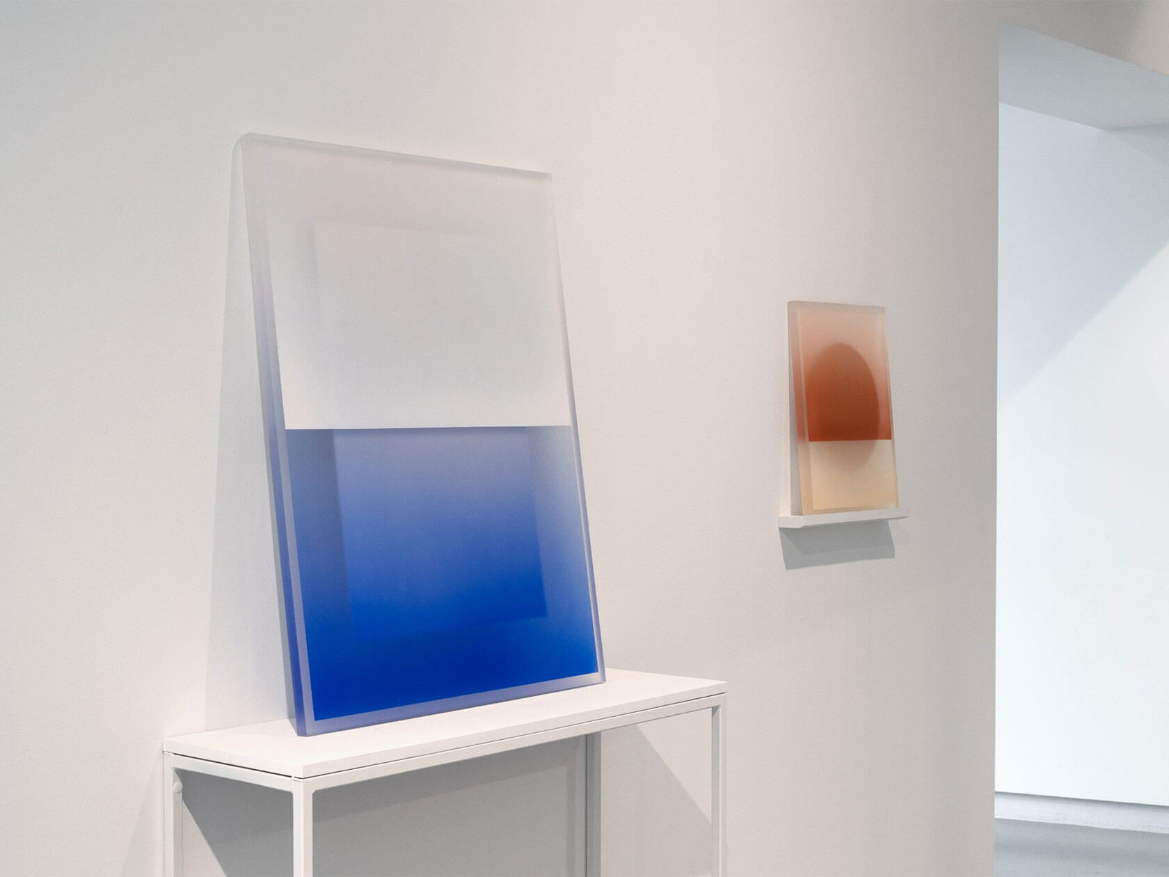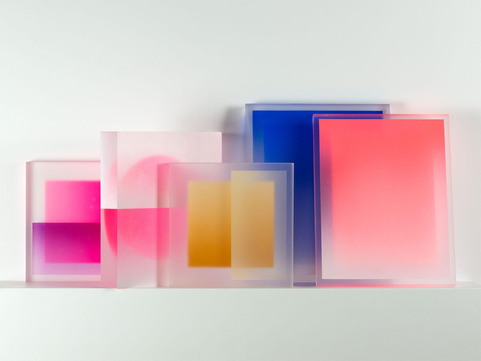 His signature pieces are made of layered acrylic panels infused with soft transitions of color that seem to glow from within. These ethereal works invite viewers to move around them, revealing shifting tones and subtle changes in perception as ambient light interacts with the textured surfaces.
