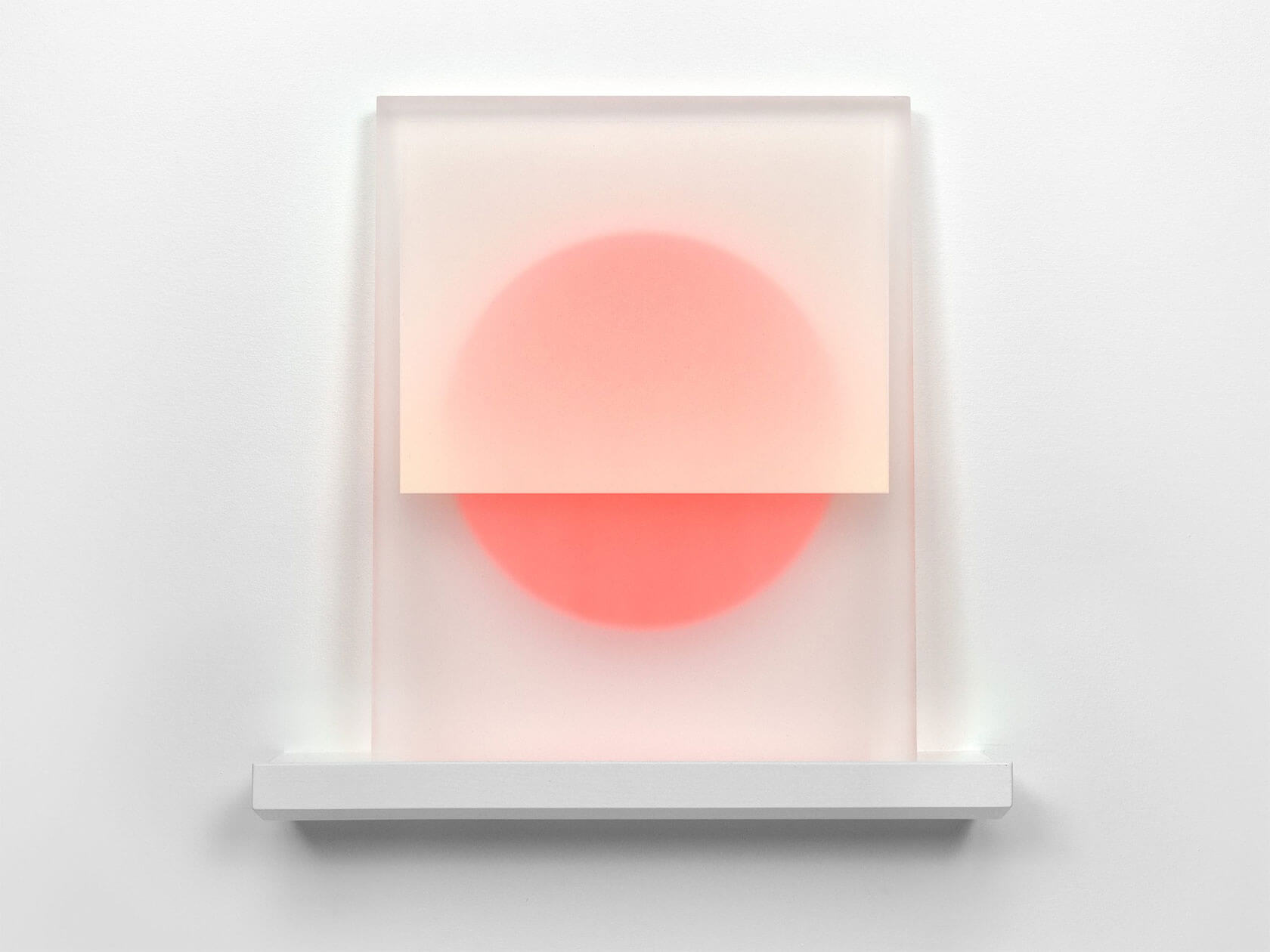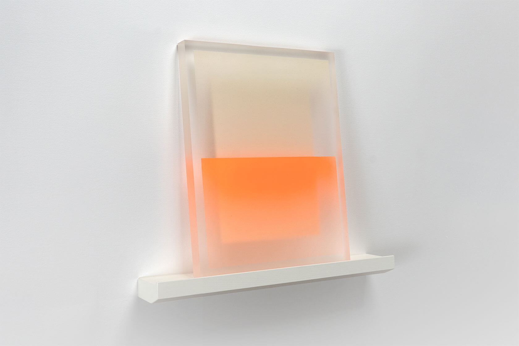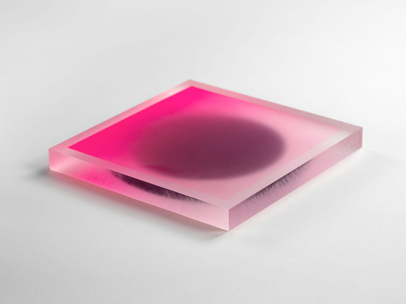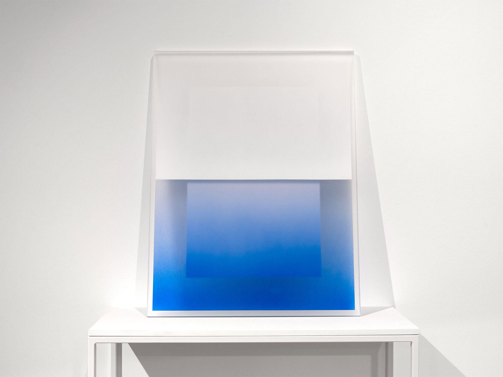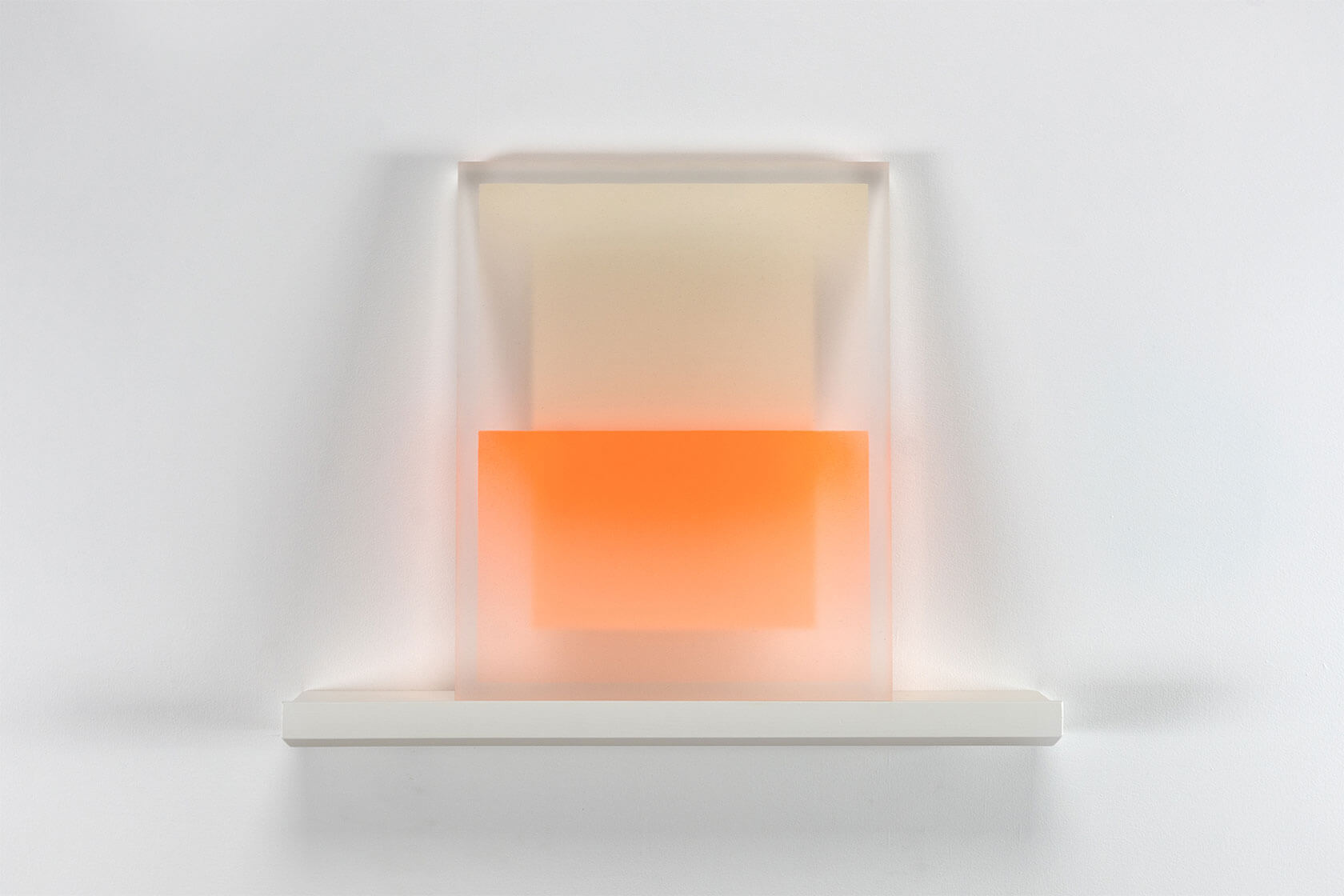 His signature pieces are made of layered acrylic panels infused with soft transitions of color that seem to glow from within. These ethereal works invite viewers to move around them, revealing shifting tones and subtle changes in perception as ambient light interacts with the textured surfaces.