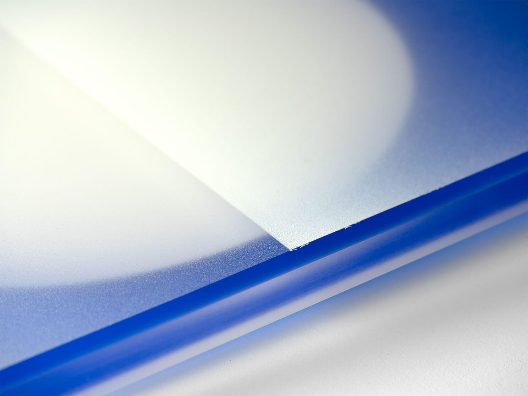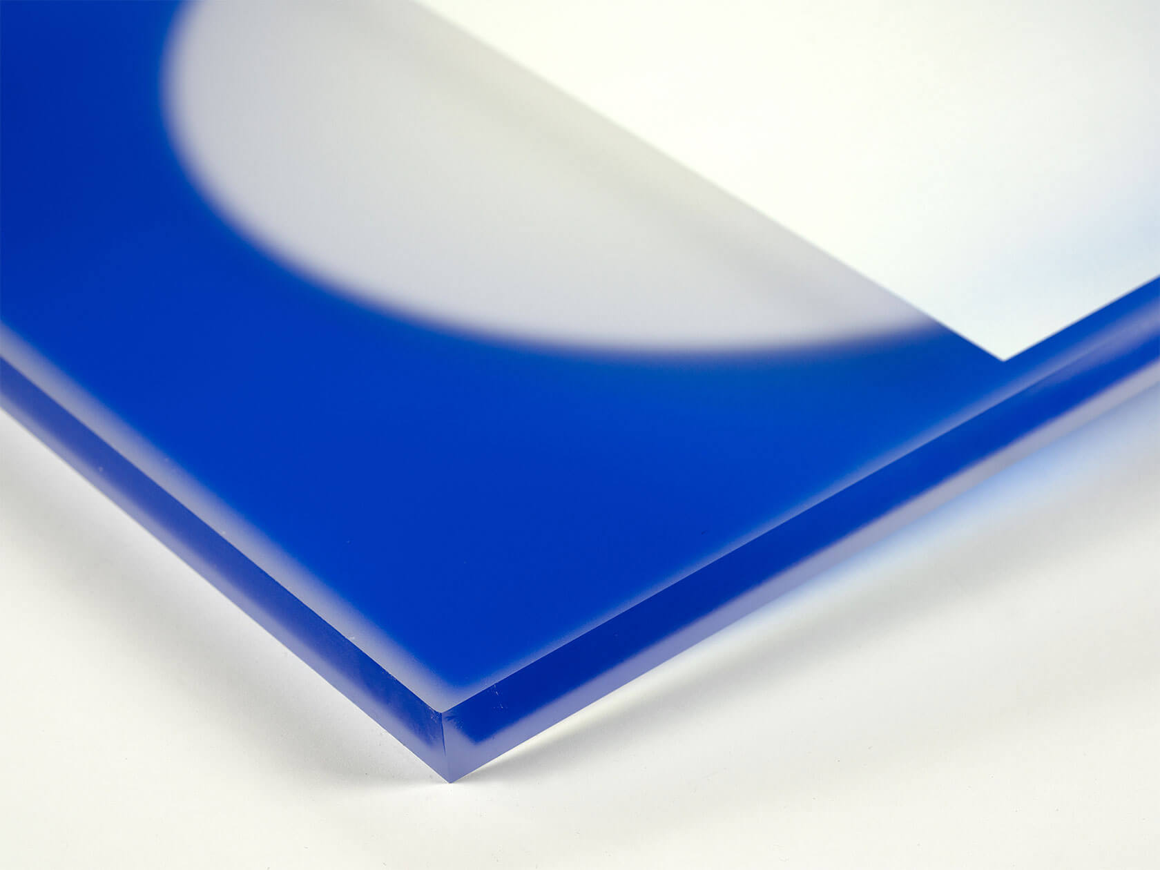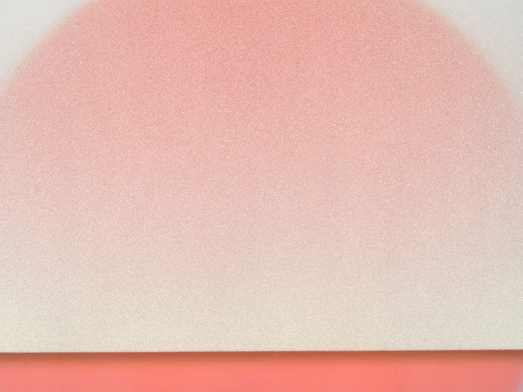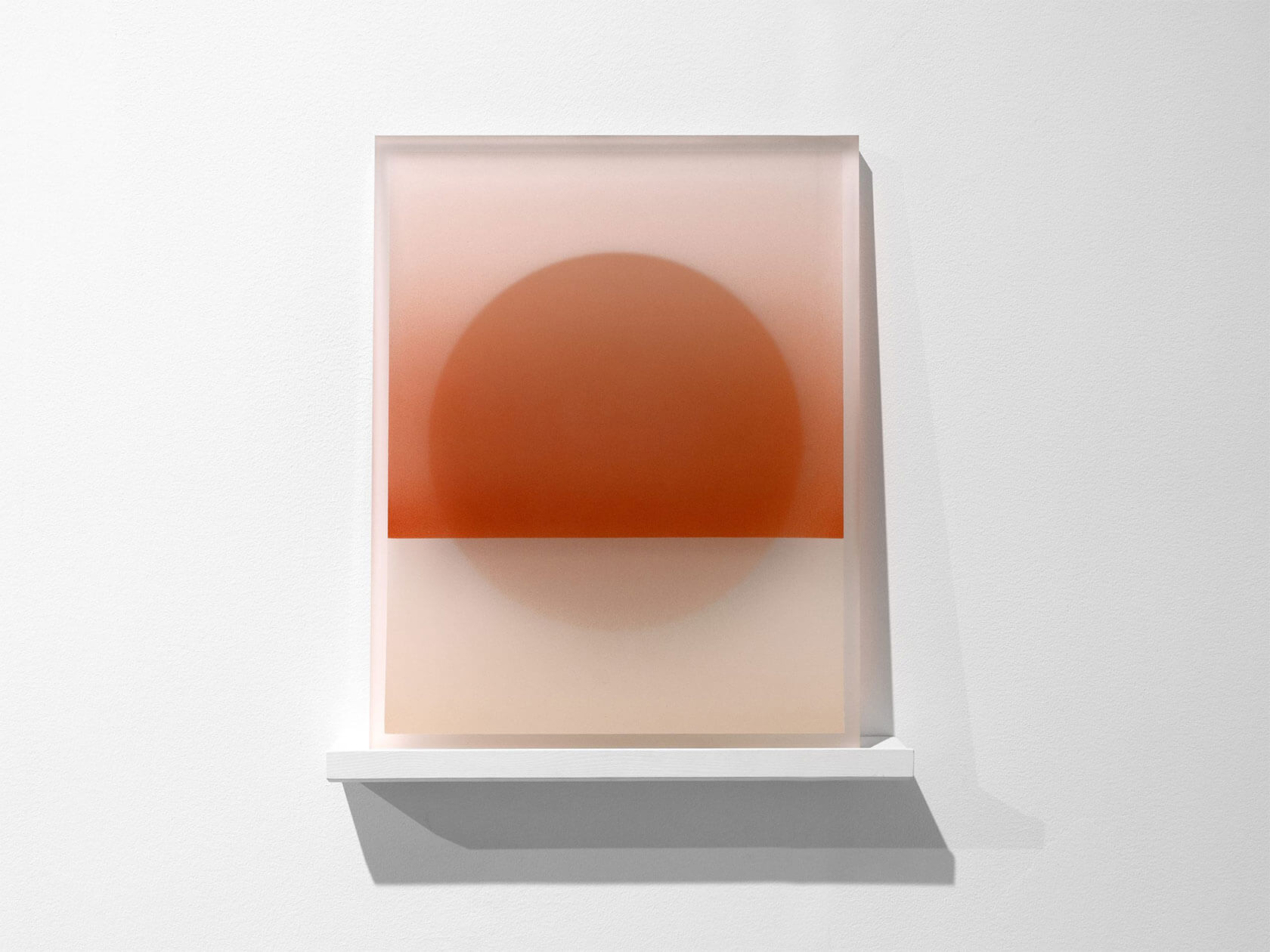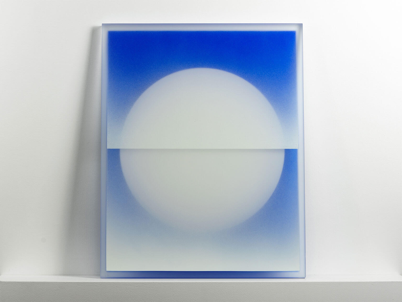 His signature pieces are made of layered acrylic panels infused with soft transitions of color that seem to glow from within. These ethereal works invite viewers to move around them, revealing shifting tones and subtle changes in perception as ambient light interacts with the textured surfaces.