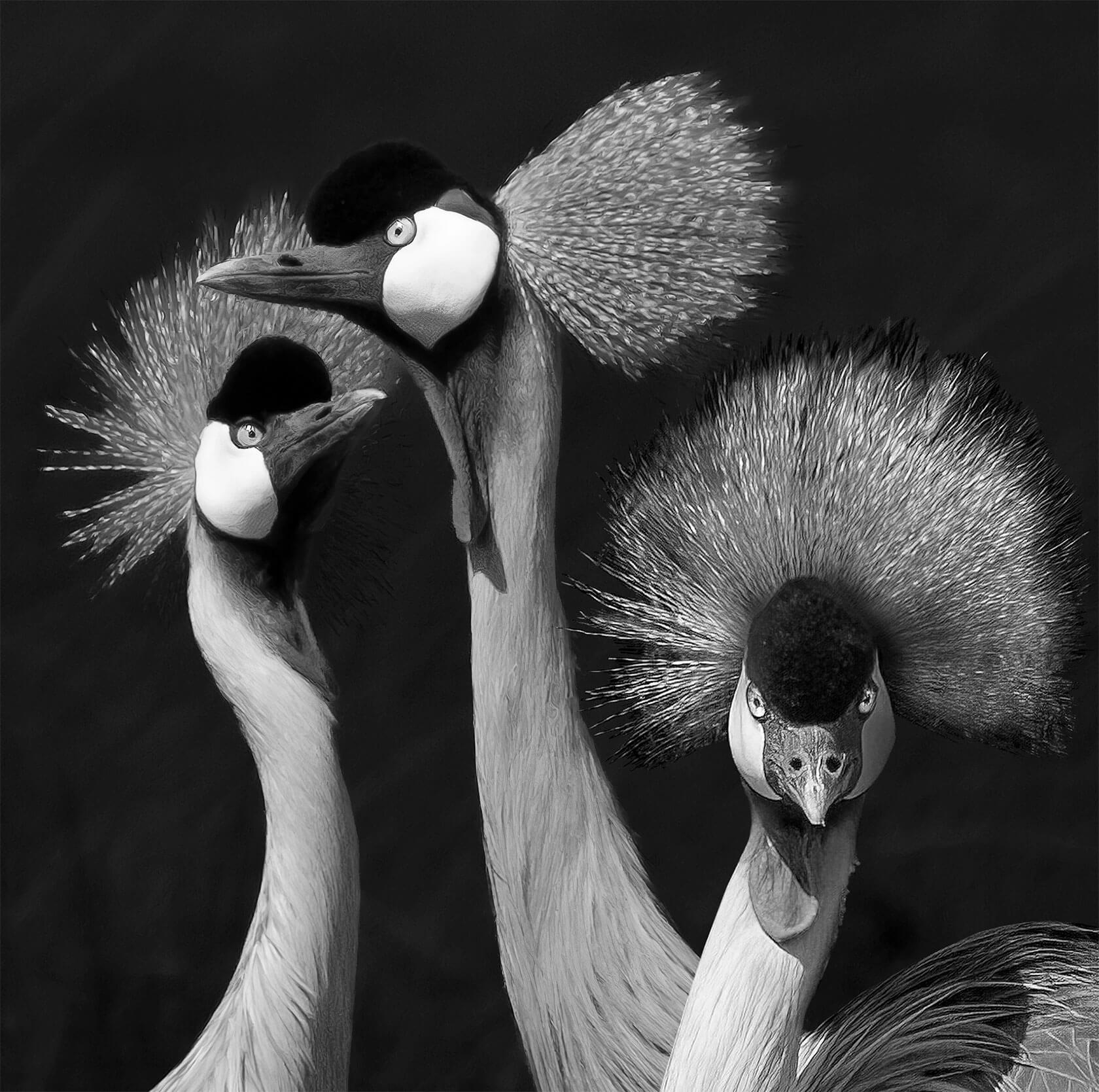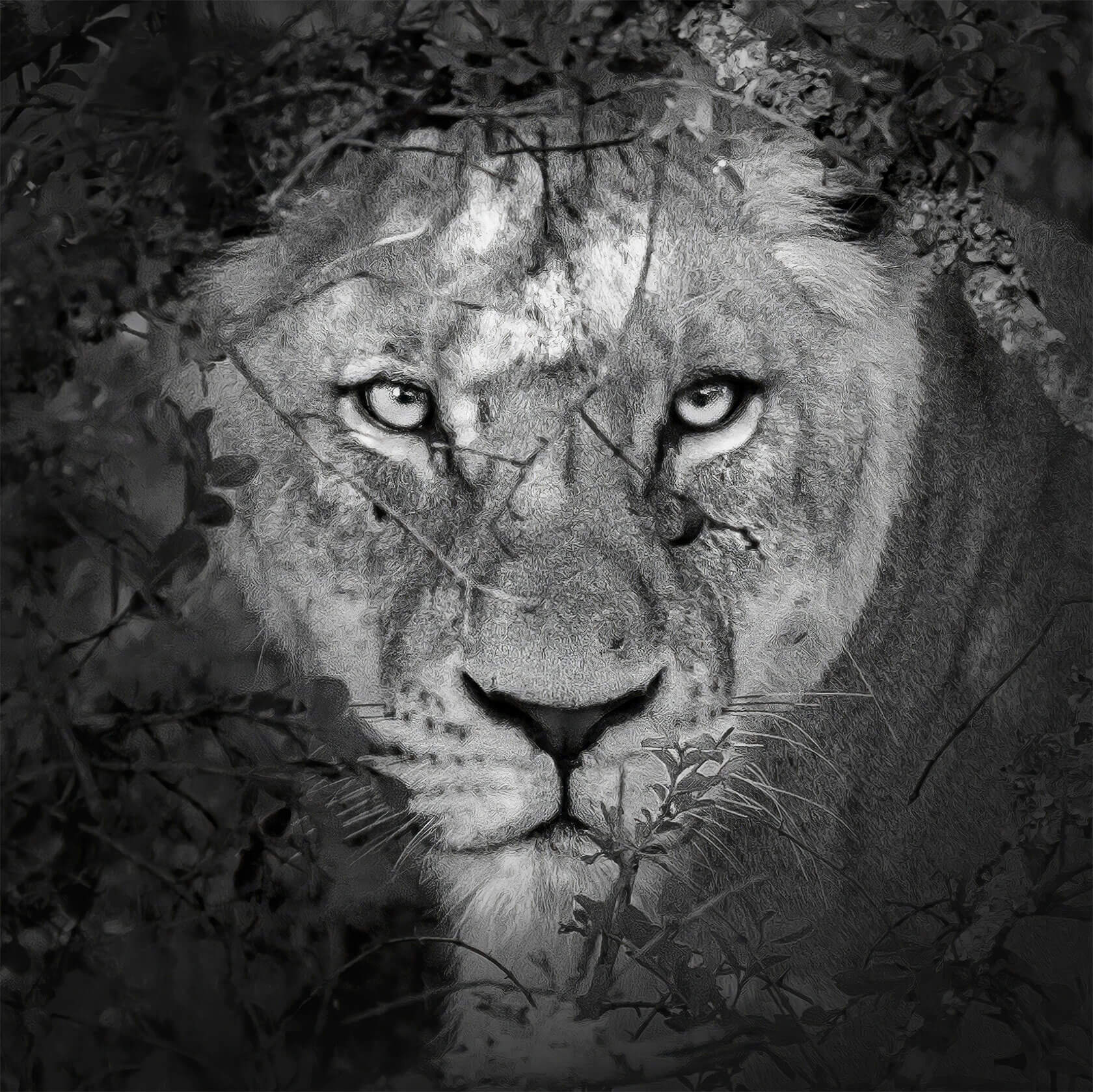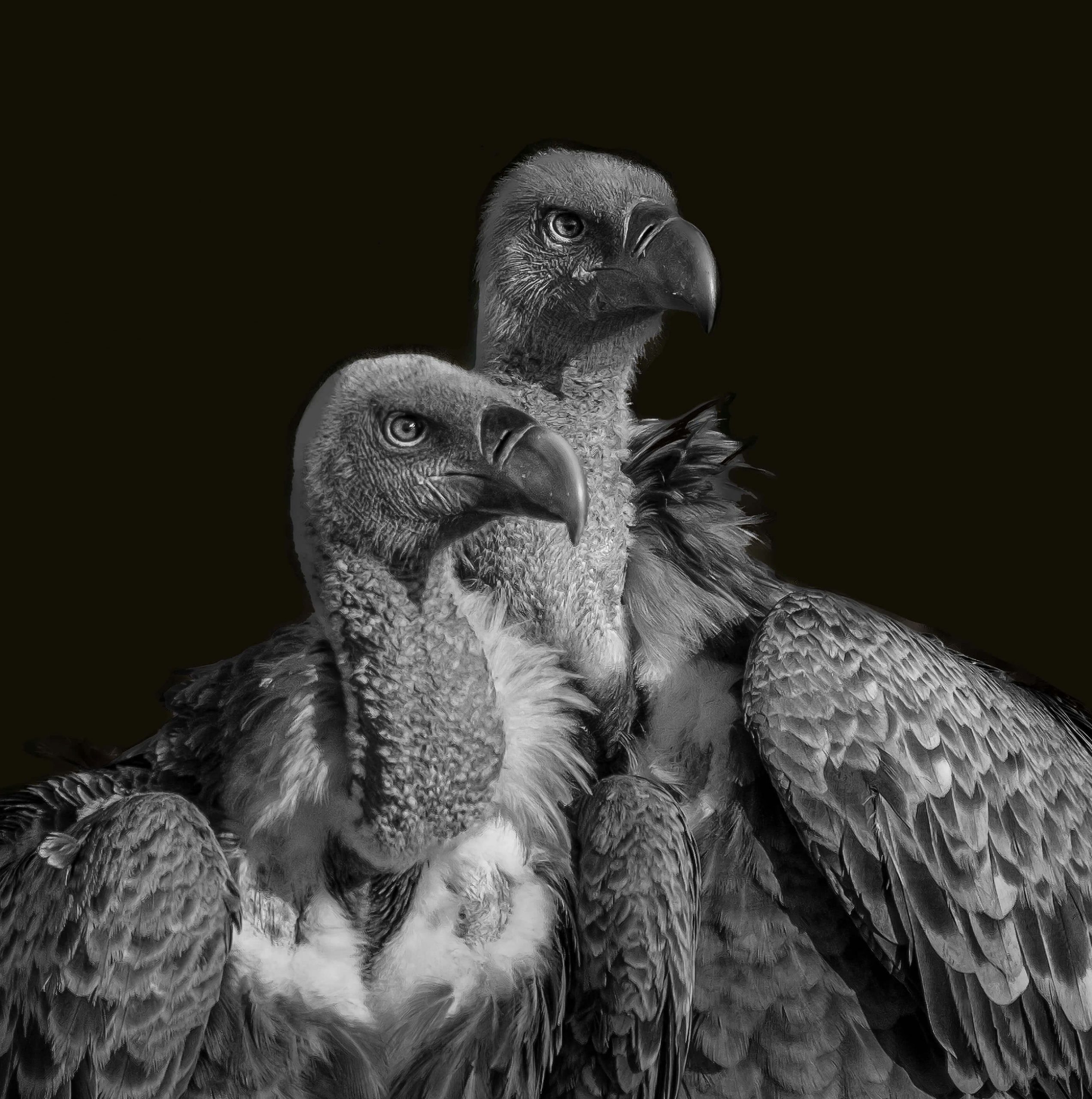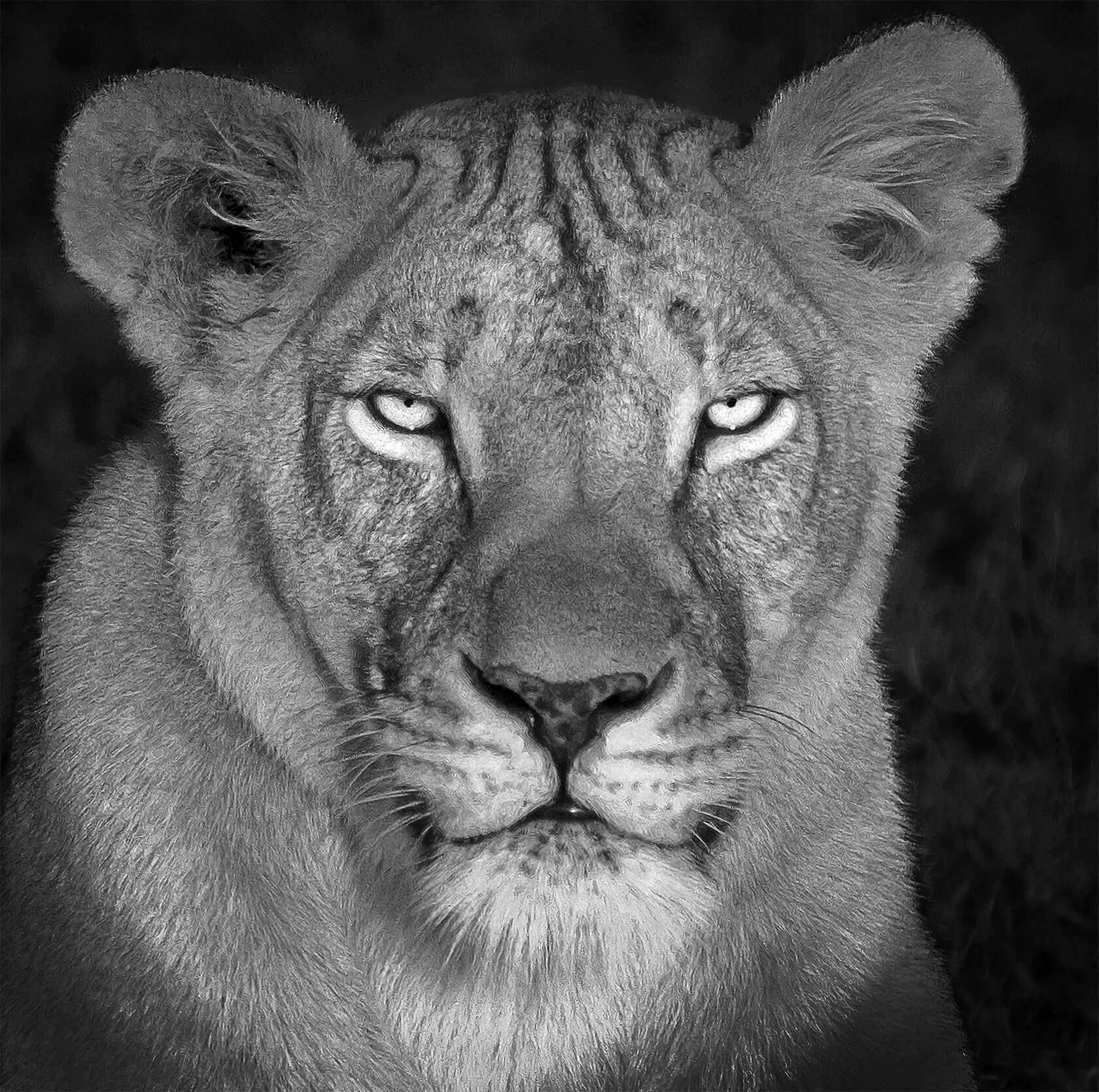 Rendered in striking detail, these black and white studies transform familiar creatures like lions, rhinos, foxes and vultures into keen watchers, their stares filled with awareness and presence. Darrel’s masterful play of light and shadow intensifies every texture and contour, emphasizing not just physical form but emotional resonance.