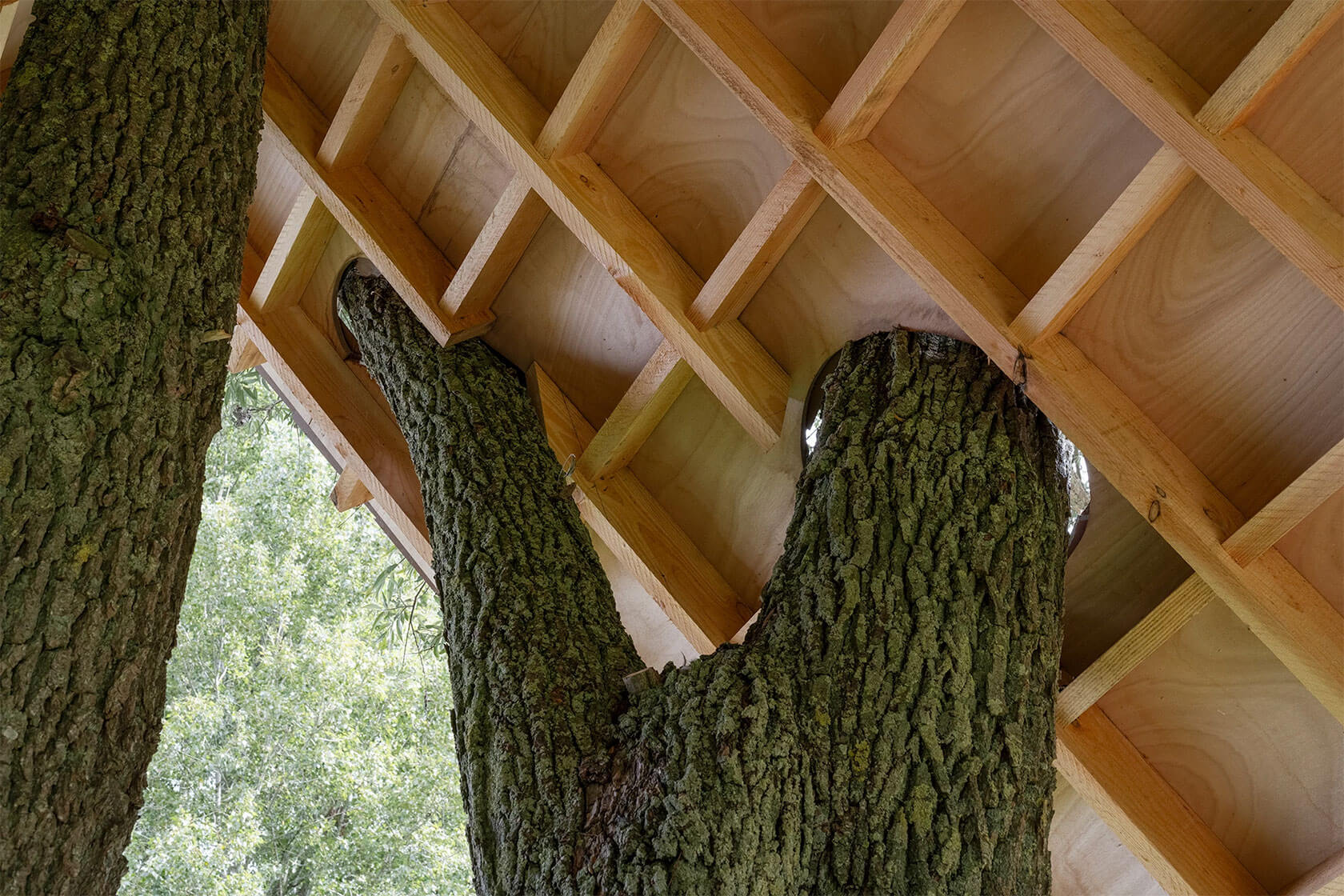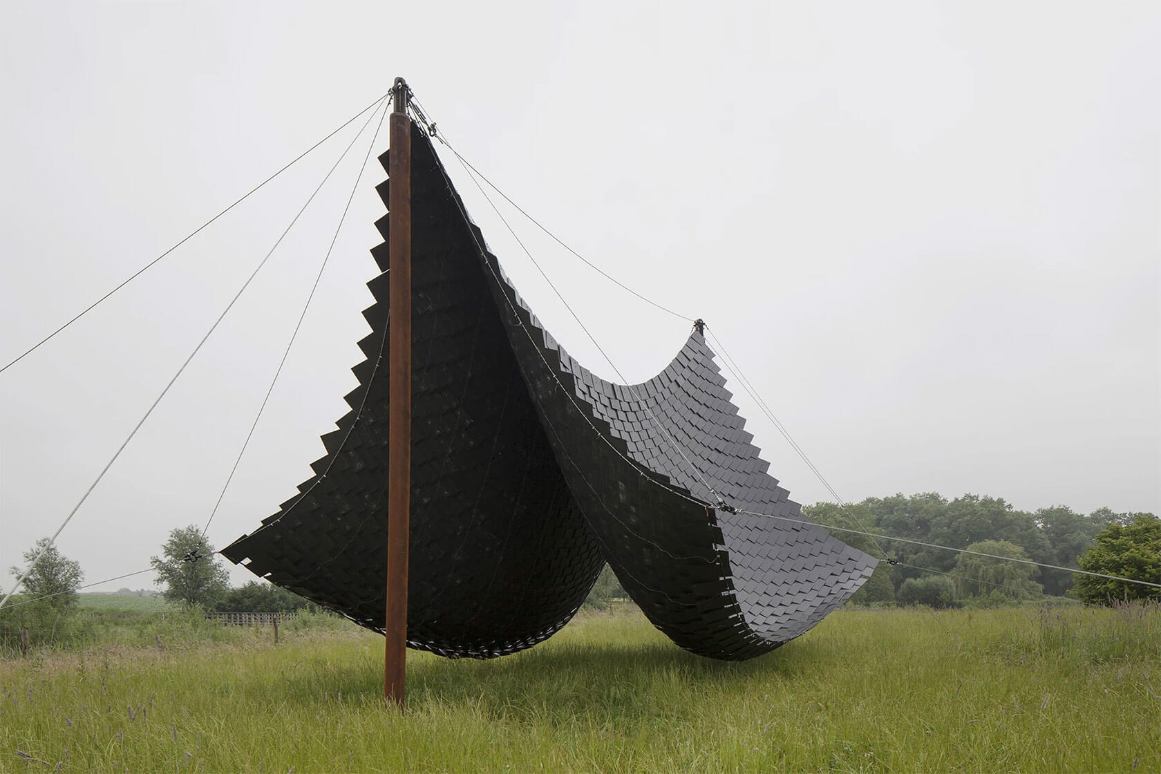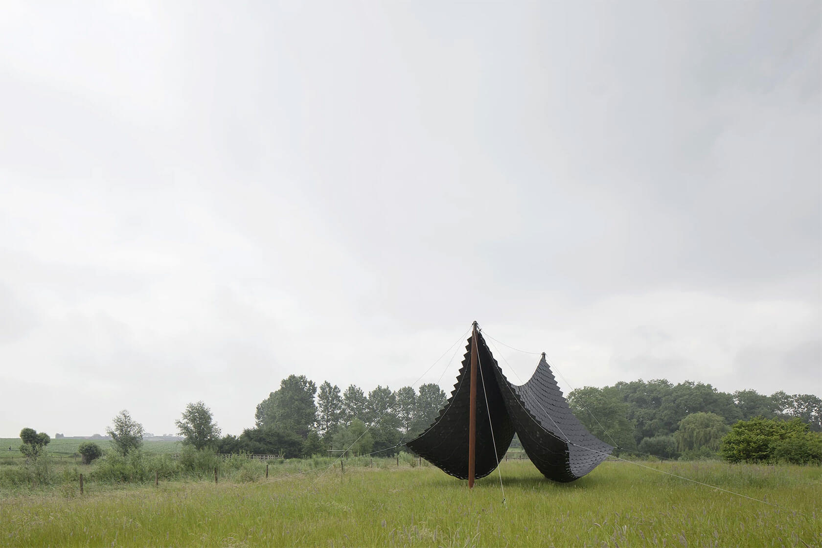 Among our favorite recent pieces is Shelter (2023), a beautifully simple intervention where a pitched wooden roof is suspended between the trunks of a cluster of trees. Another installation in a similar spirit is Tabernacle (2021), a sweeping, tent-like canopy that hangs in a soft, sculptural curve.
