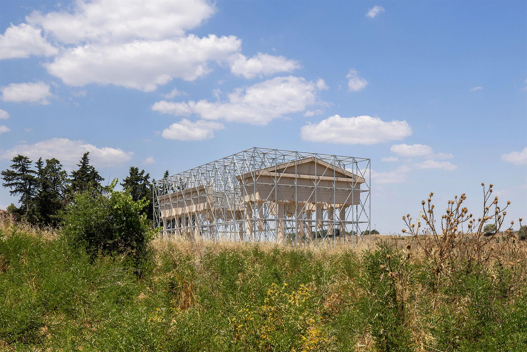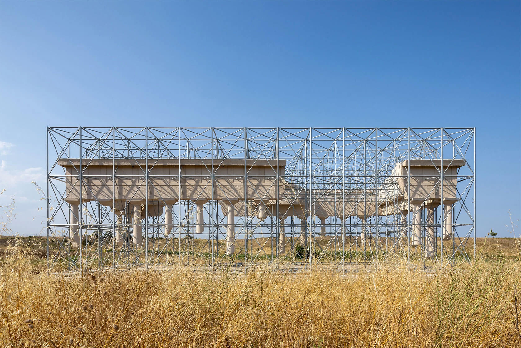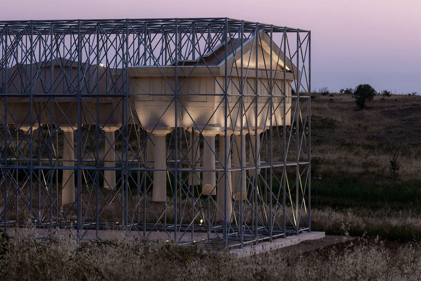 Their most famous work, though, is Reading Between the Lines, from 2011. This chapel made of stacked steel plates acts as a large-scale optical illusion: solid from afar, but increasingly transparent as you approach, dissolving into the landscape like a mirage. A more recent highlight, Inverse Ruin (completed this year), flips the idea of preservation inside out. Temple-like fragments float inside a geometric scaffolding frame, creating the sensation of stepping into the outline of a ruin rather than its remains.
