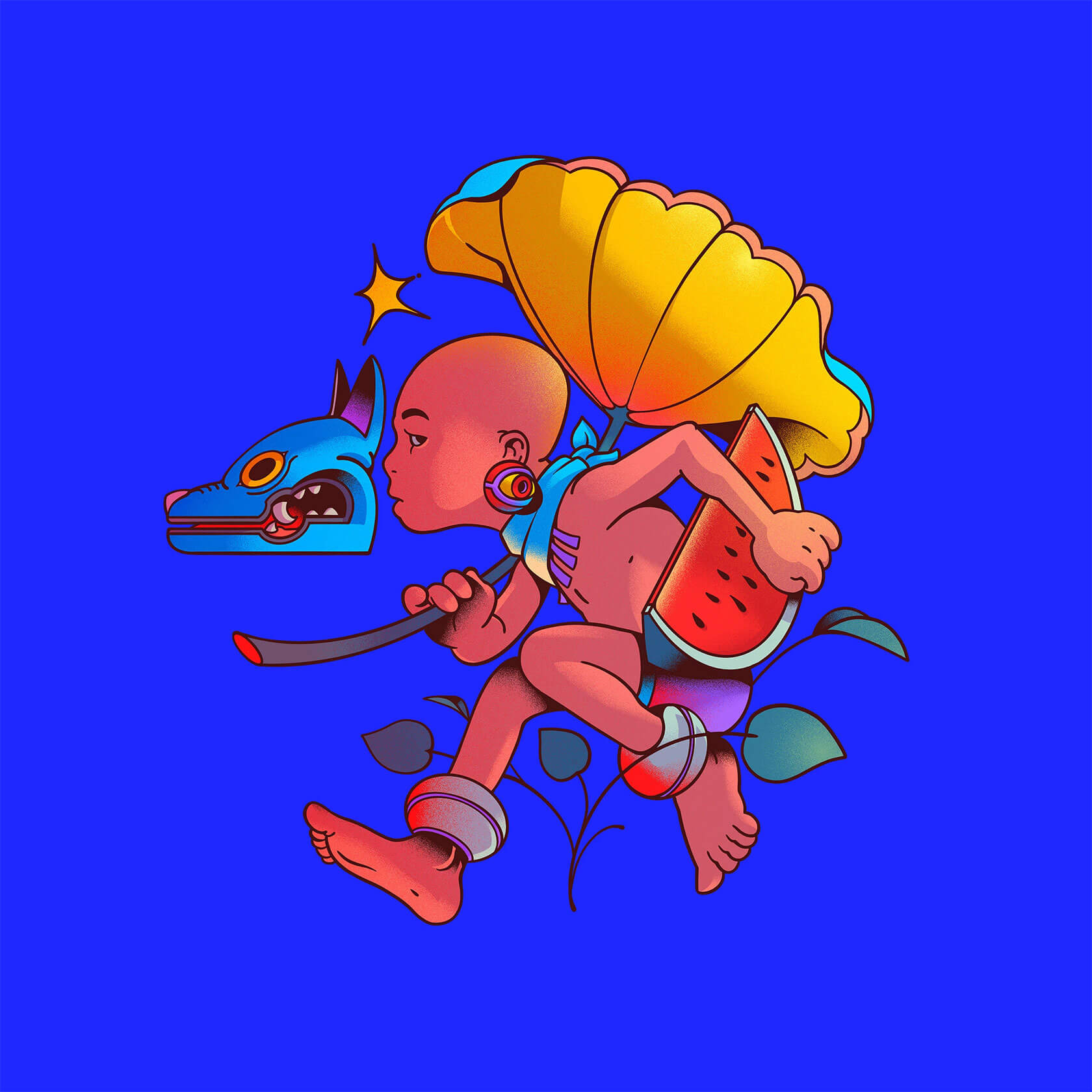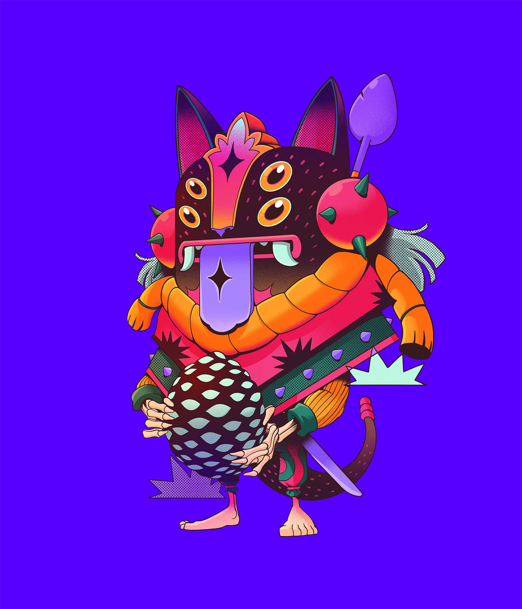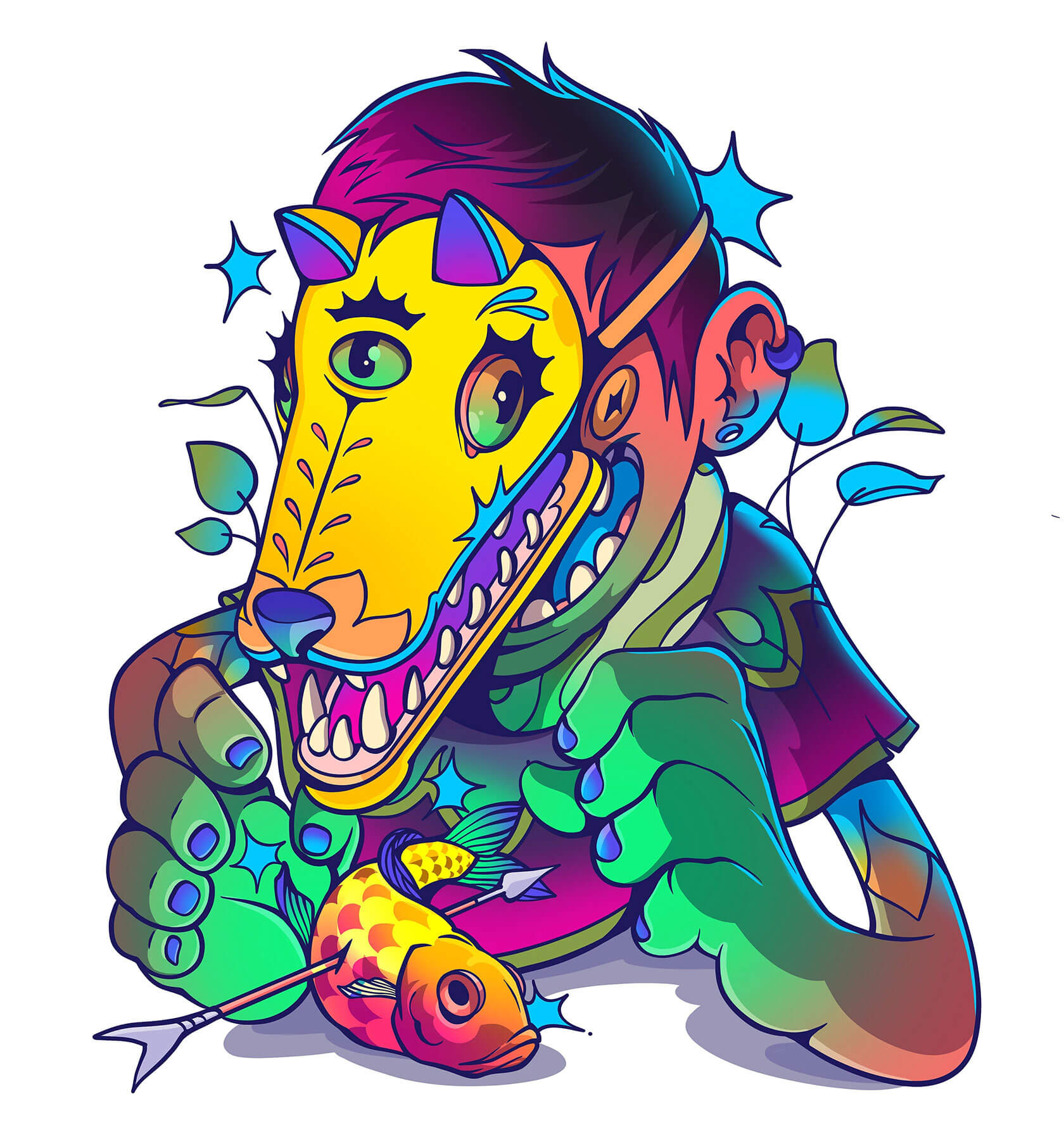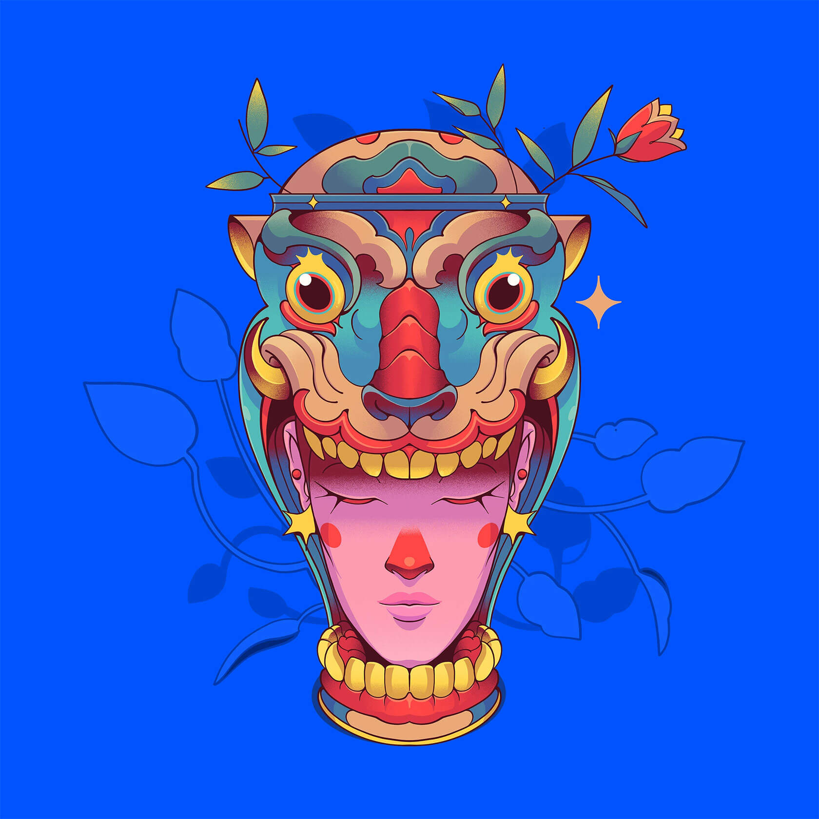 Tavo’s characters often exist between worlds: humans adorned with animal features, deities in motion, or dreamlike hybrids that embody transformation and duality. Drawing from mythology and everyday life alike, his visual language merges the spiritual with the playful, balancing sacred motifs and street-art vibrancy.