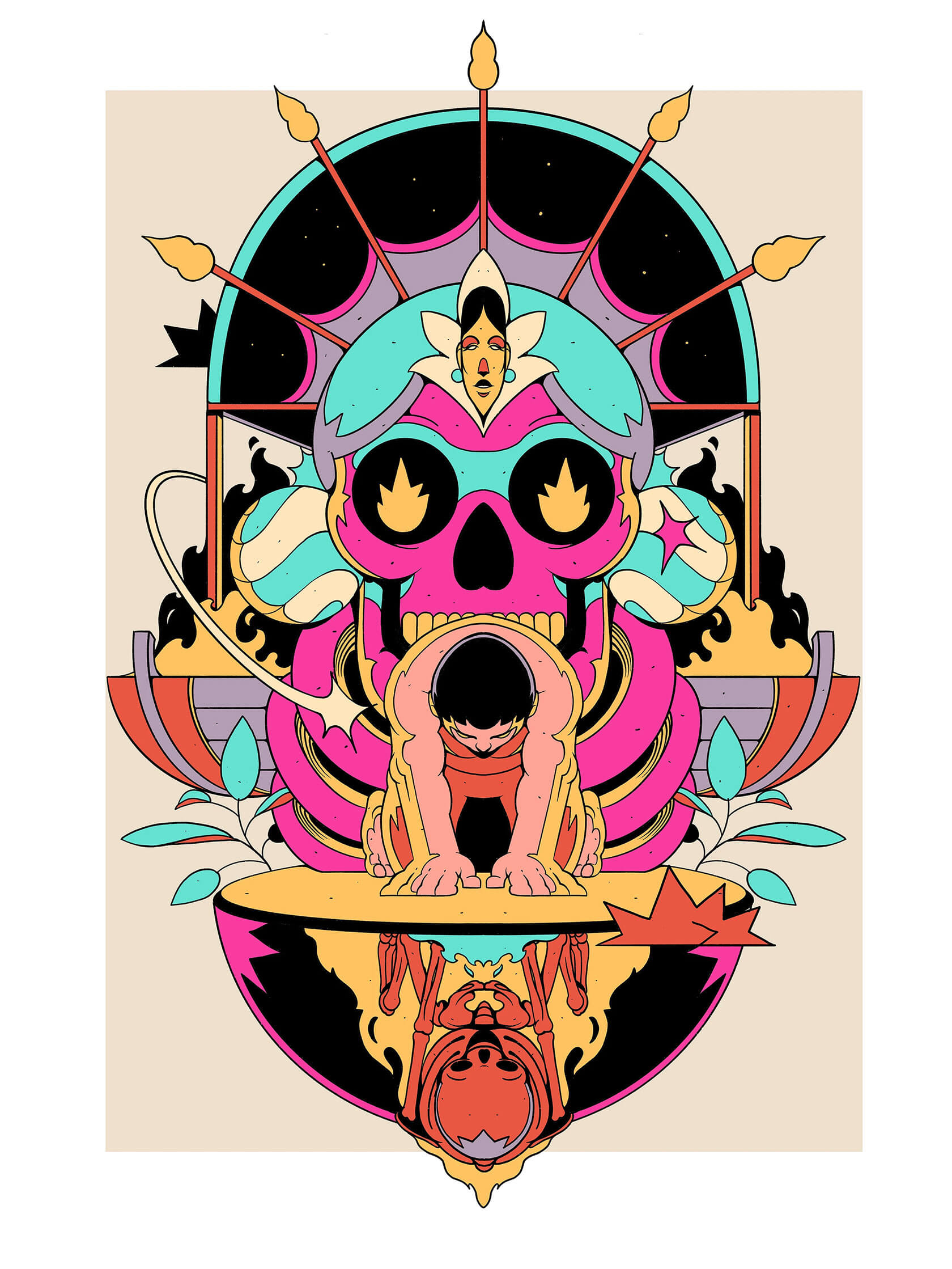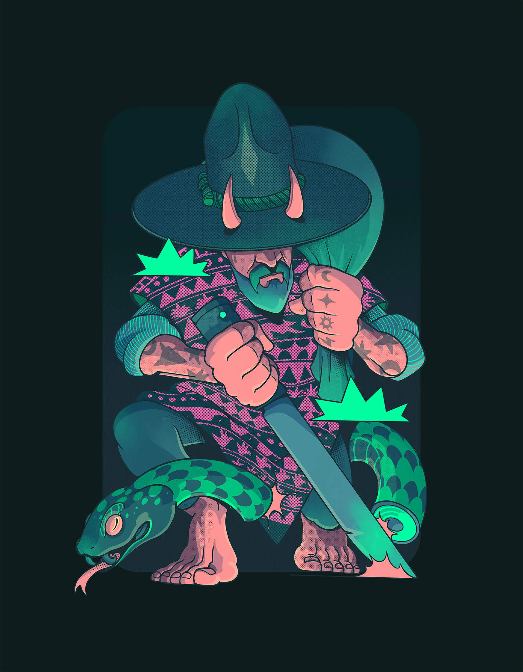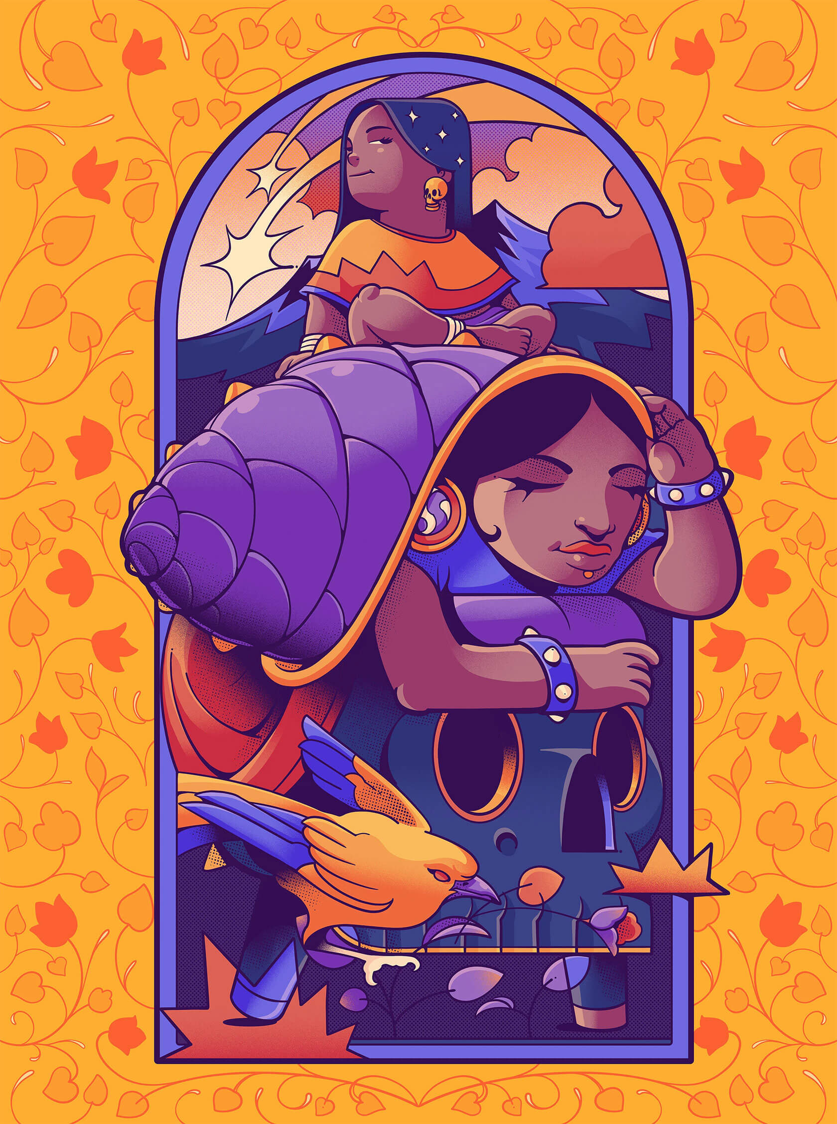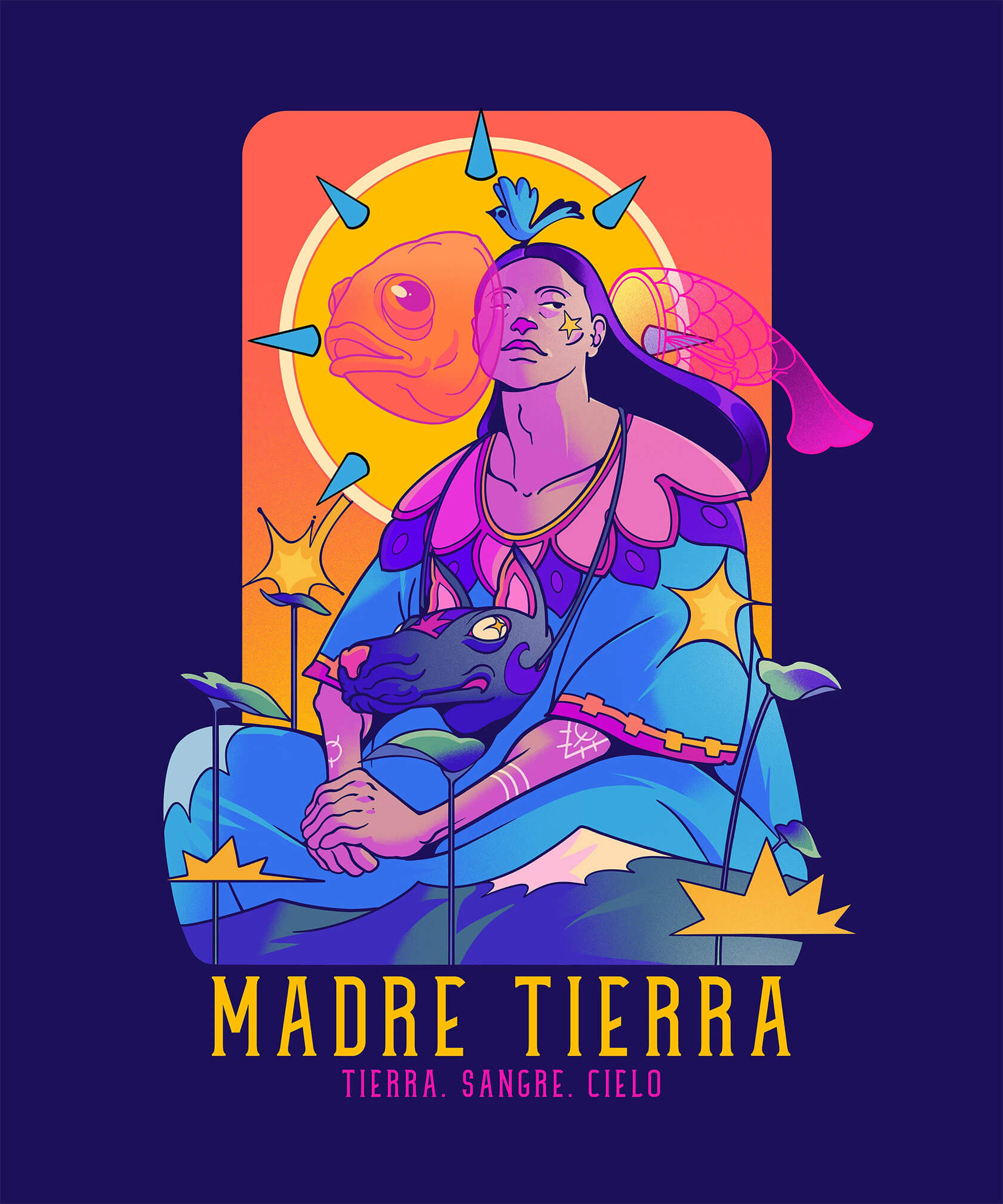 Mexican illustrator Tavo Santiago crafts powerful images that blend folklore, fantasy and contemporary aesthetics. His work shines with bold color palettes, stylized figures and intricate compositions that reinterpret Mesoamerican symbolism through a modern lens.