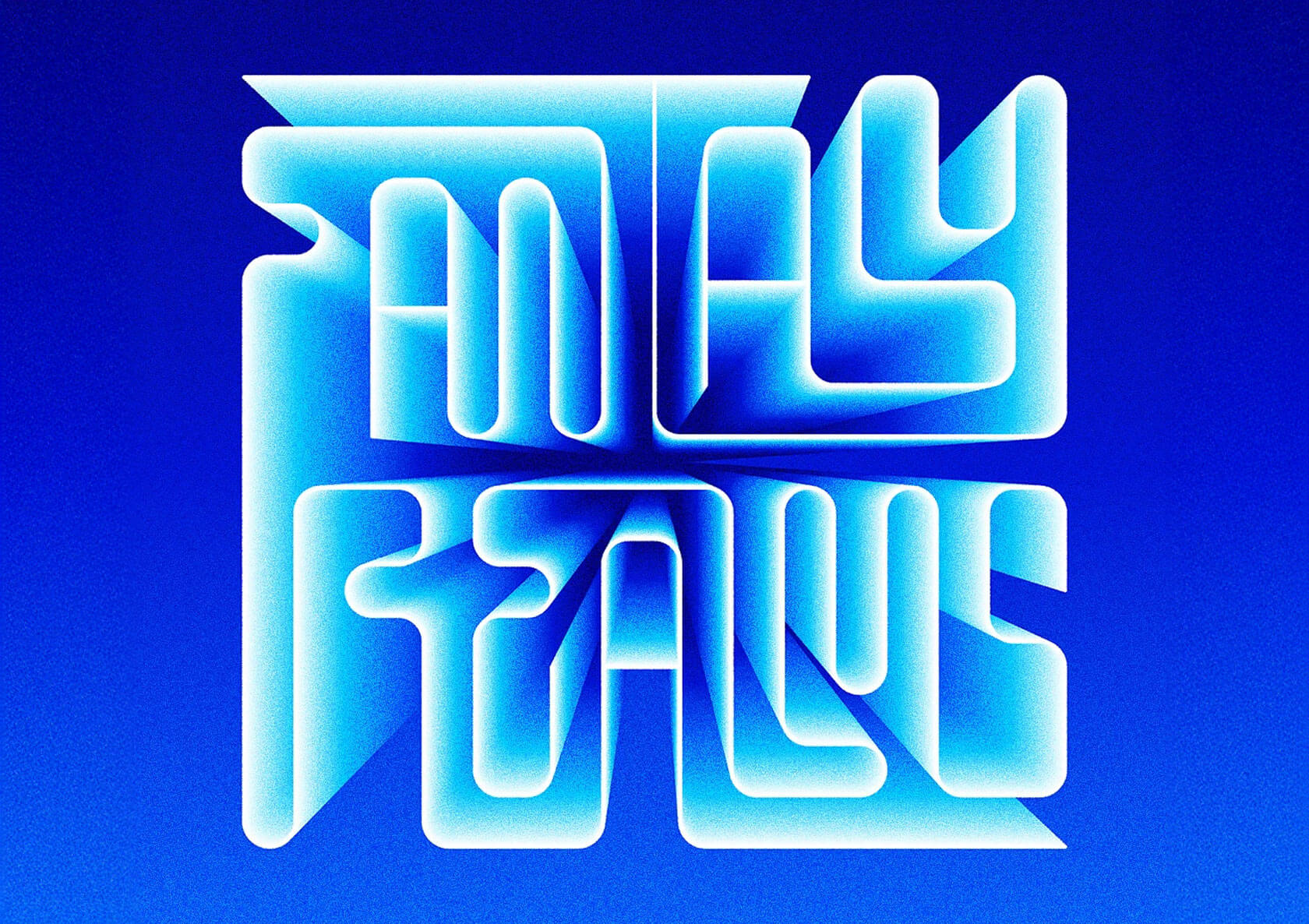 Matt’s ongoing typographic experiments lean into rhythm and structure. Some works bend characters into looping, almost calligraphic paths, while others fracture into sharp, architectural planes. Gradients and grain soften the geometry, and there’s a clever sense of play in how forms connect, overlap and echo across each composition.